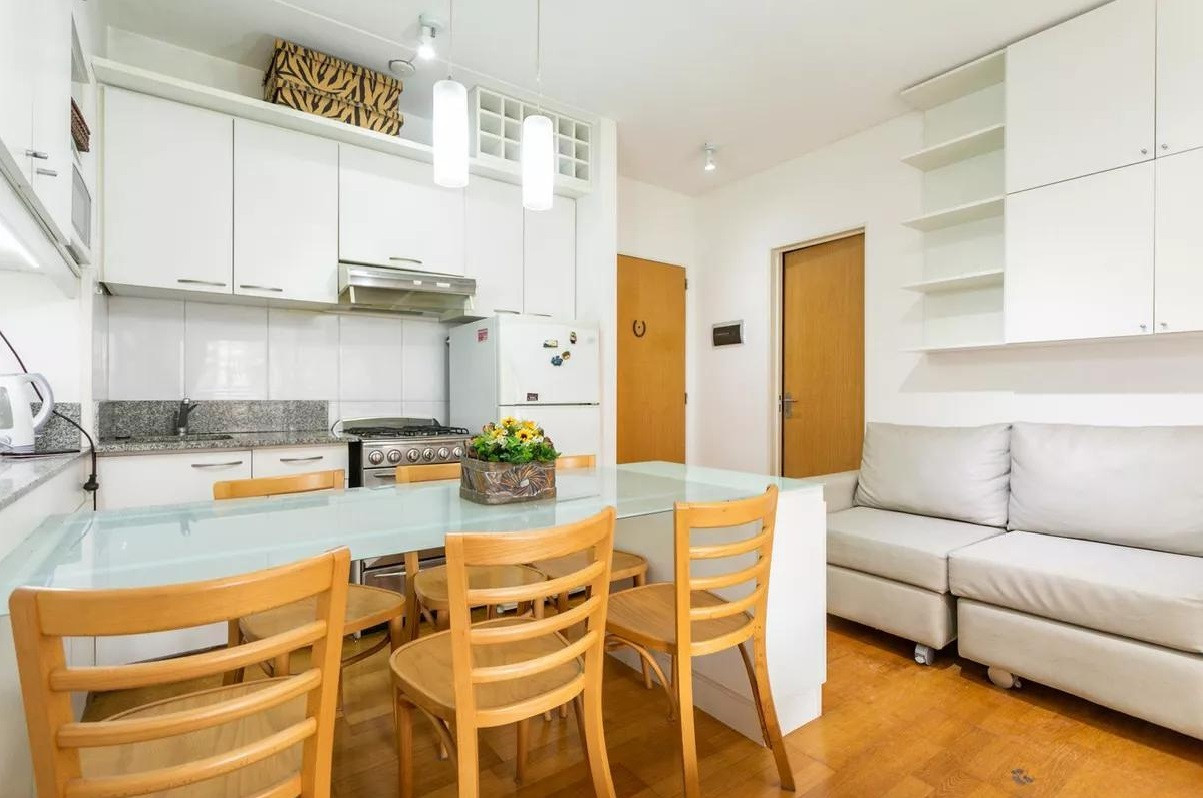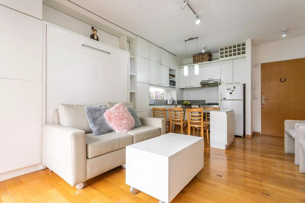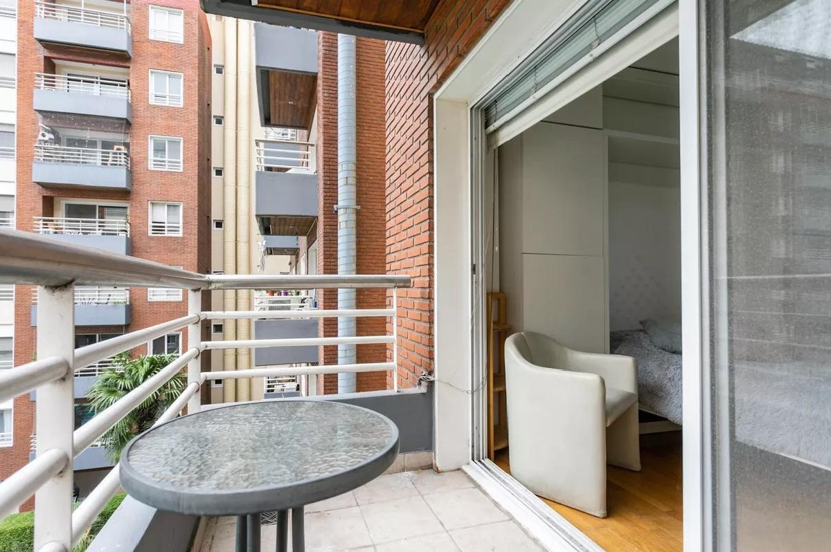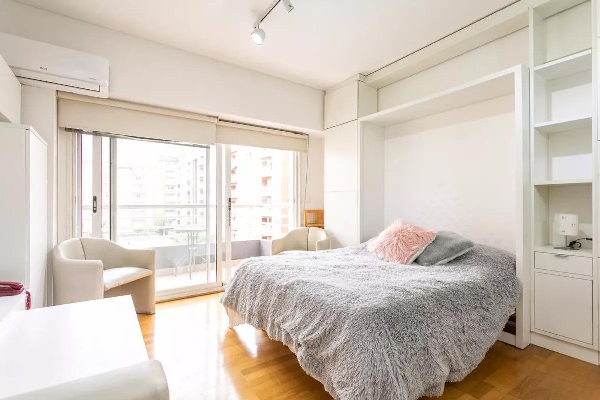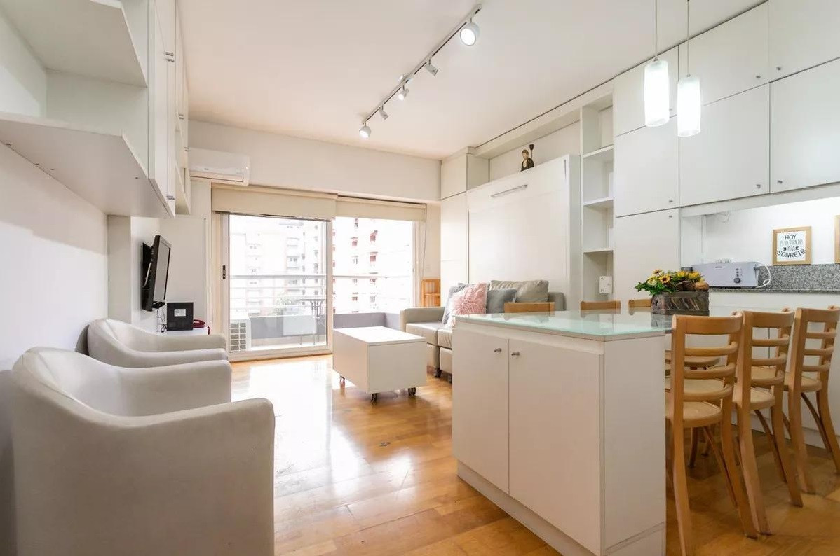 Monoambiente en alquiler en el edificio Terrazas de Puerto Madero. Incluye cama empotrada que se pliega, mesa para 6 personas y espacios de guardado. El balcón da al parque del edificio. El paquete ofrecido indica USD 1.000 e incluye expensas.