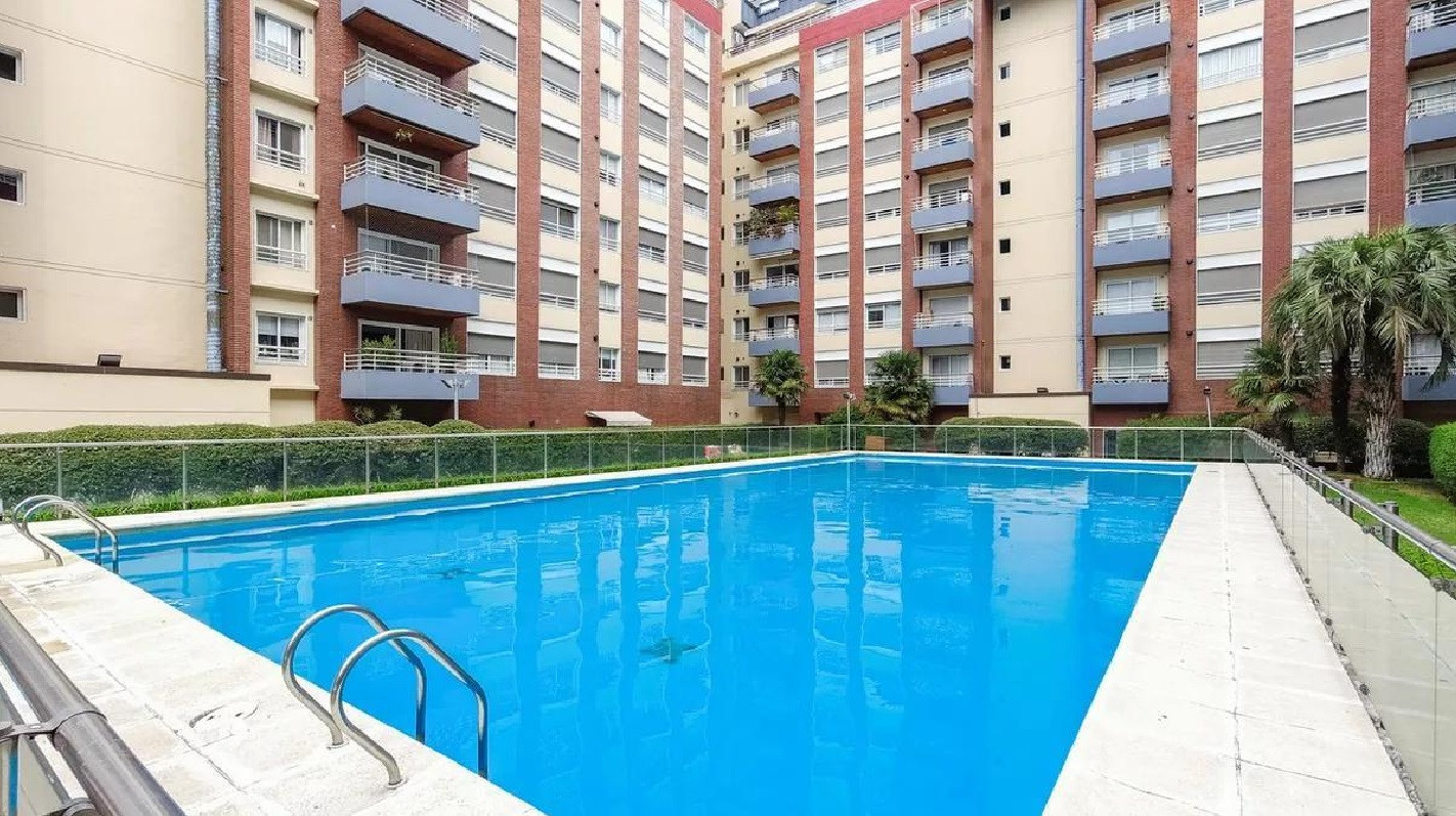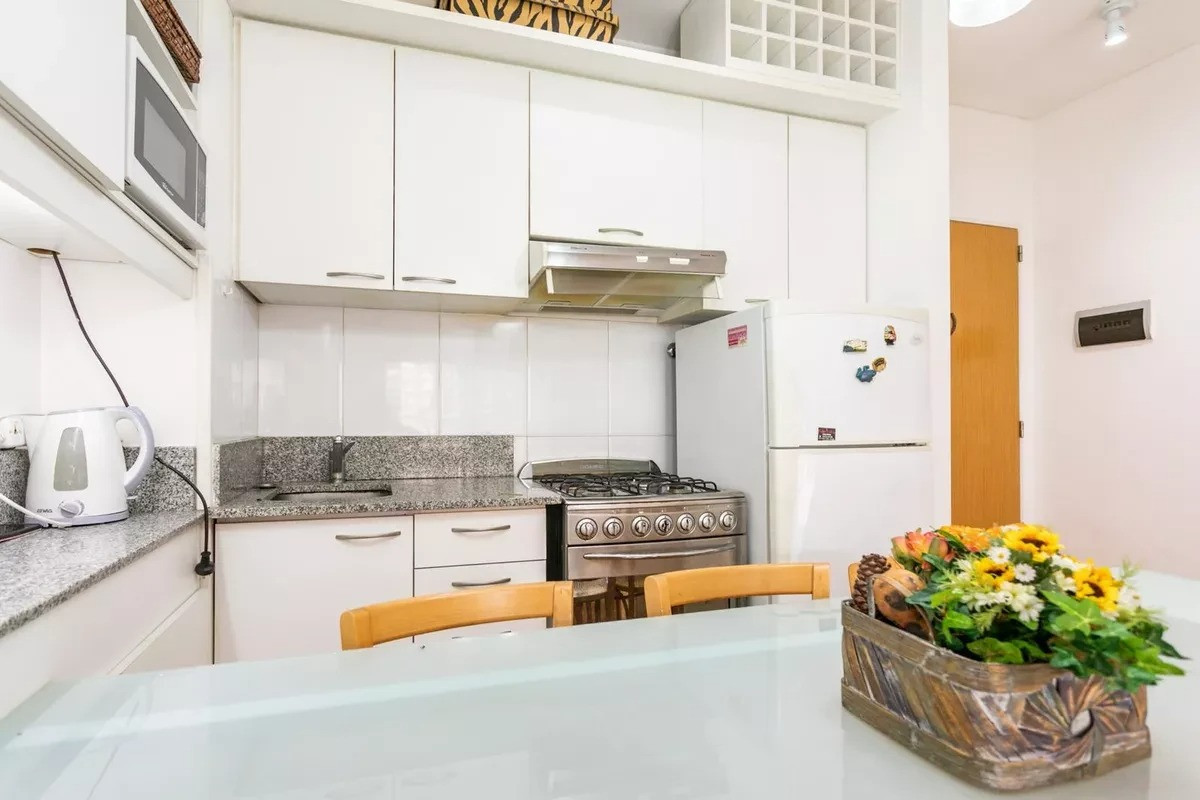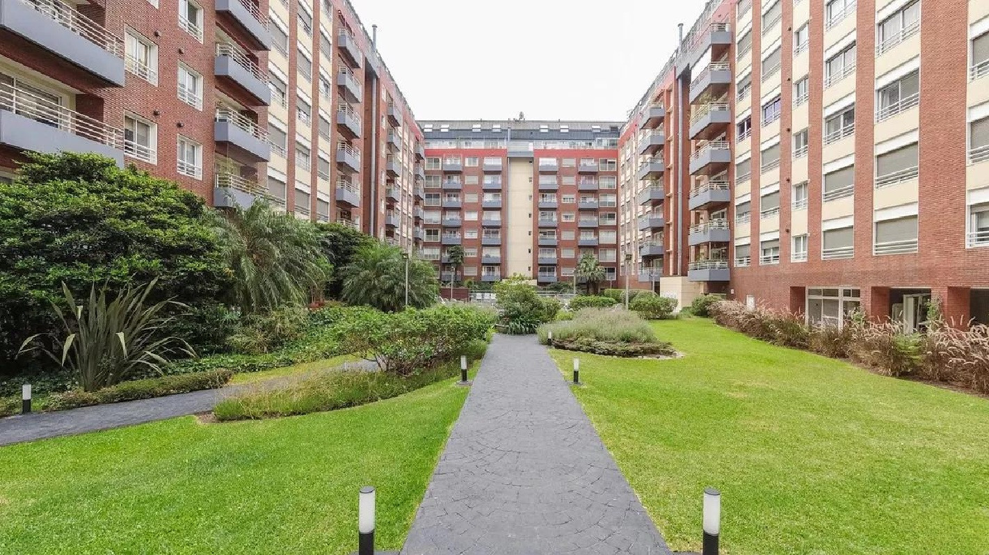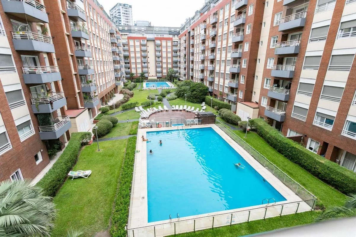 Monoambiente en alquiler en el edificio Terrazas de Puerto Madero. Incluye cama empotrada que se pliega, mesa para 6 personas y espacios de guardado. El balcón da al parque del edificio. El paquete ofrecido indica USD 1.000 e incluye expensas.