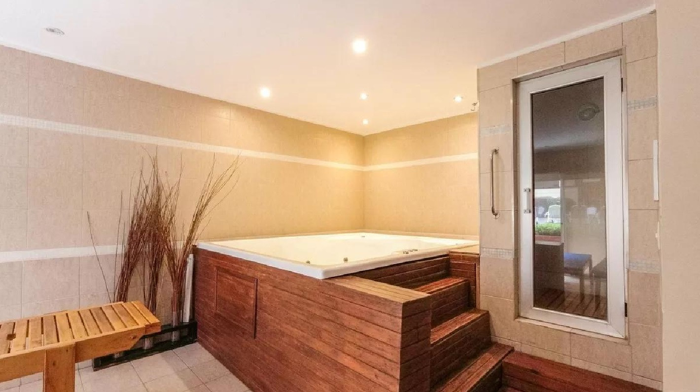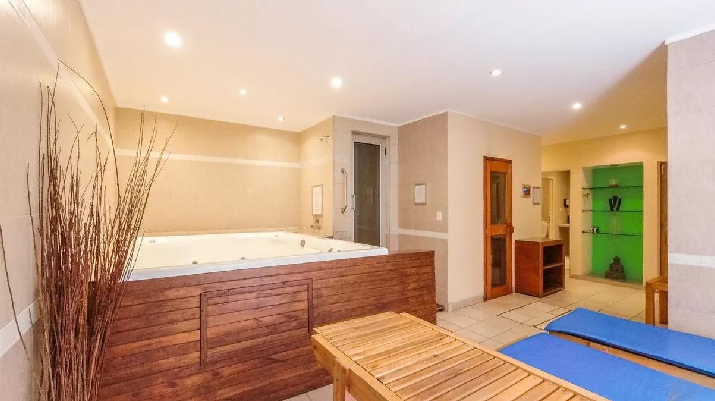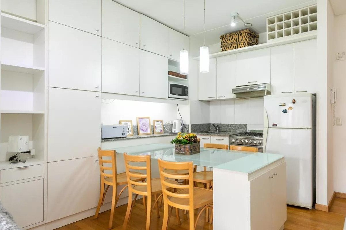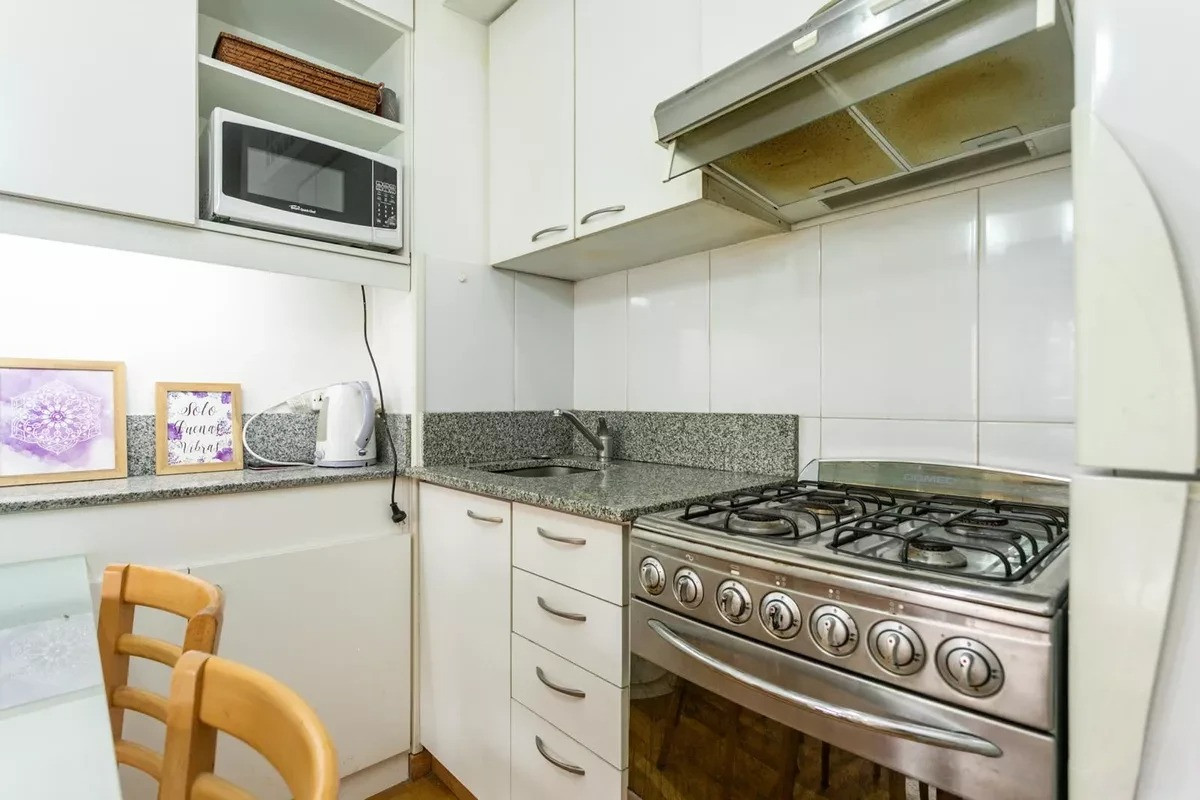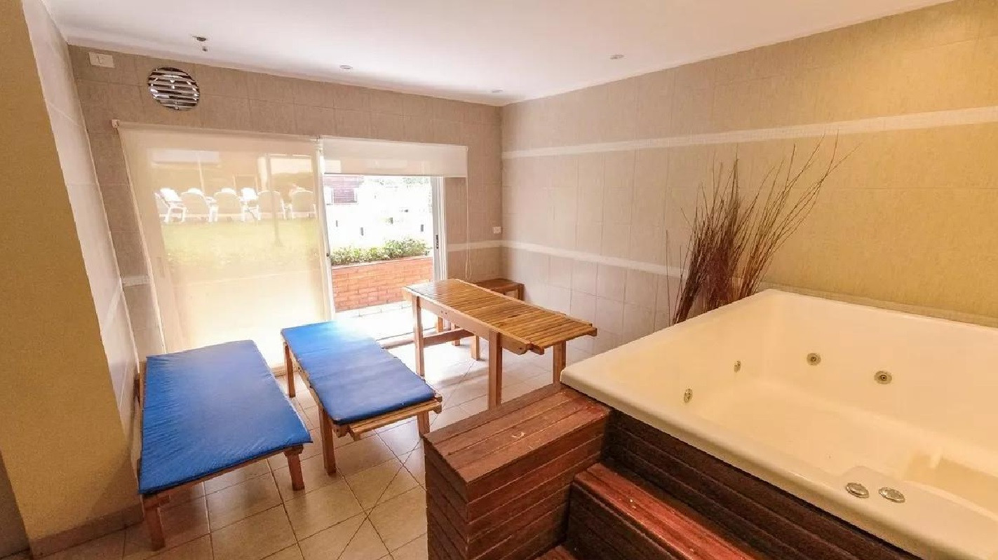 Monoambiente en alquiler en el edificio Terrazas de Puerto Madero. Incluye cama empotrada que se pliega, mesa para 6 personas y espacios de guardado. El balcón da al parque del edificio. El paquete ofrecido indica USD 1.000 e incluye expensas.