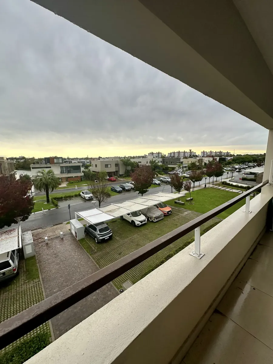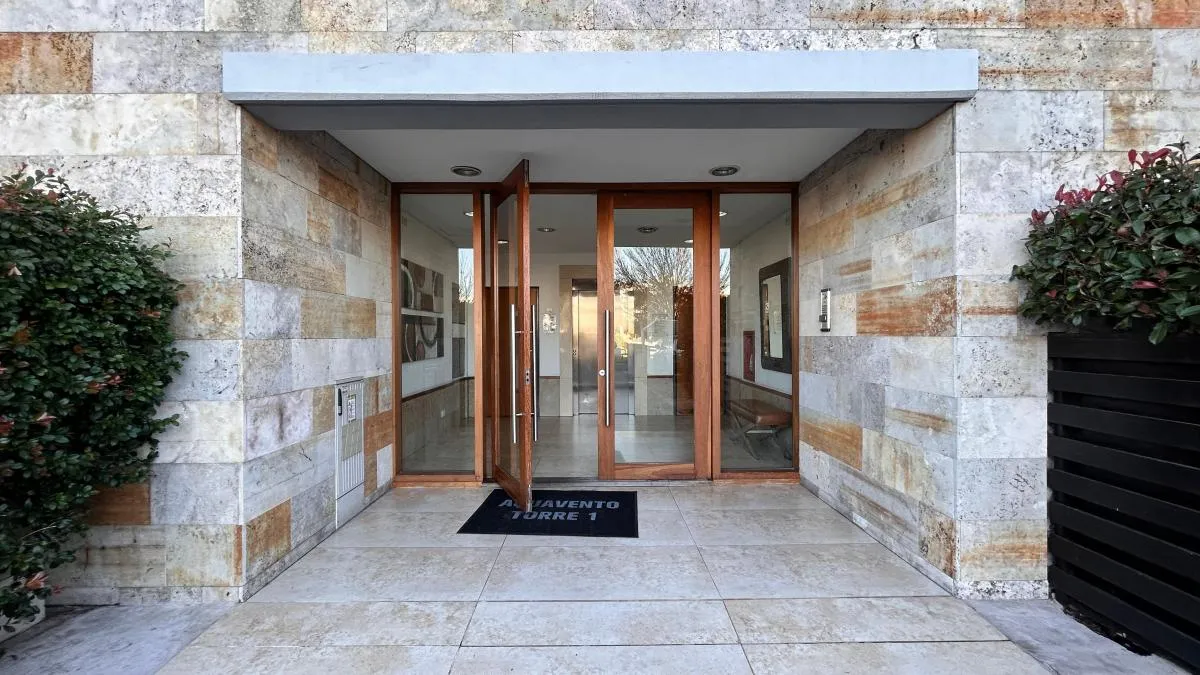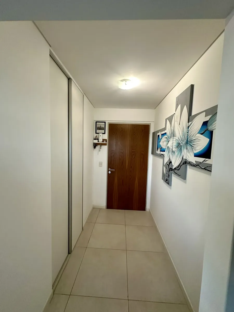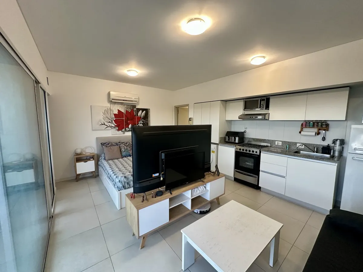 Departamento monoambiente en Torre Aquavento, Nuevo Quilmes. Cuenta con ambiente con ventanales de piso a techo y salida a balcón aterrazado, cocina integrada con mobiliario sobre y bajo mesada de mármol, campana y barra desayunadora con guardado, y sector lavadero cubierto e independiente con conexión para lavarropas. Baño completo con detalles en mármol y receptáculo de ducha. Calefacción por radiadores y agua caliente con caldera dual y termostato individual. Cochera semicubierta frente al in