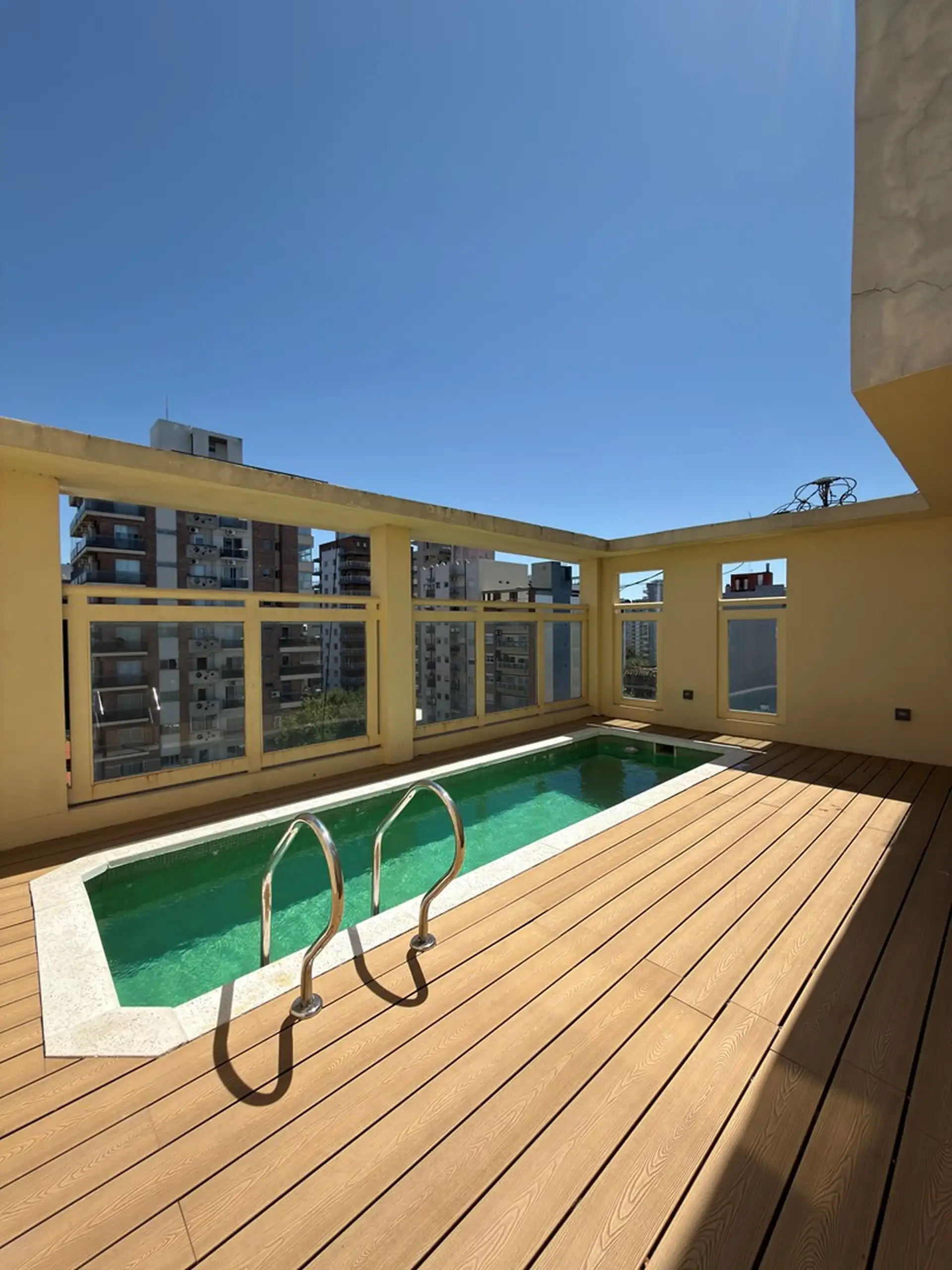Квартира в аренду в Quilmes. Площадь и состояние не указаны. 4-й этаж, окна на улицу. Гостиная-столовая с балконом на улицу, кухня, гостевой туалет, 1 спальня с собственной ванной комнатой. Кондиционер split в гостиной и спальне. Есть прачечная и бассейн. (Закреплённое) парковочное место на первом этаже по описанию. Ежеквартальная корректировка ICL.