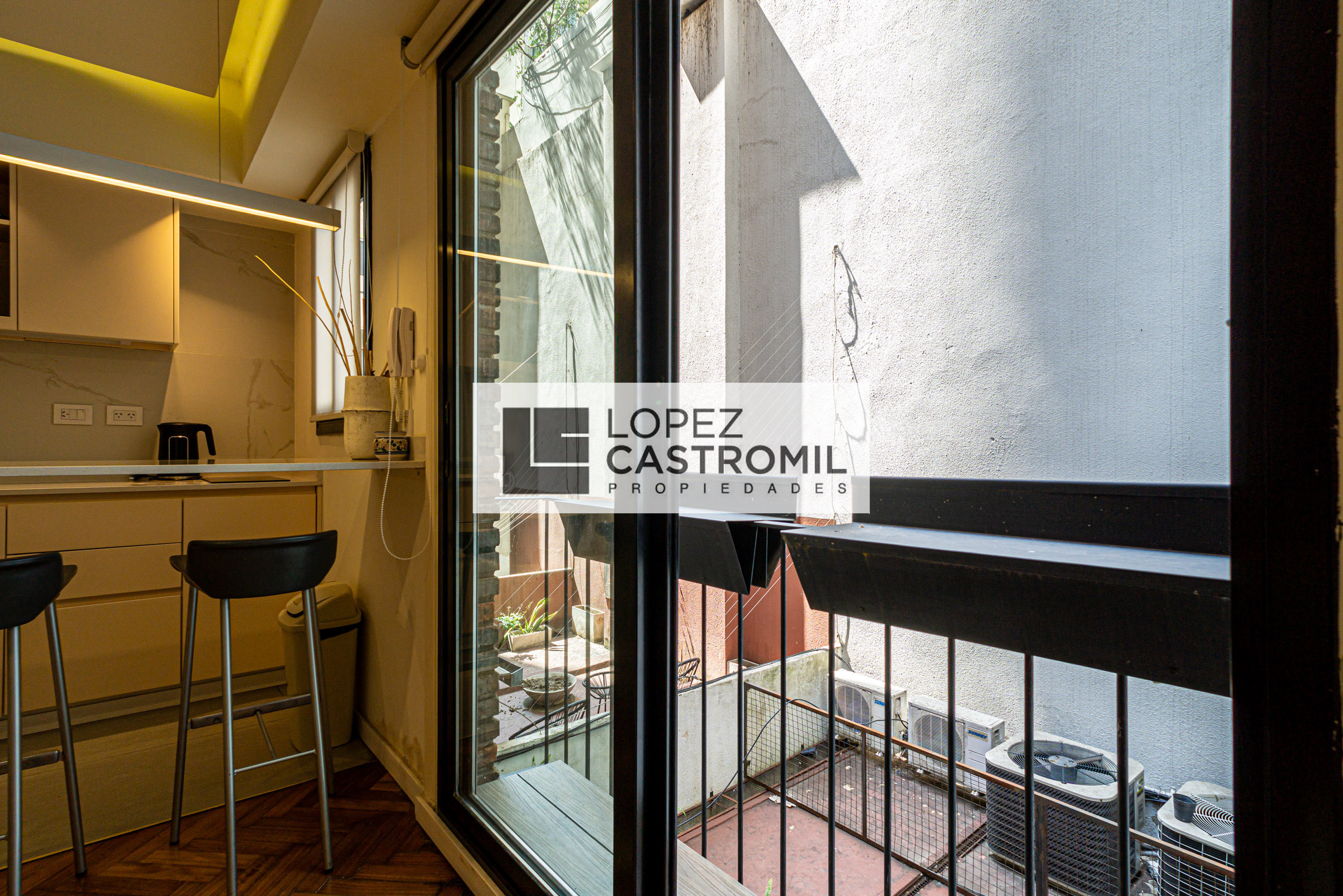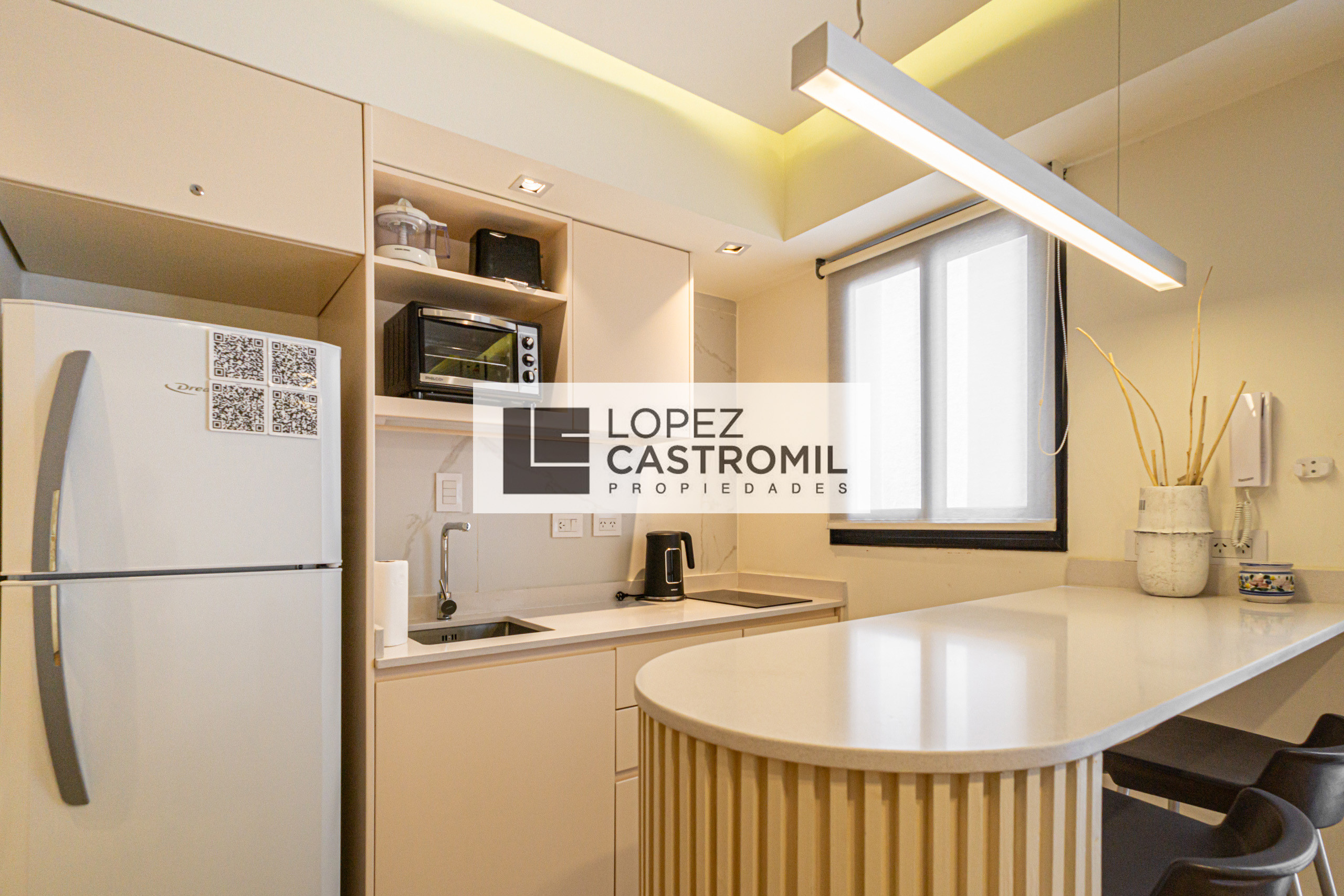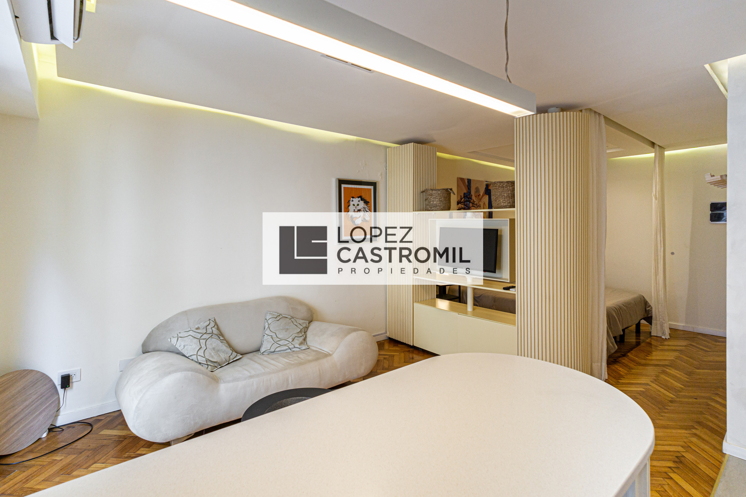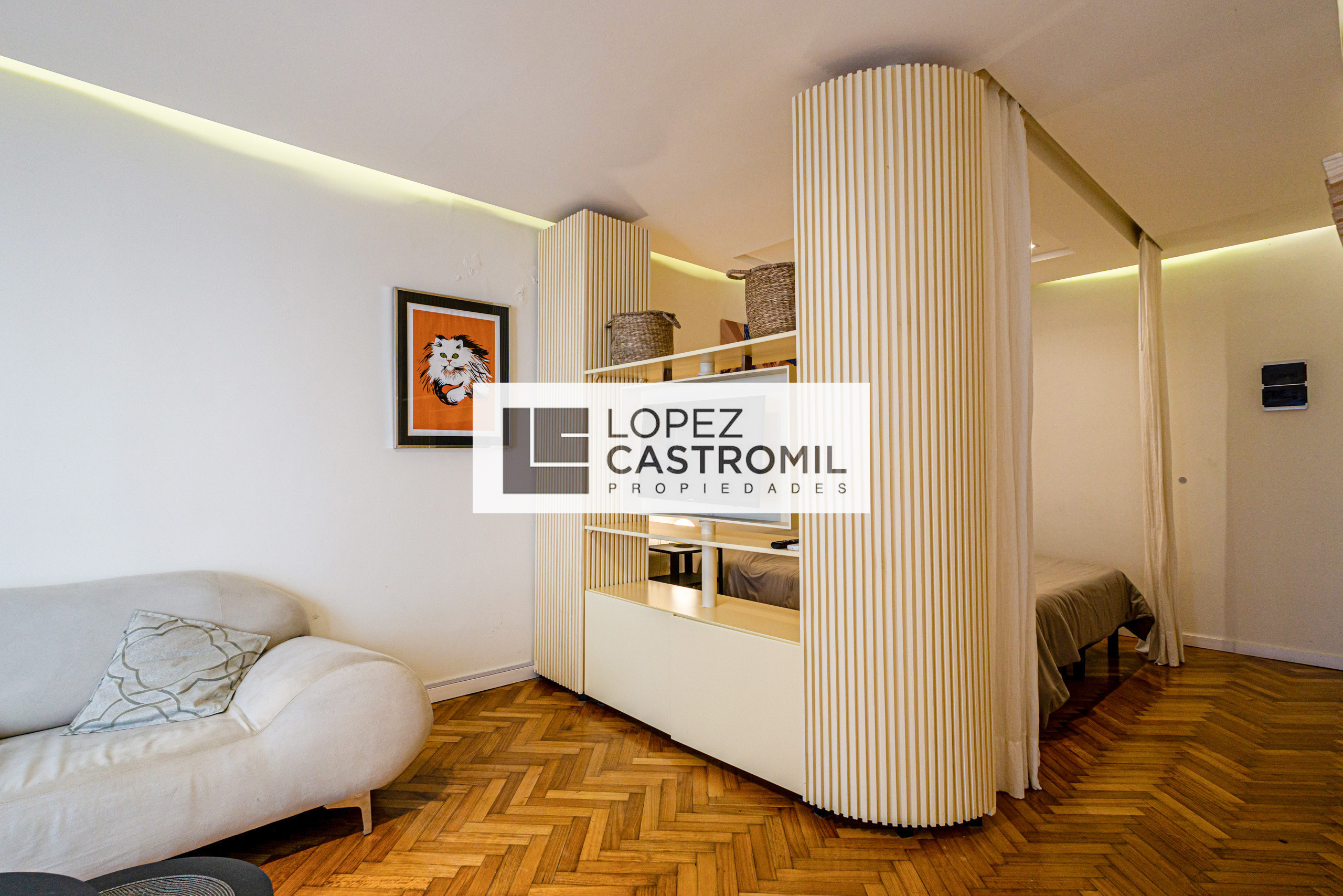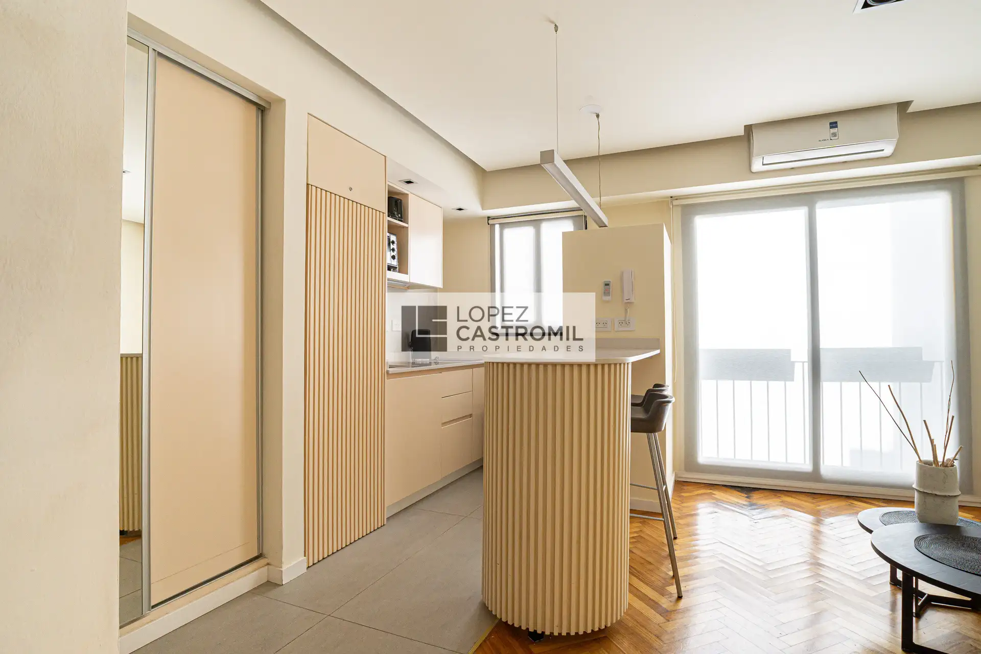 Departamento monoambiente divisible en Retiro. Se alquila amoblado y equipado, con balcón francés. Cocina completa con barra desayunadora y ventilación natural, baño completo con ventilación natural y placard. Incluye split frío-calor, cortinas roller, lavarropas y cerramientos de aluminio. Apto profesional y con encargado en el edificio. La propiedad no tiene acceso para personas con movilidad reducida.