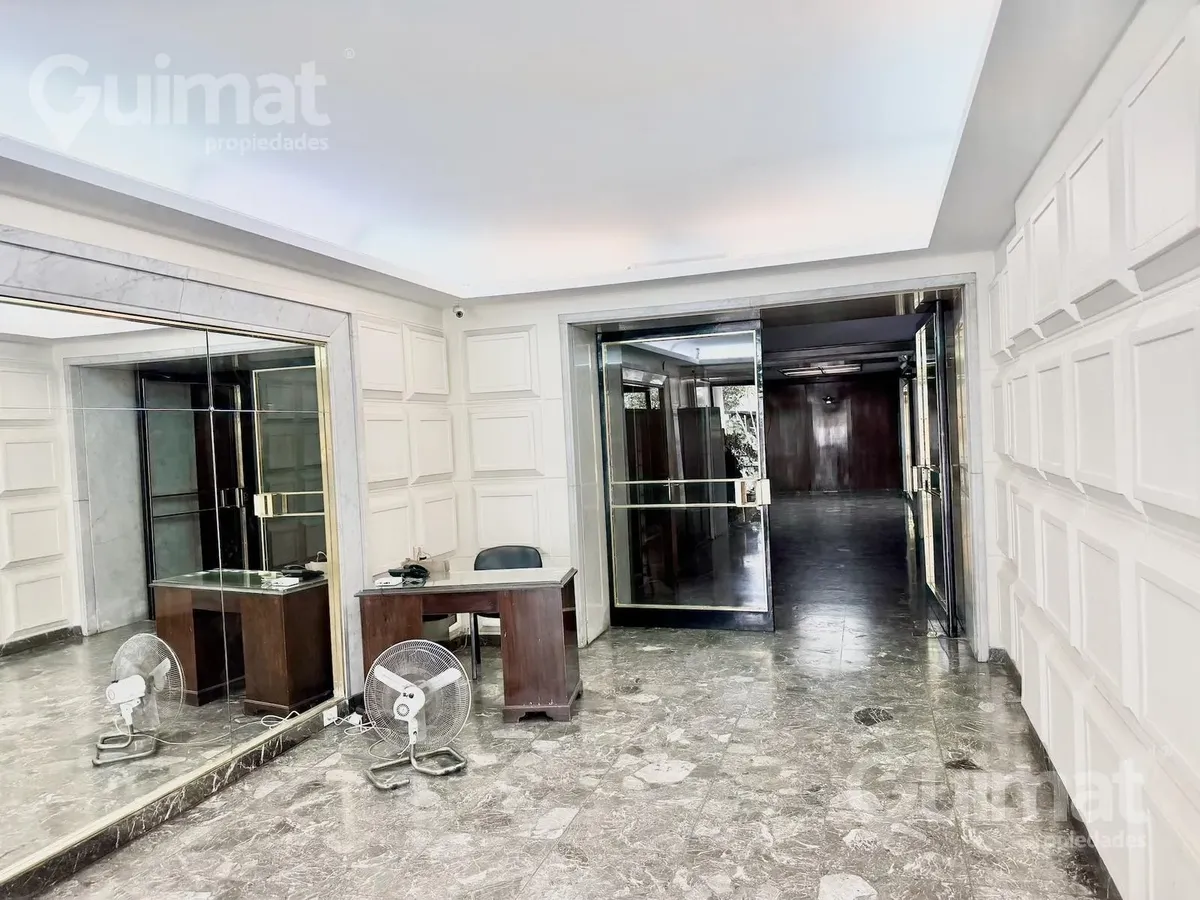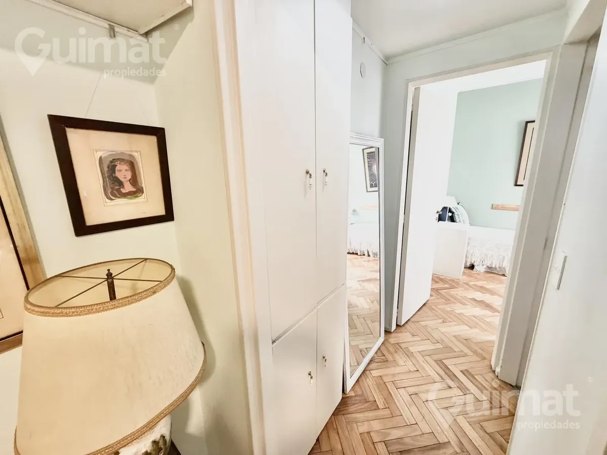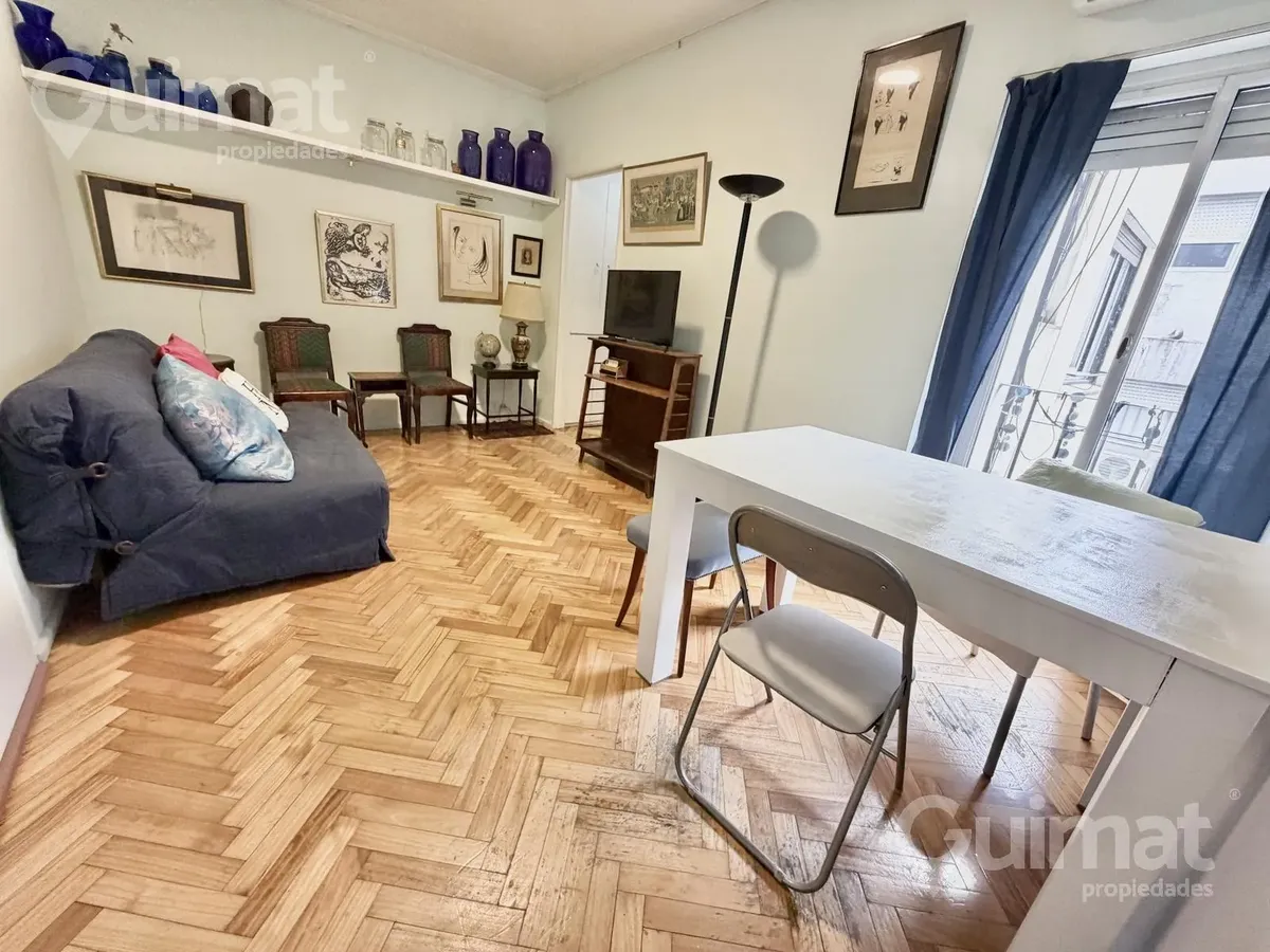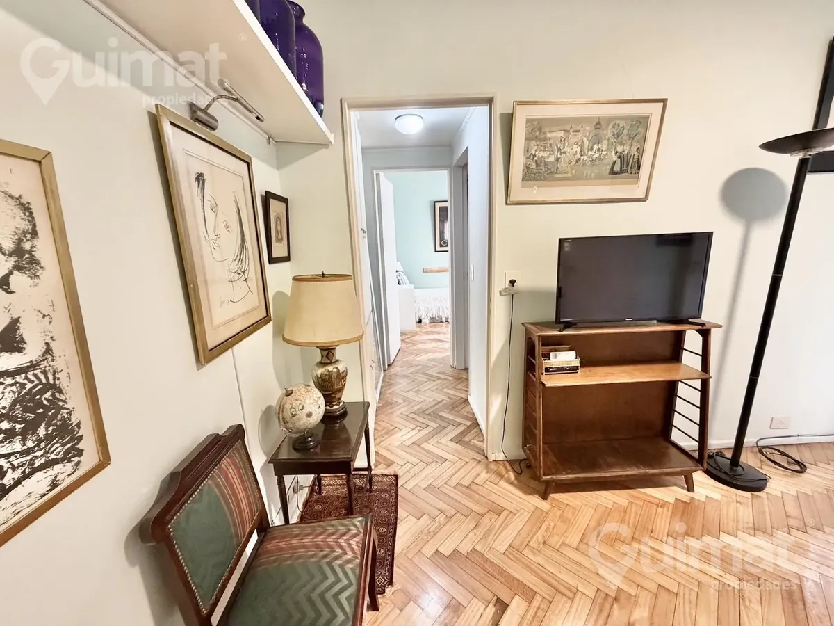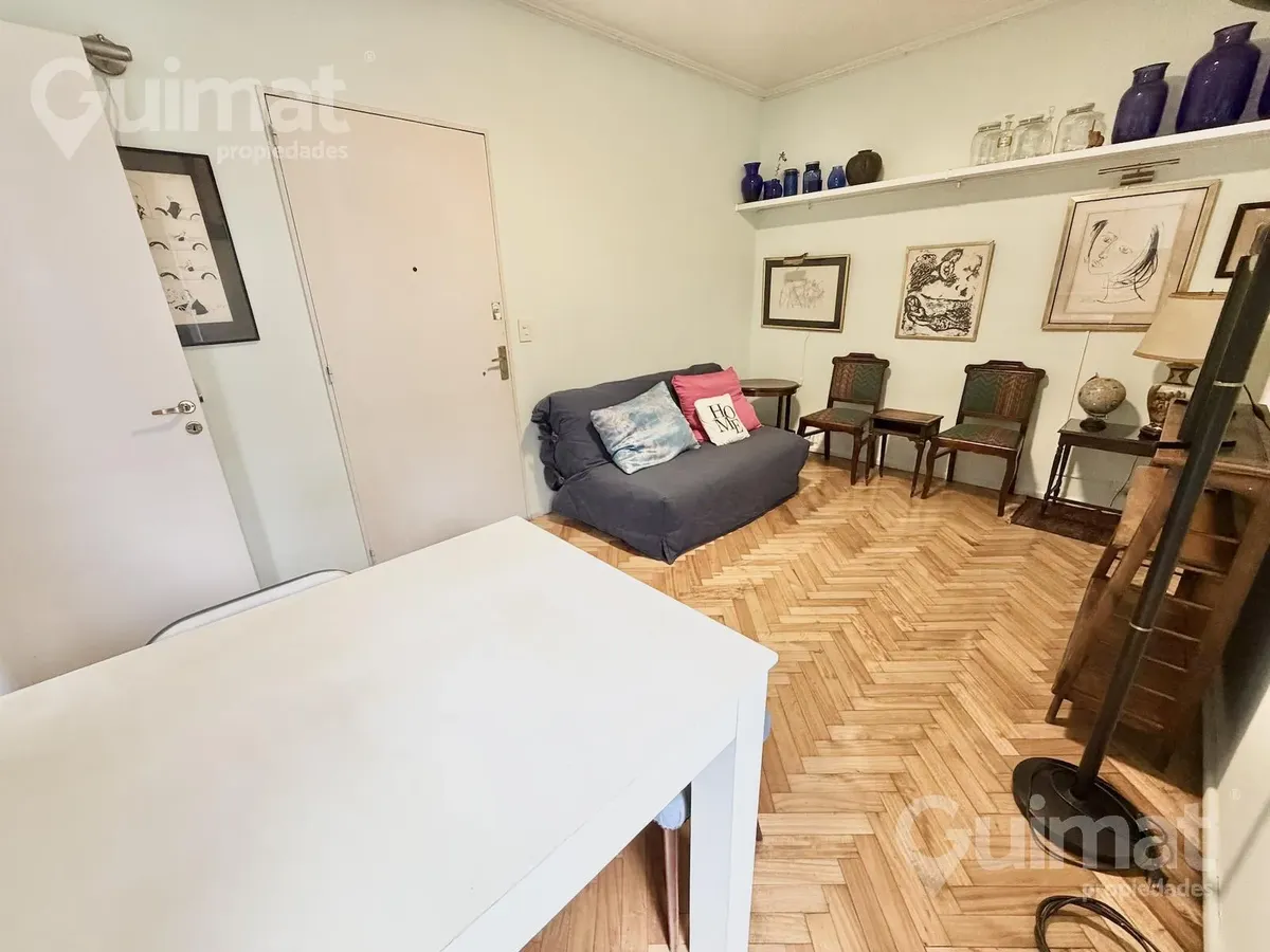 Departamento de 2 ambientes amoblado y equipado, con 1 dormitorio, en el 9° piso. Al frente, con balcón francés; living-comedor con pisos de parquet y split frío/calor. Cocina aparte con pasaplatos, muebles sobre y bajo mesada, cocina a gas natural y termotanque a gas natural; hall de distribución con placard; dormitorio con pisos de parquet y placard; baño con mesada y bacha. El edificio tiene 3 ascensores, seguridad con totem y doble puerta, y 2 encargados por día.