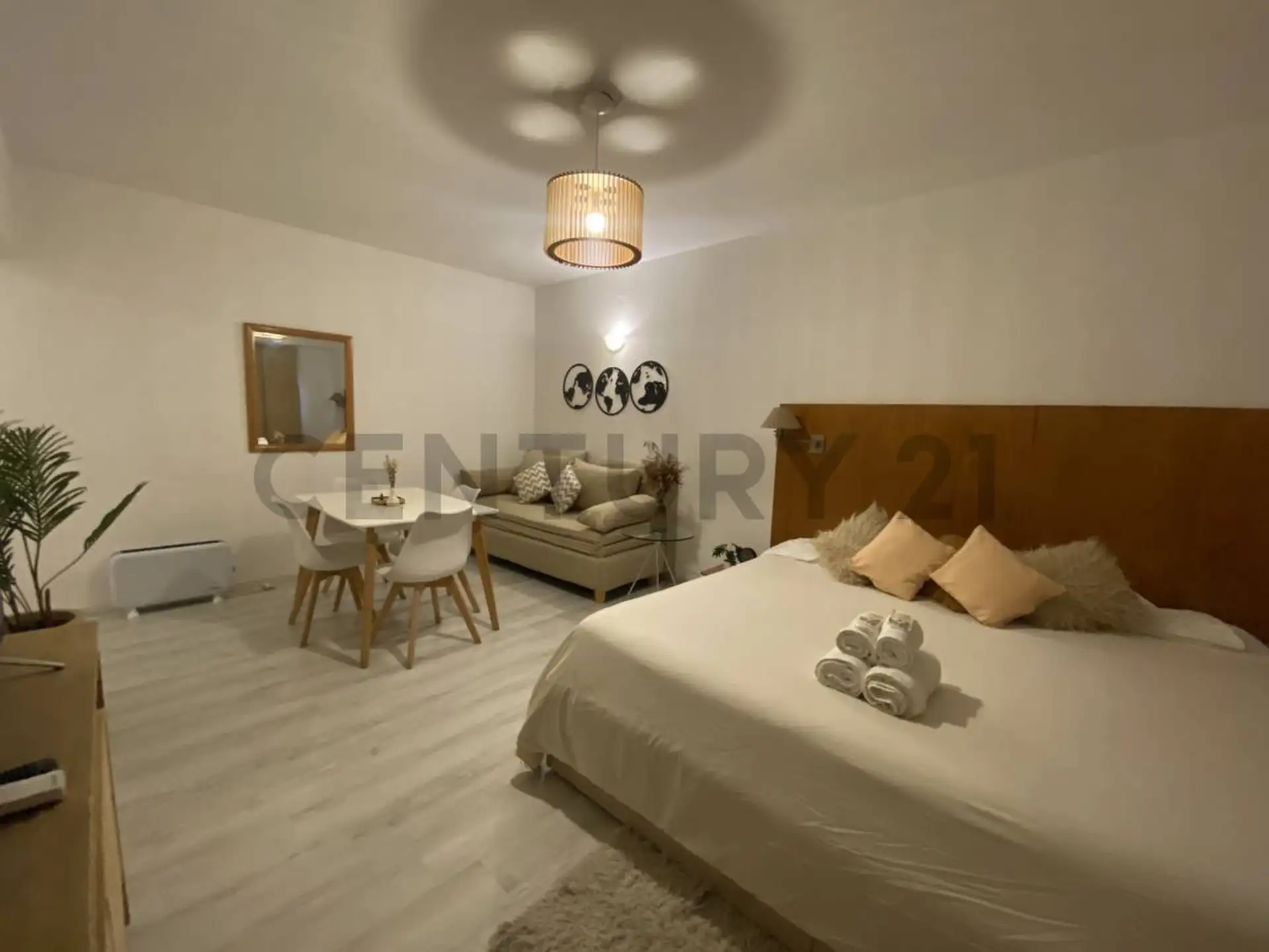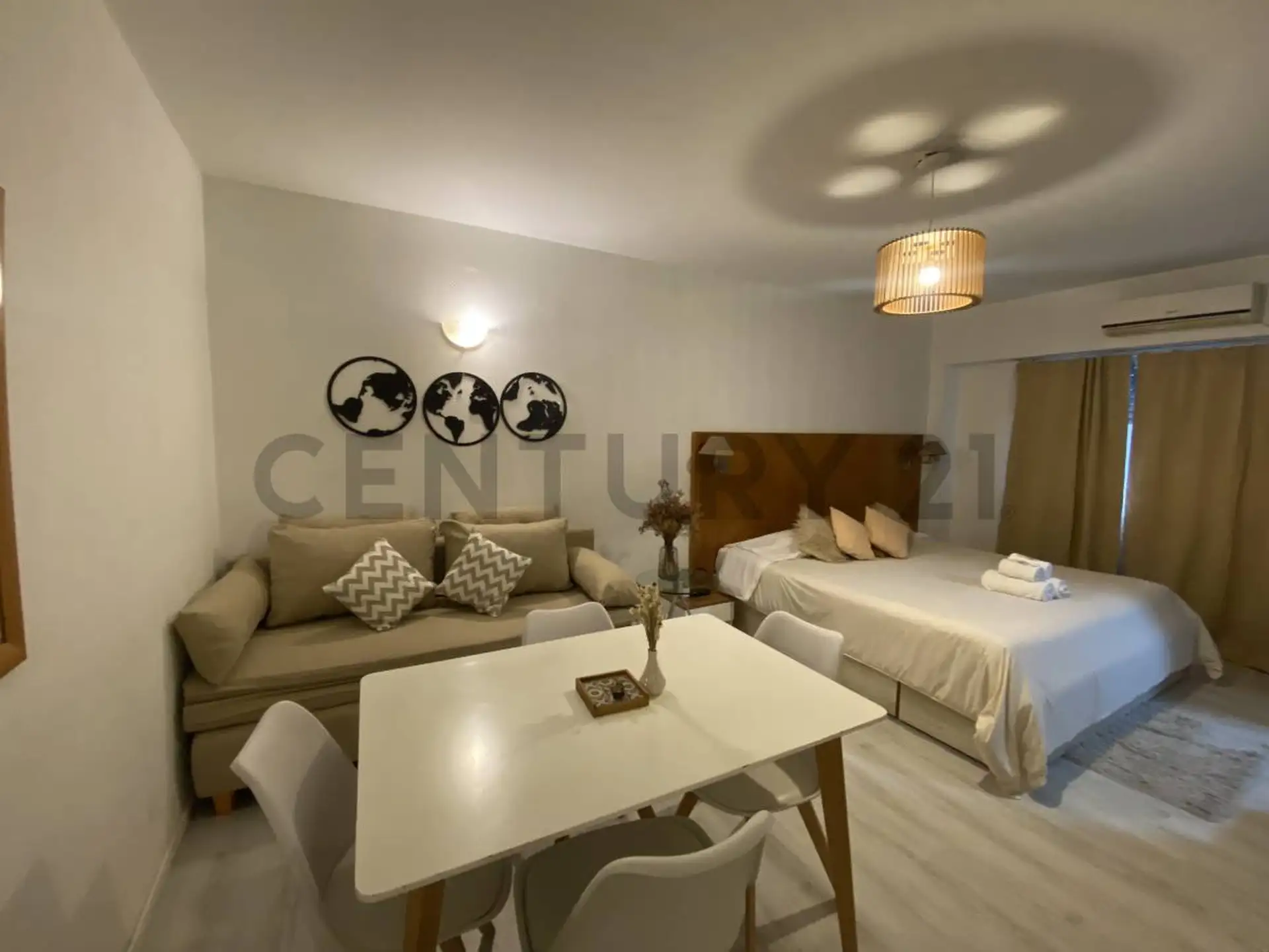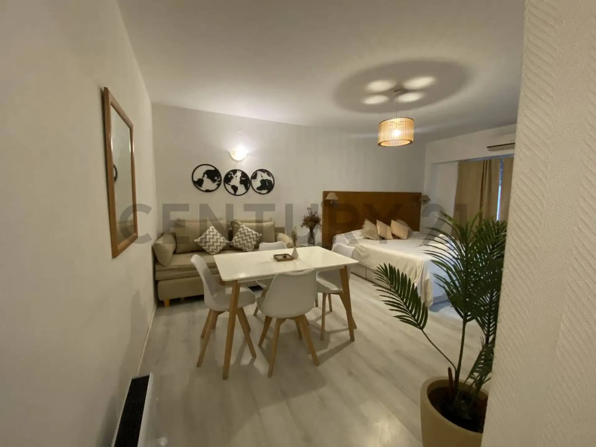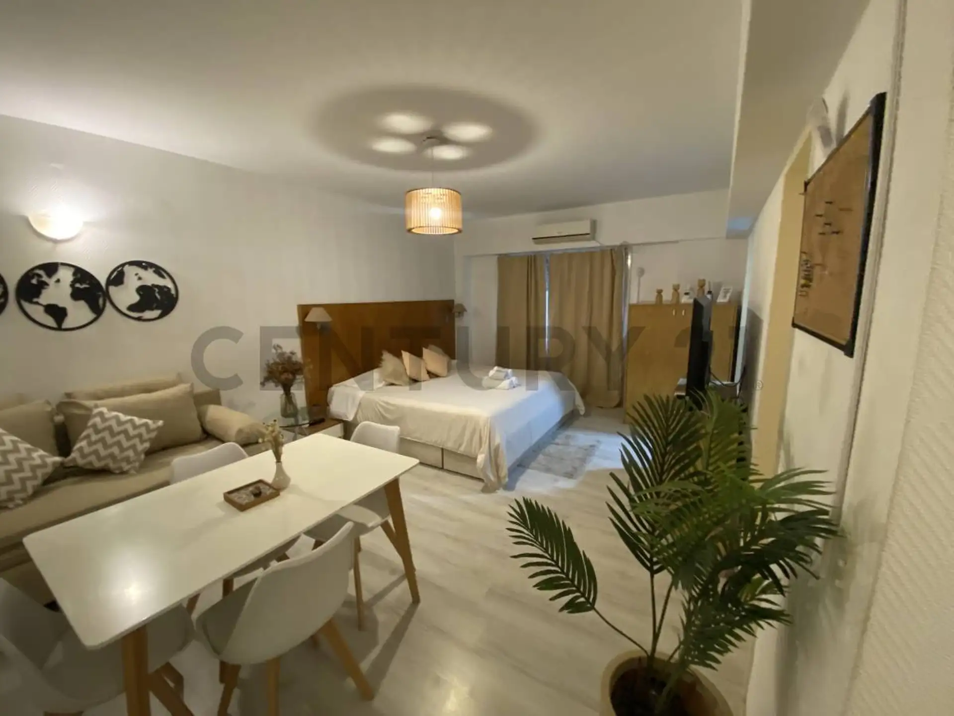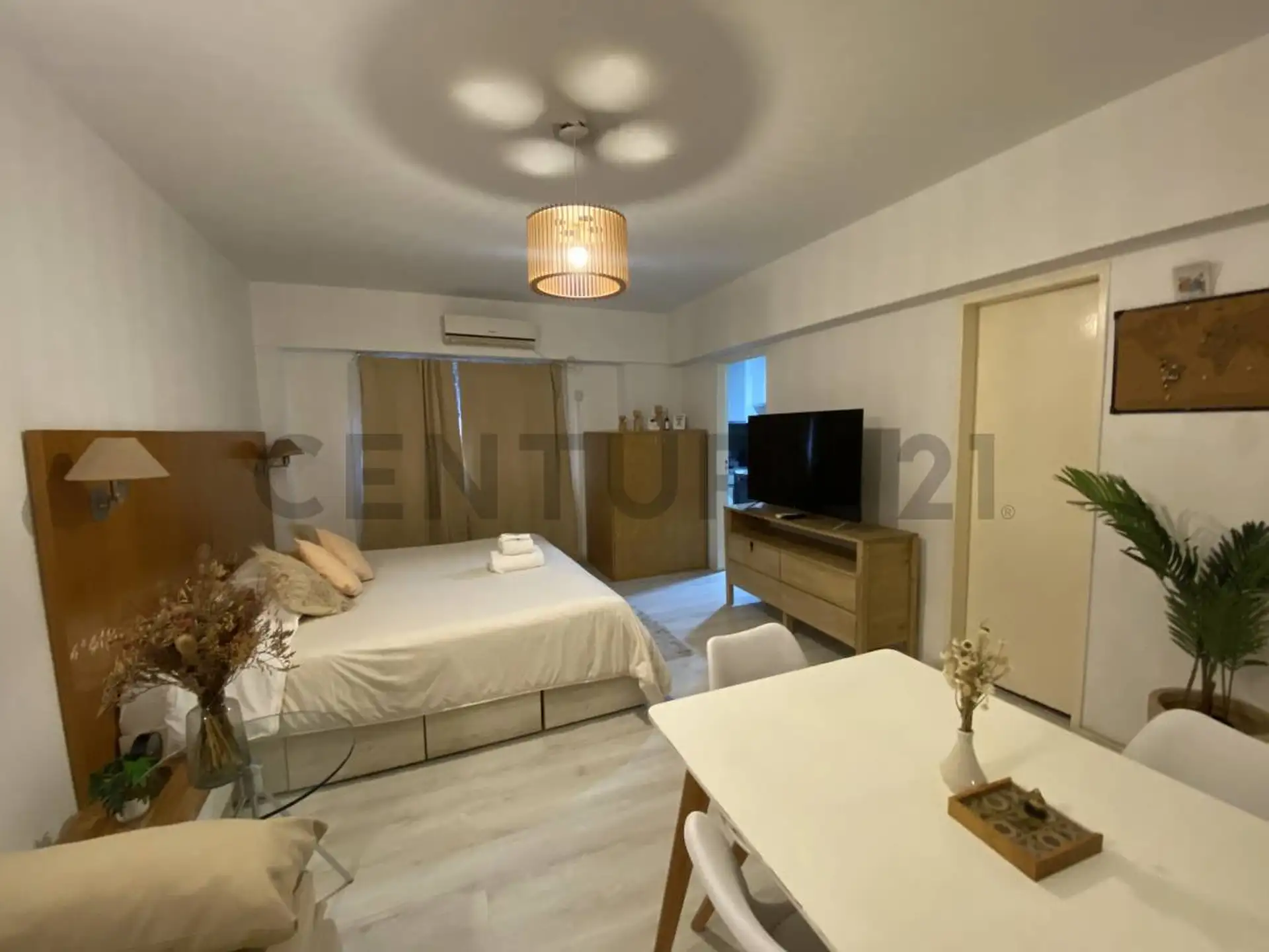 Monoambiente de alquiler temporario en Retiro, en Esmeralda al 900, CABA. Se alquila totalmente amoblado y equipado, con cocina separada, aire acondicionado, televisión y caloventor. Incluye heladera, horno eléctrico, microondas, pava eléctrica y tostadora, además de módem o router Wi‑Fi. El alquiler mensual es USD 550 más expensas.