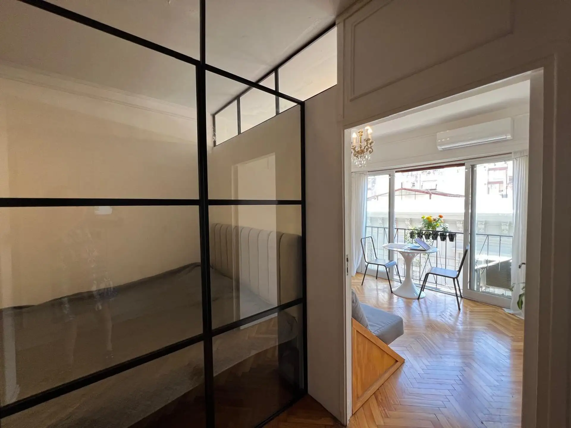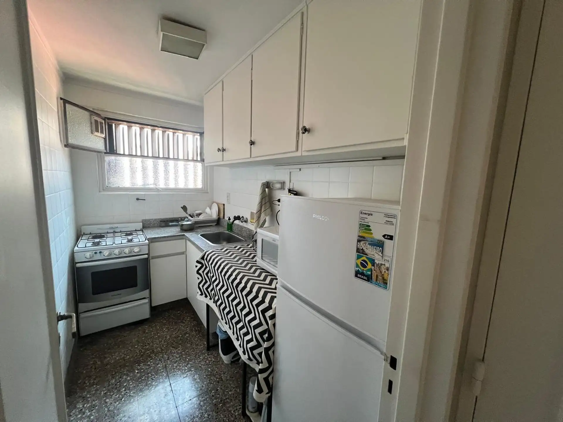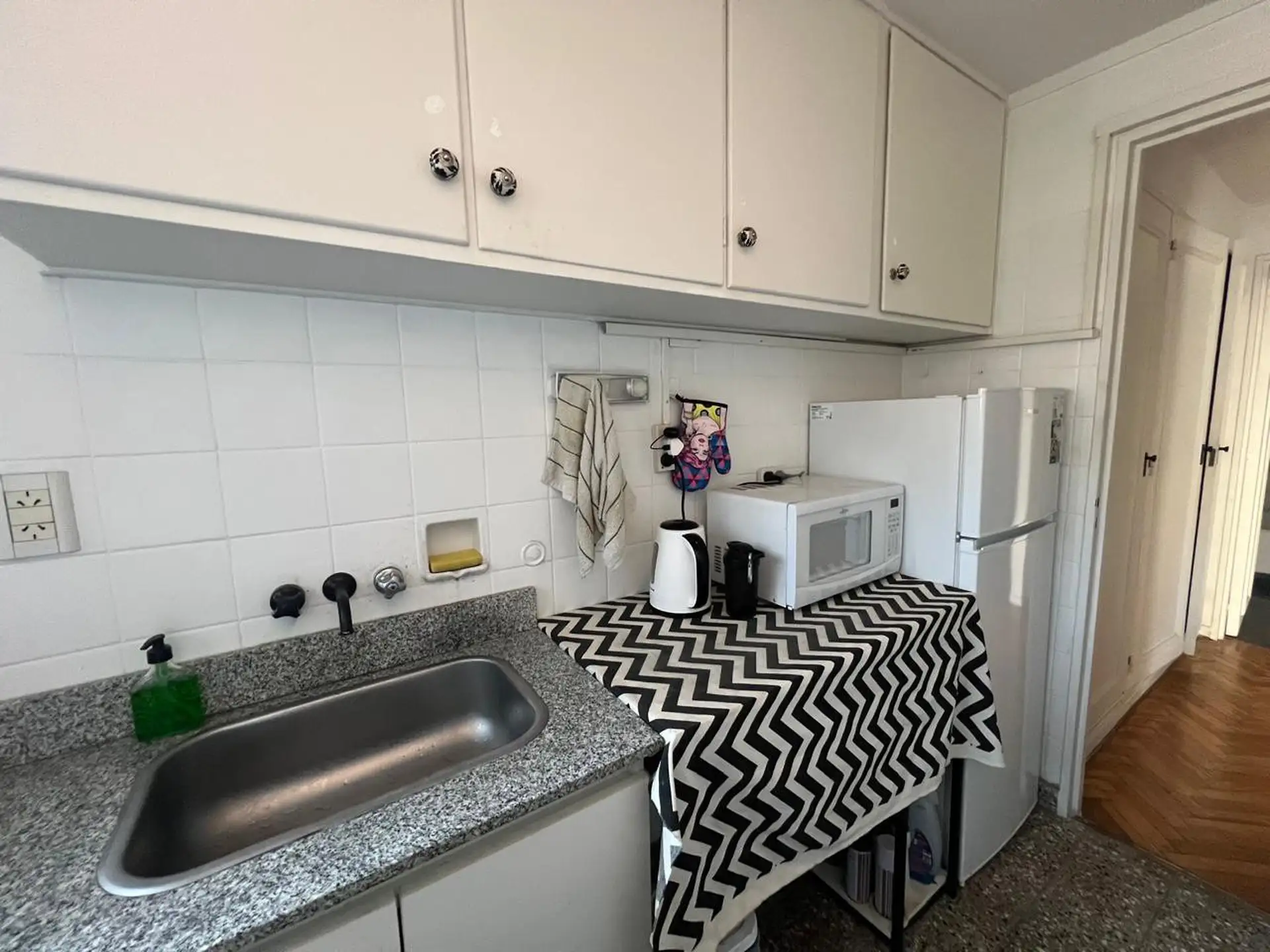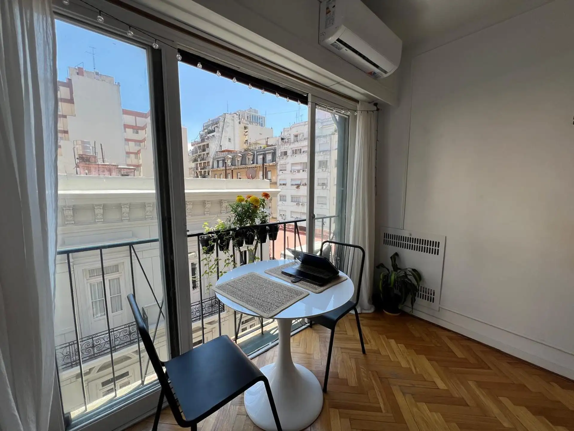 Monoambiente dividido en 2 ambientes en Retiro, al frente, con balcón francés. Se entrega amoblado y equipado con sofá cama, mesa y dos sillas, espejo y aire acondicionado frío-calor. La cocina es independiente con ventana al frente e incluye heladera con freezer, microondas y pava eléctrica, y el baño completo tiene bañera y bidet.