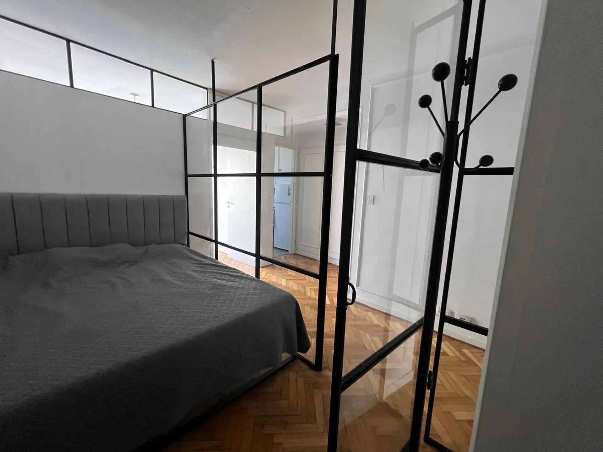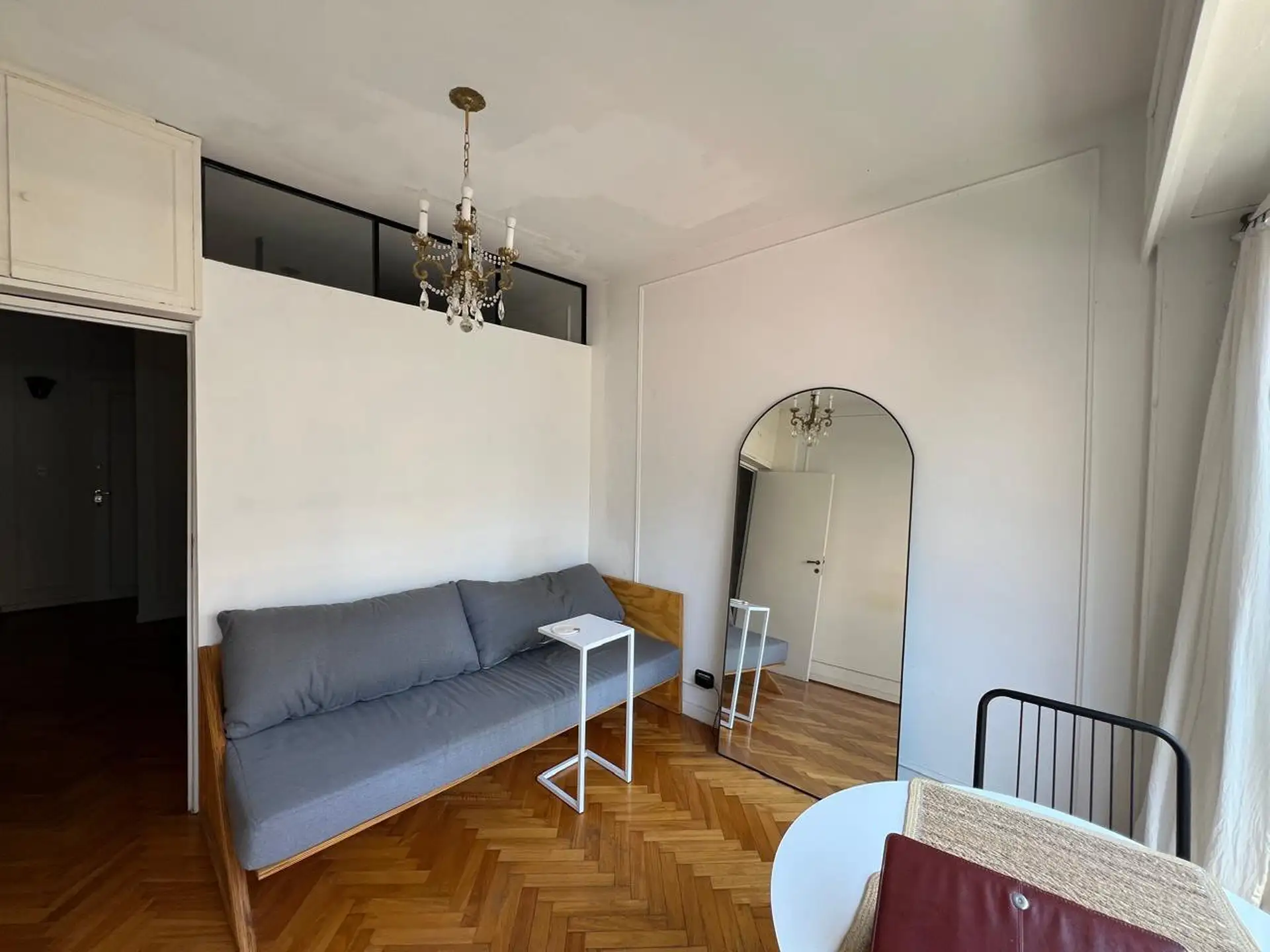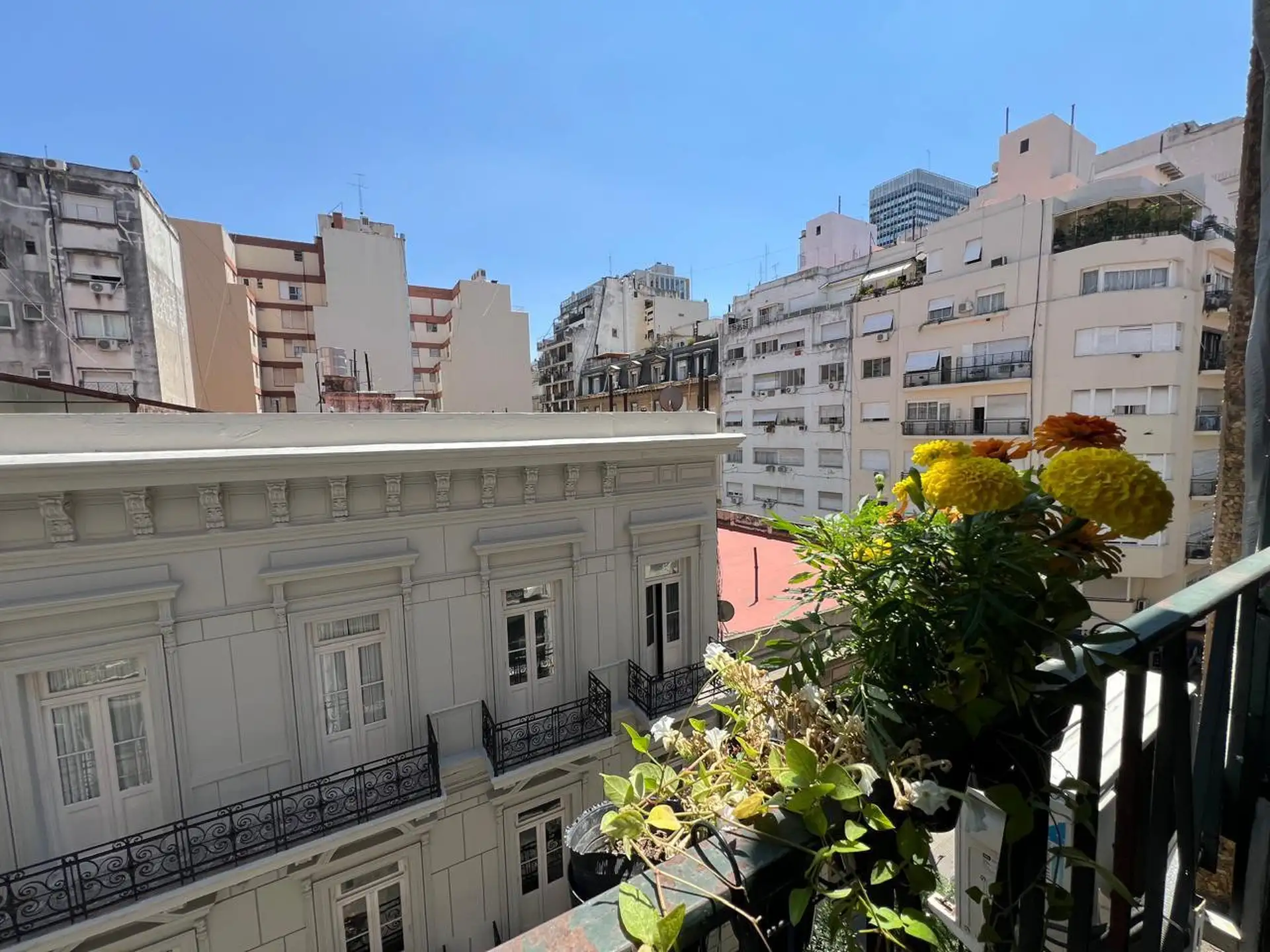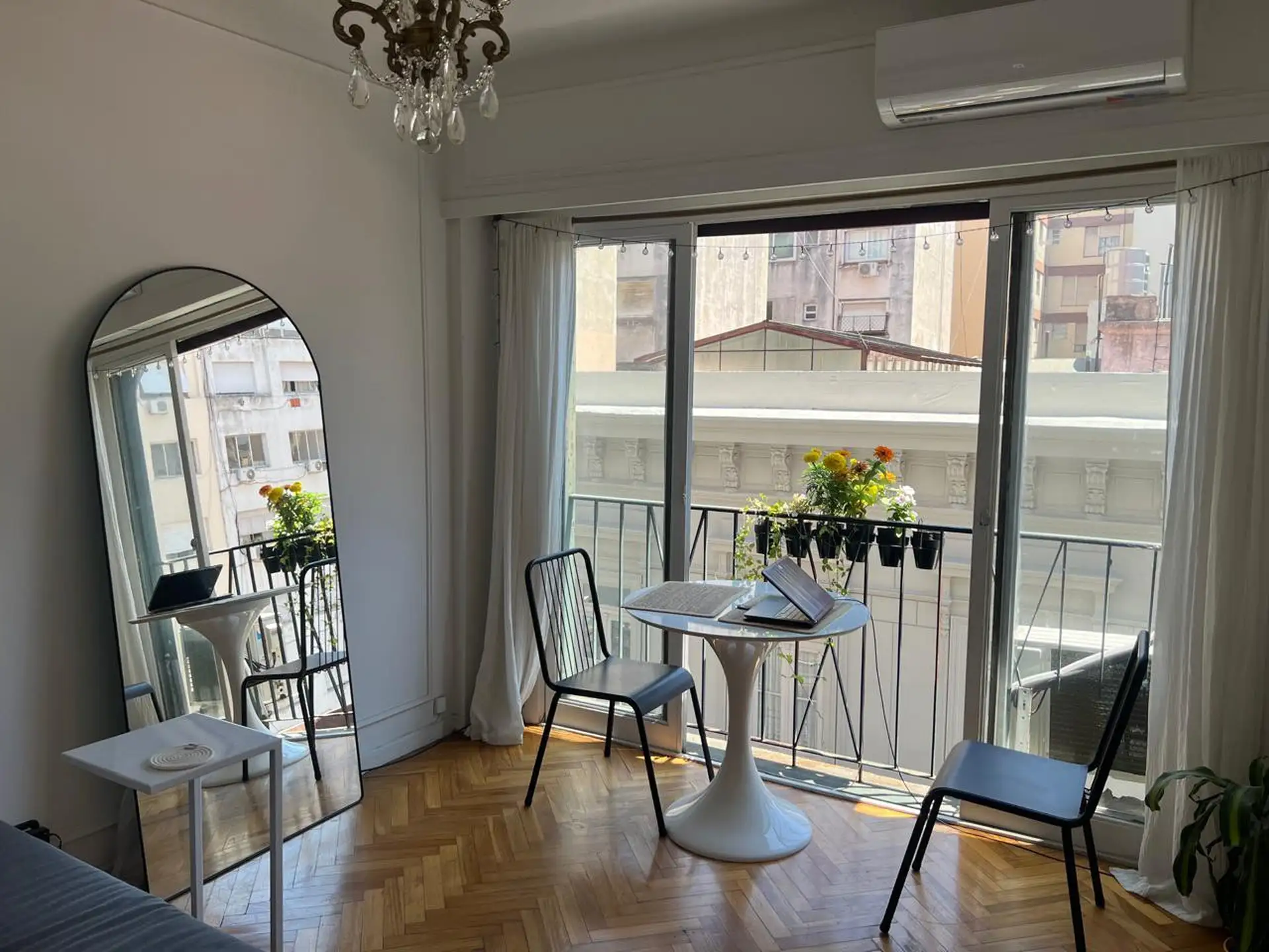 Monoambiente dividido en 2 ambientes en Retiro, al frente, con balcón francés. Se entrega amoblado y equipado con sofá cama, mesa y dos sillas, espejo y aire acondicionado frío-calor. La cocina es independiente con ventana al frente e incluye heladera con freezer, microondas y pava eléctrica, y el baño completo tiene bañera y bidet.