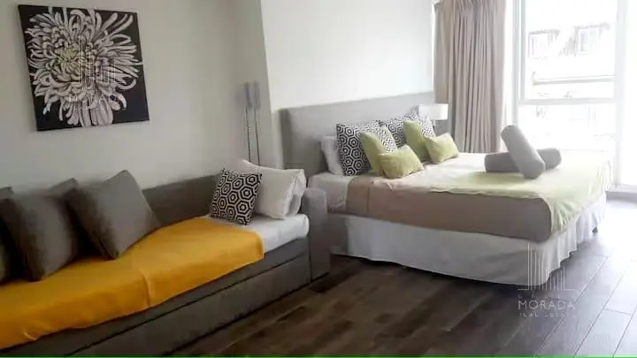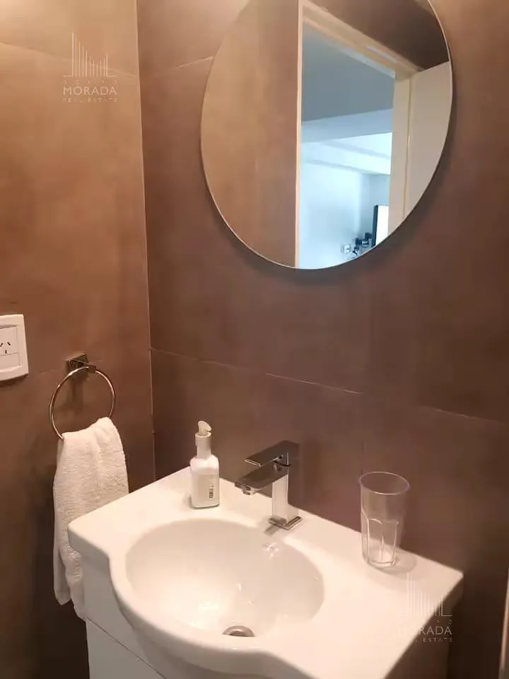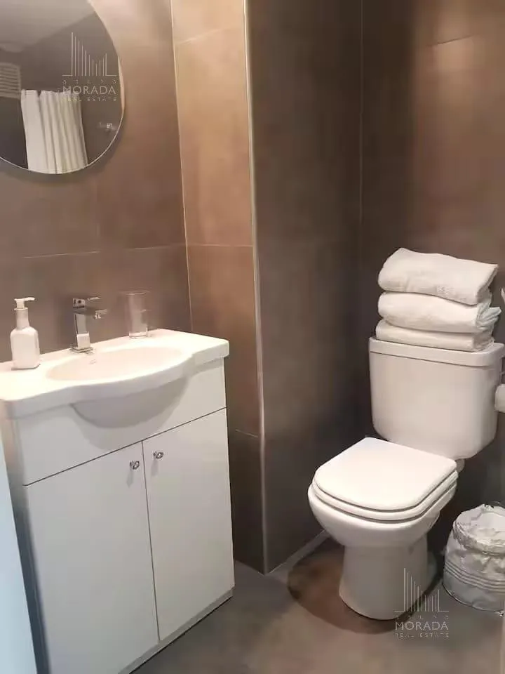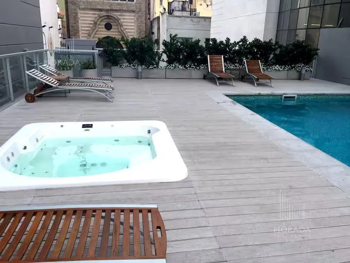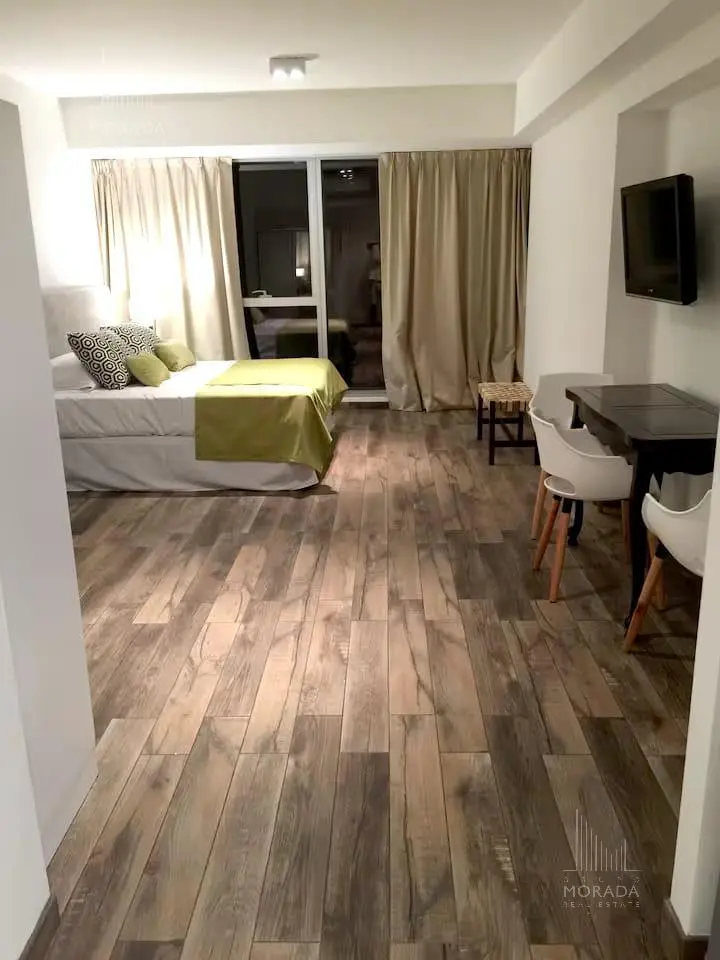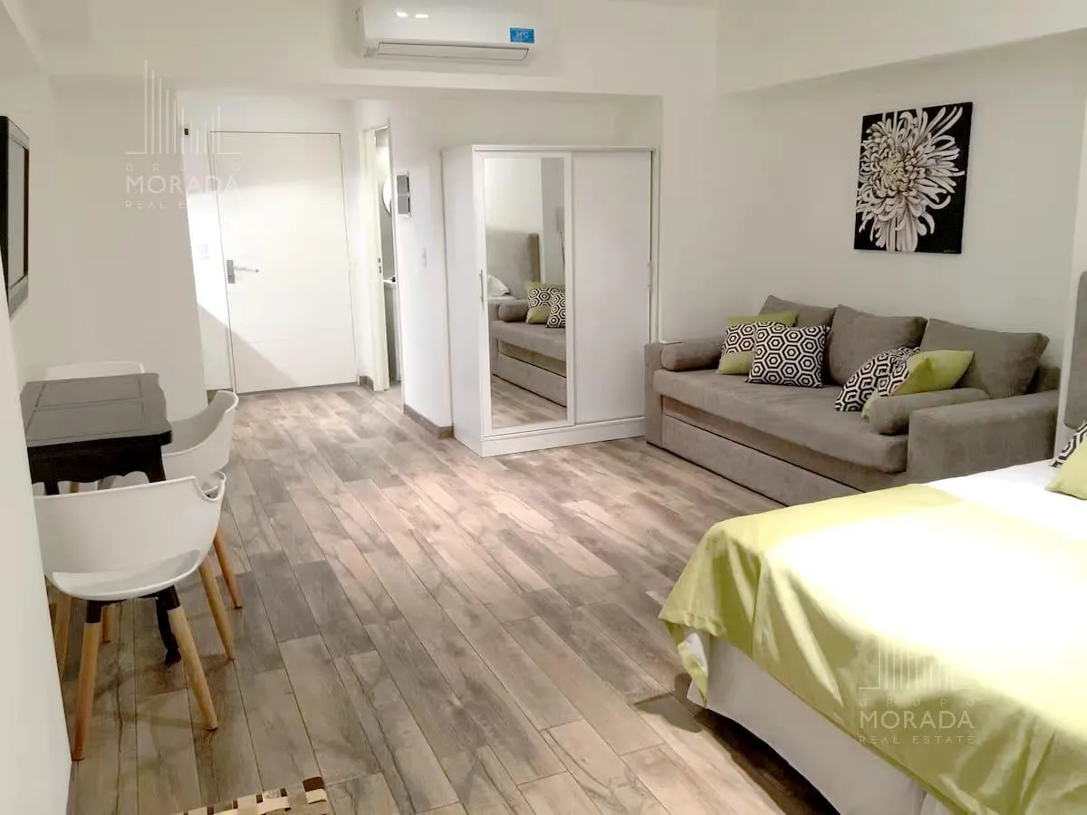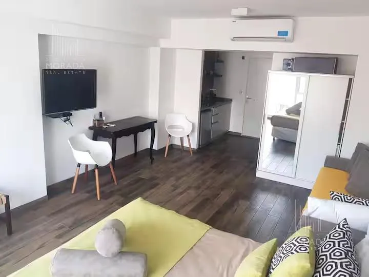 Monoambiente de 31 m² en el piso 8, con kitchenette equipada y sofá cama. Incluye horno y anafes, heladera con freezer, microondas, pava eléctrica, cafetera, exprimidor de jugos y tostadora; TV plana y aire frío/calor. Baño completo y seguridad 24 horas. El edificio cuenta con gimnasio, solarium, pileta, pileta para niños, sauna, vestuarios, jacuzzi y laundry.