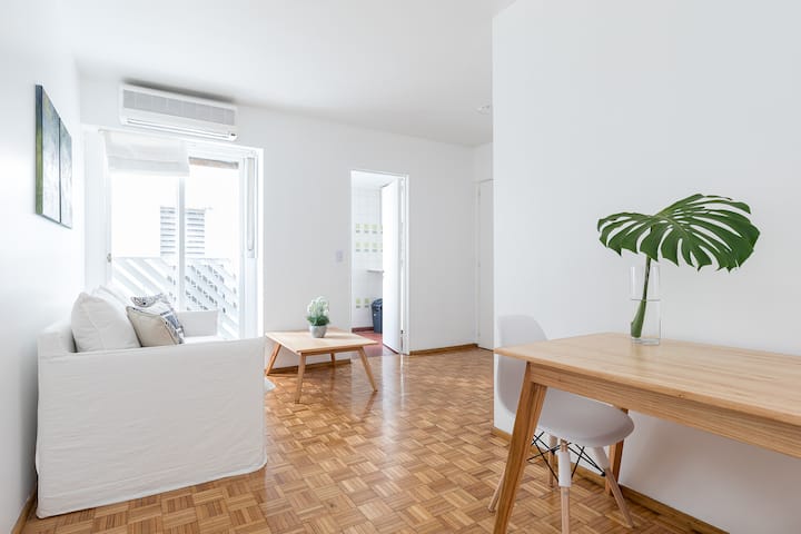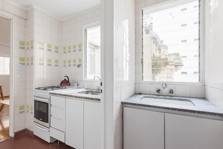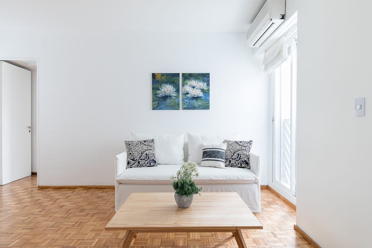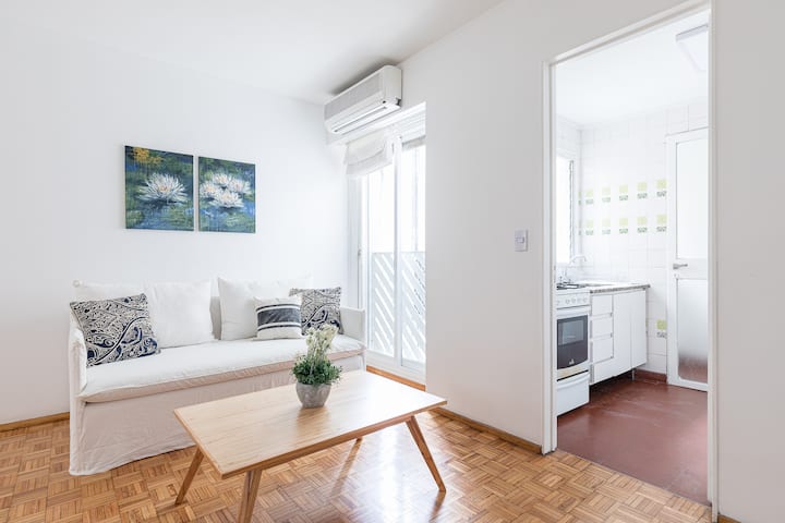 One-bedroom apartment in Retiro. It is described as bright, with 24-hour security. The listing says it is within walking distance of Teatro Colón and Recoleta Mall.