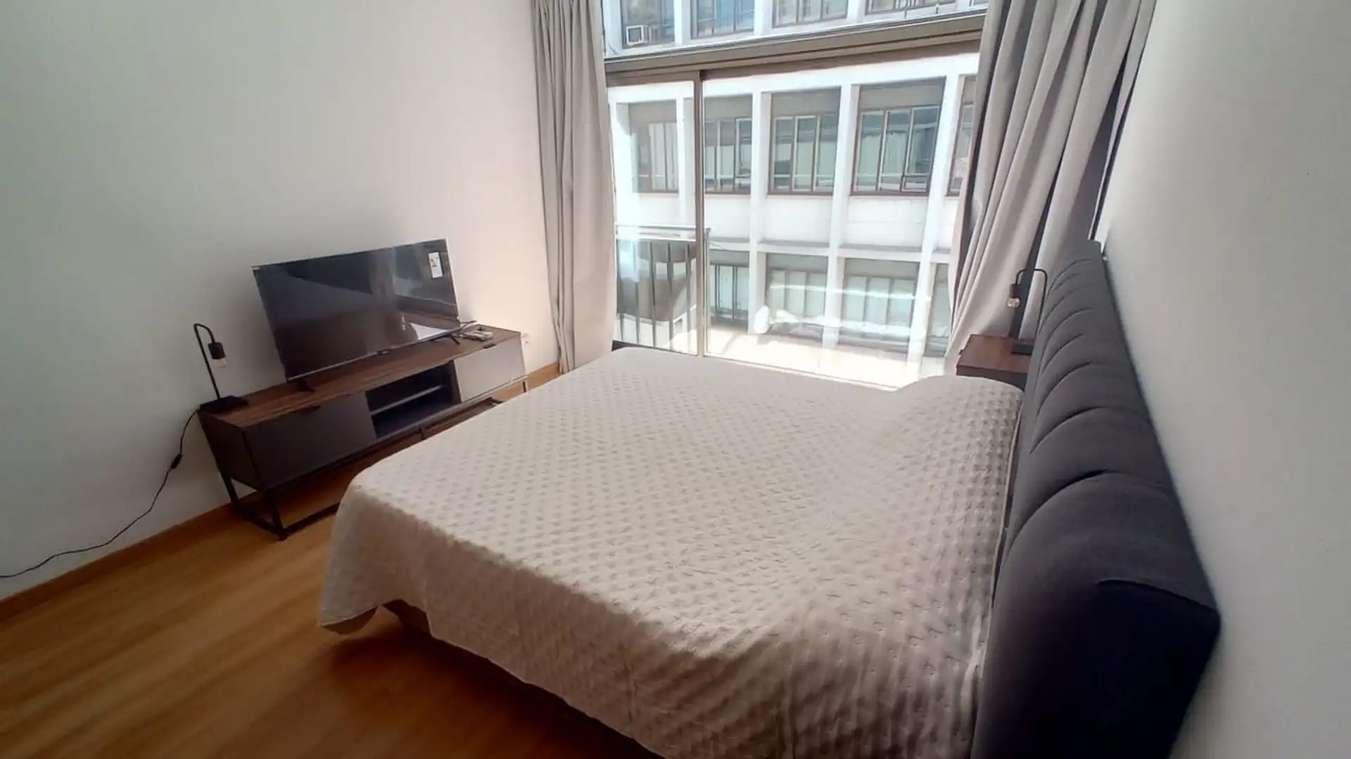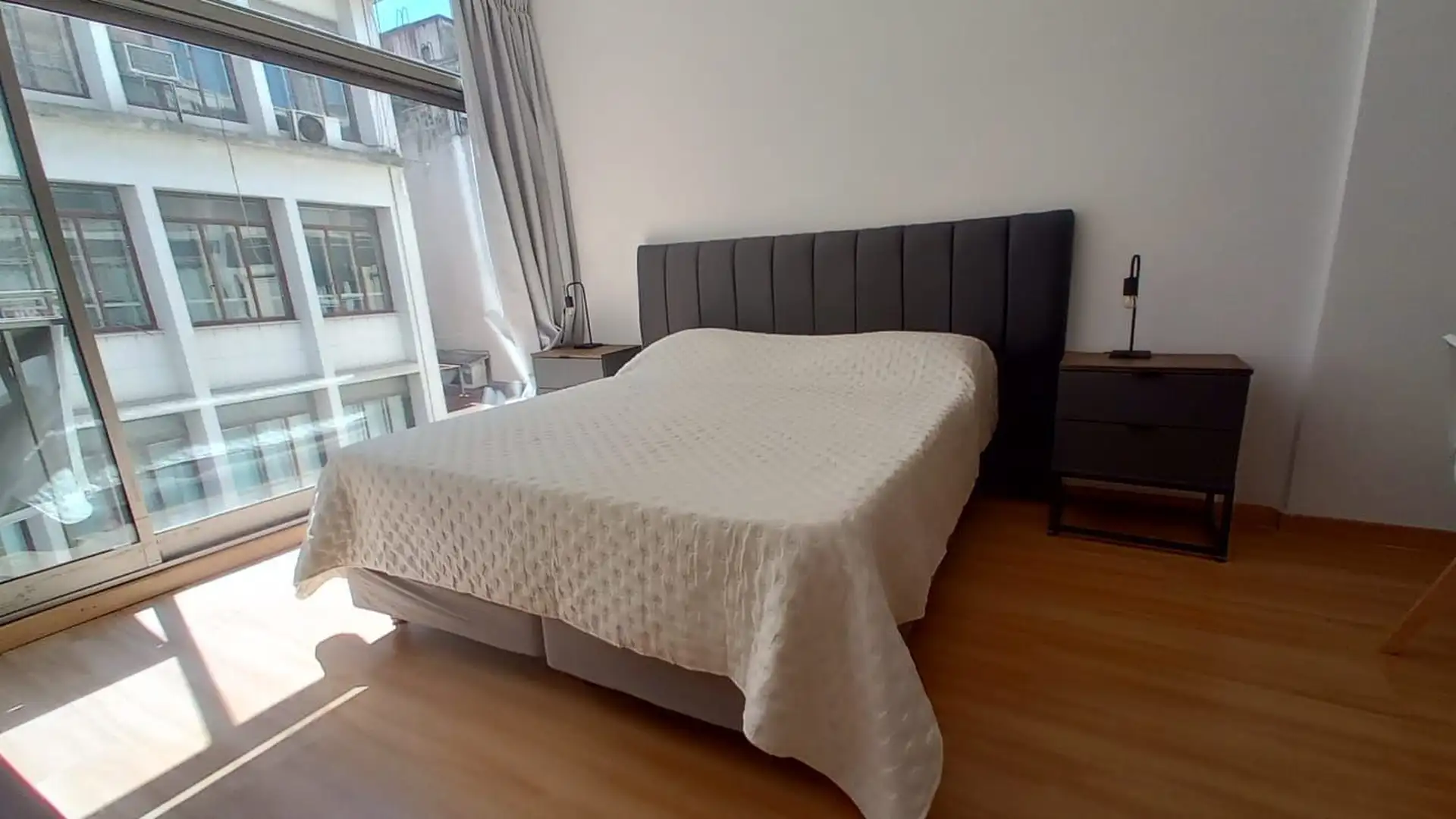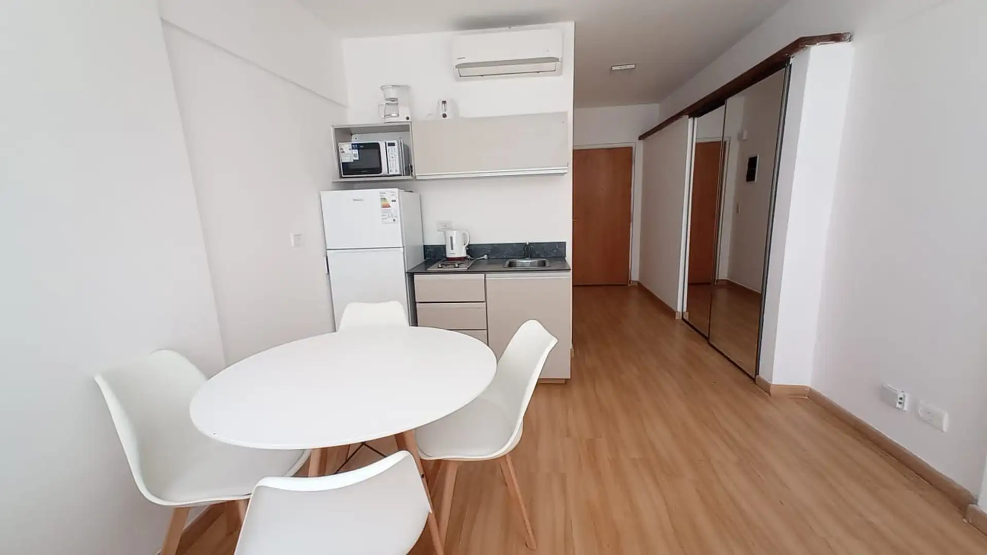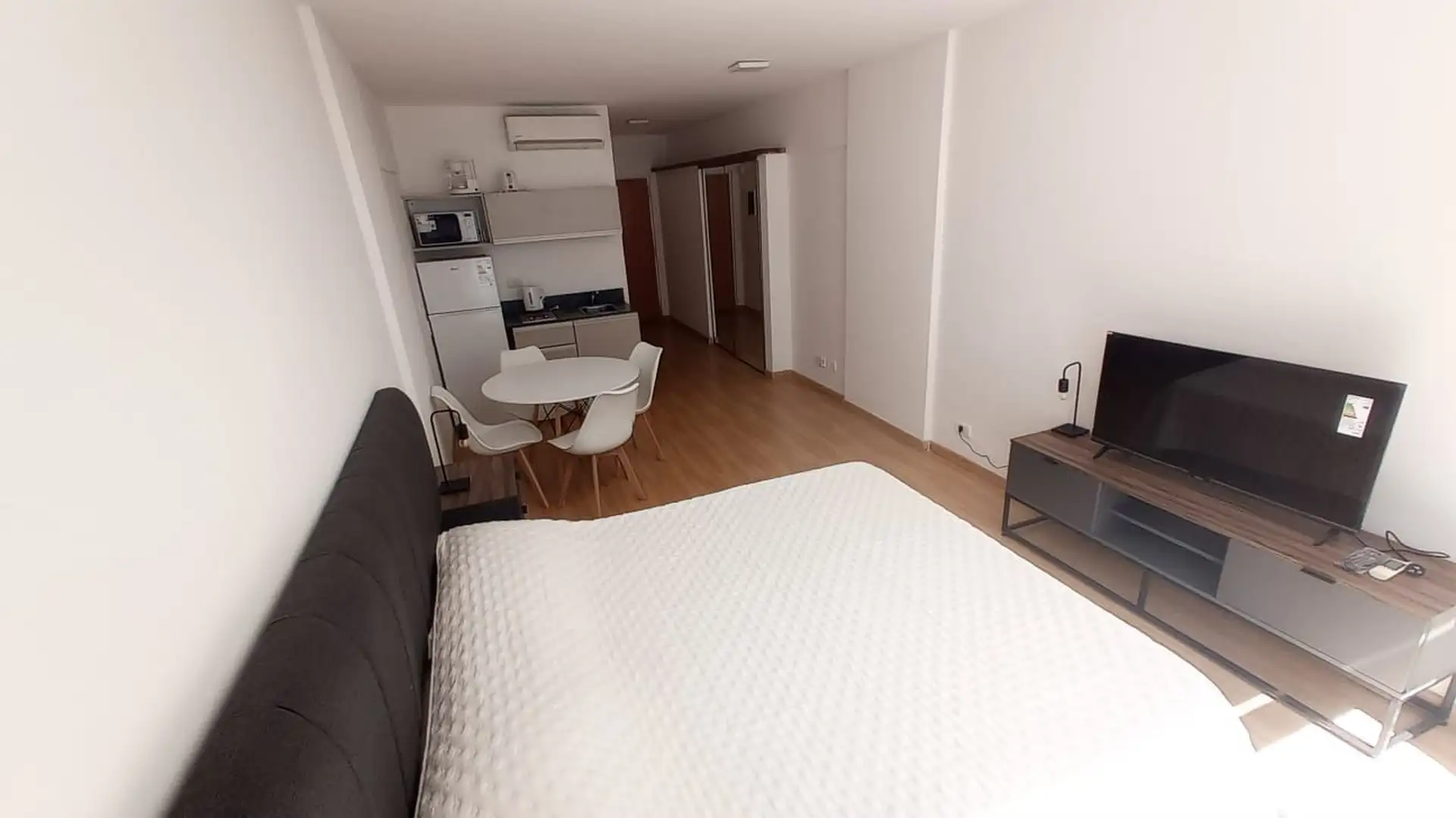 Departamento de 2 ambientes a estrenar, con área de living-comedor y cocina integrada equipada. Sector de dormitorio con cama queen y sommier nuevo, mueble bajo mesada con TV smart, placard doble espejado y gran ventanal. El edificio tiene terraza con solarium. Incluye expensas; los demás servicios quedan a cargo del inquilino.