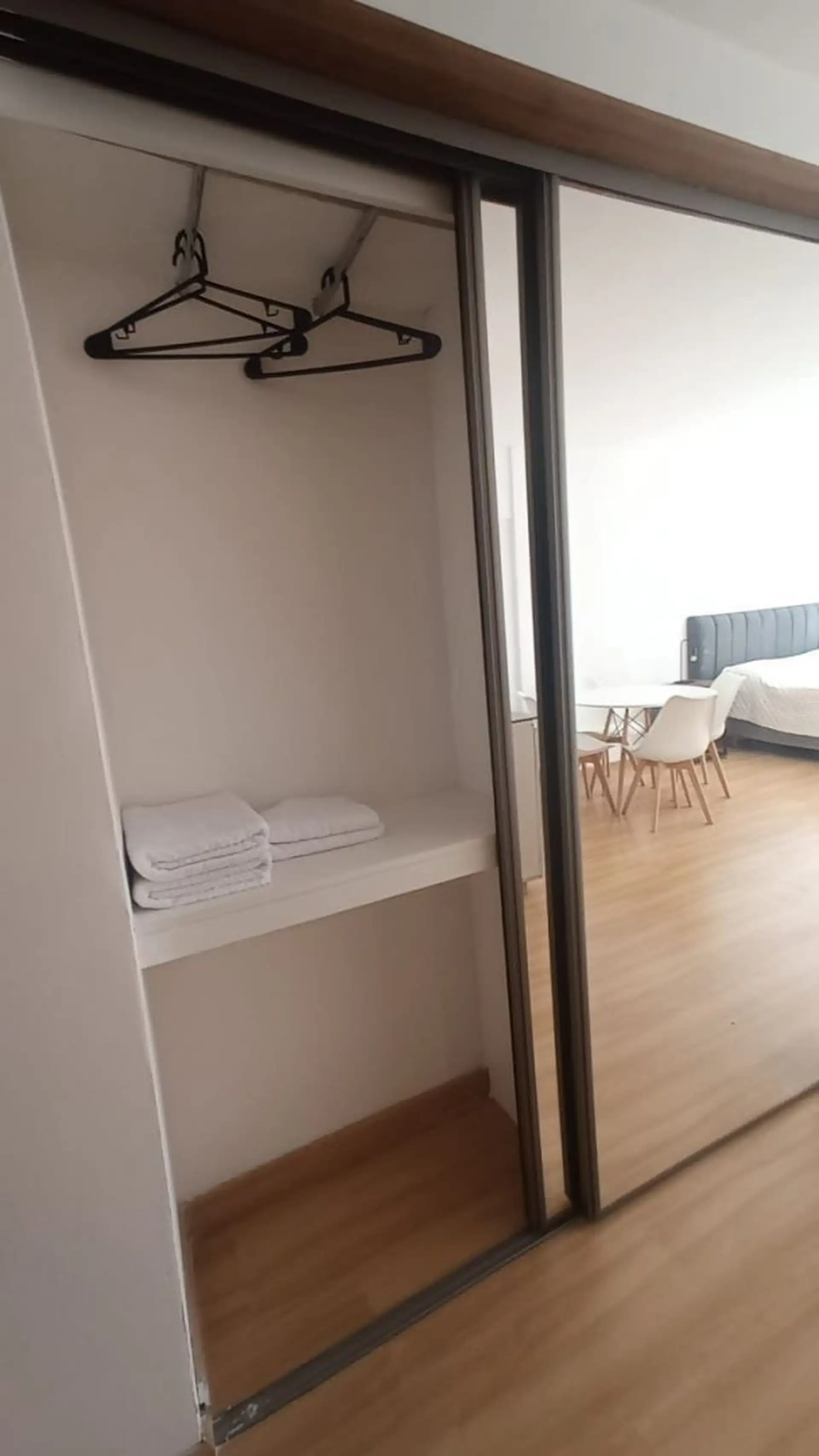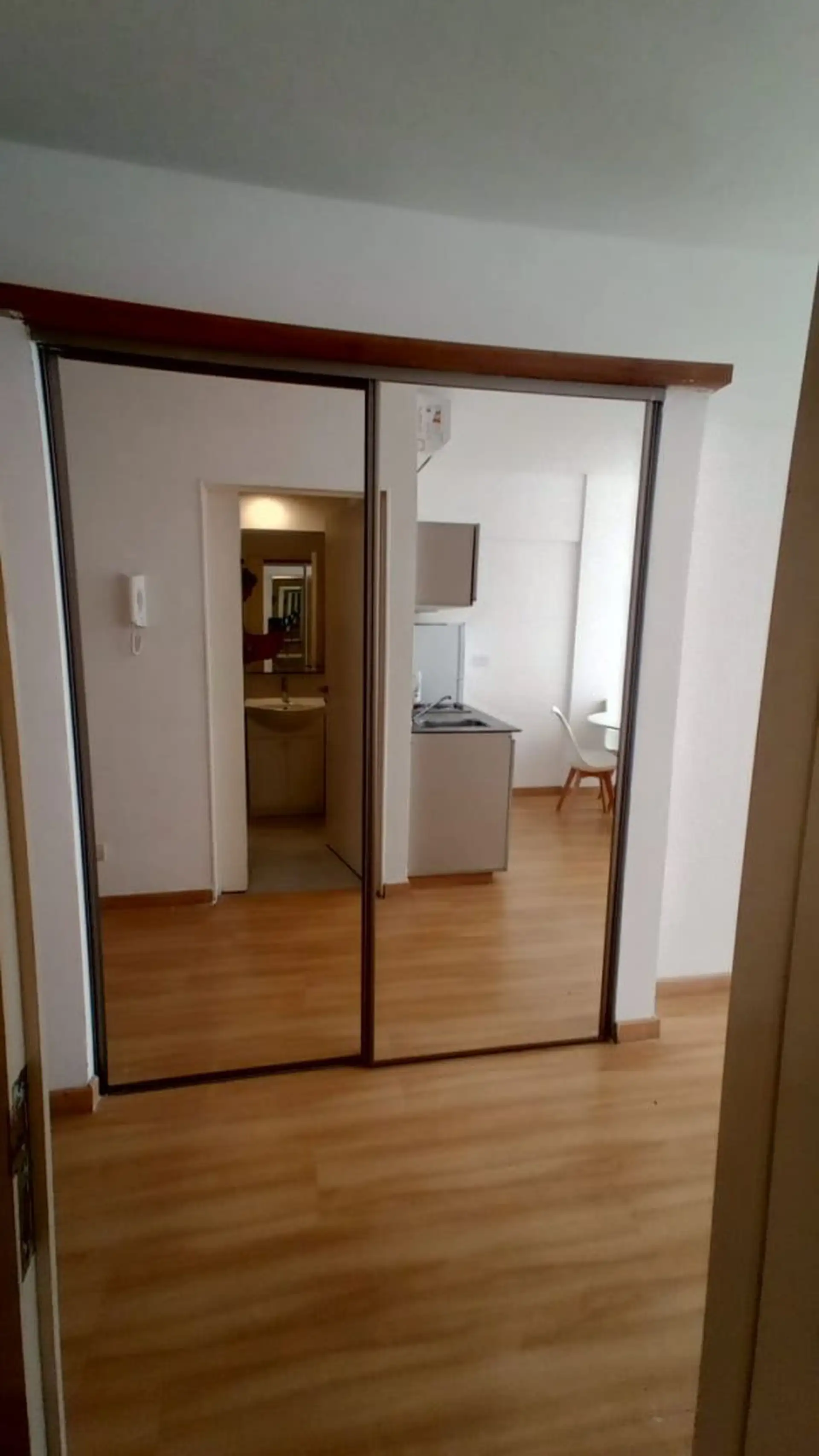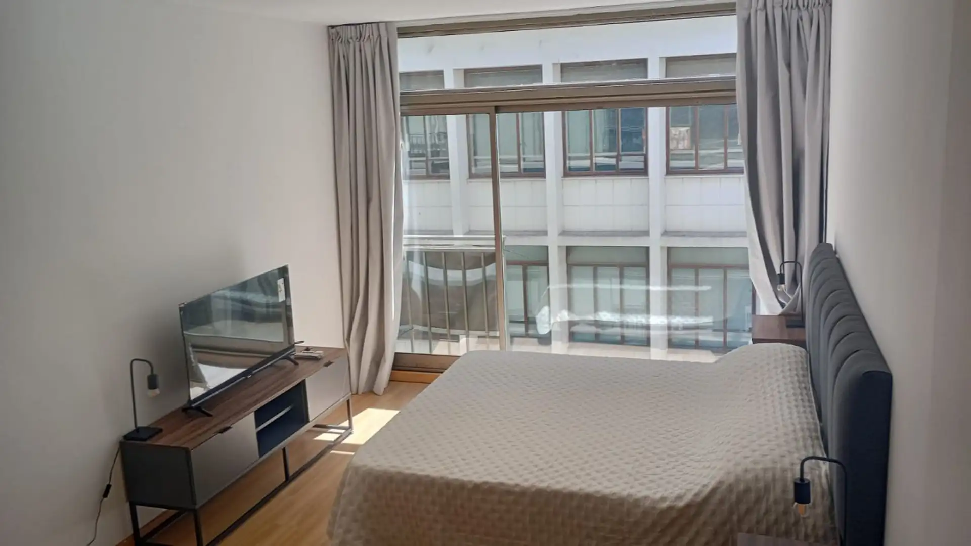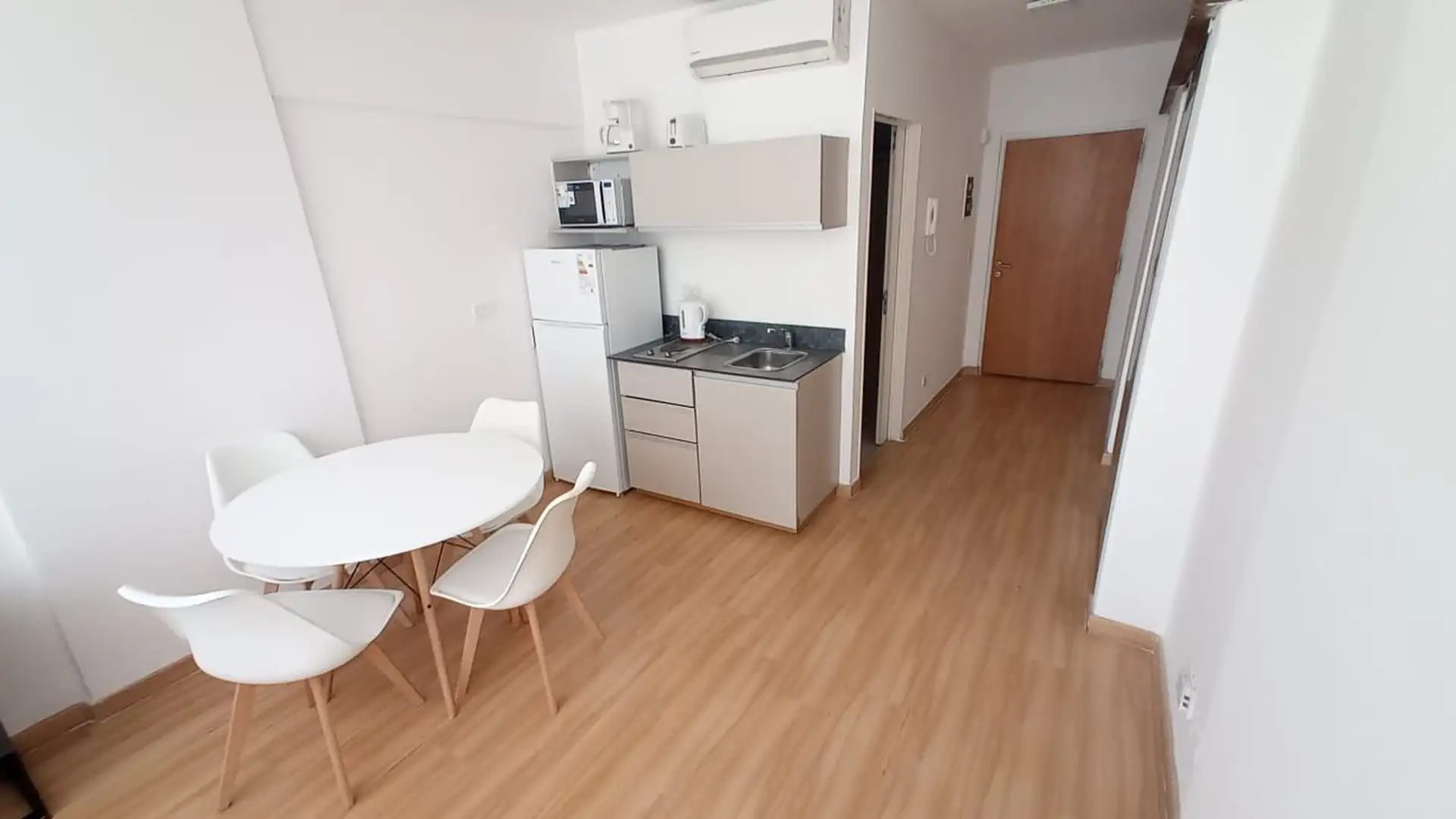 Departamento de 2 ambientes a estrenar, con área de living-comedor y cocina integrada equipada. Sector de dormitorio con cama queen y sommier nuevo, mueble bajo mesada con TV smart, placard doble espejado y gran ventanal. El edificio tiene terraza con solarium. Incluye expensas; los demás servicios quedan a cargo del inquilino.