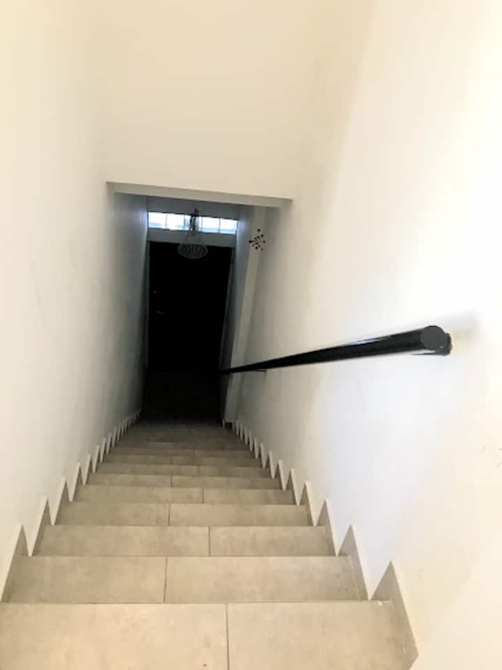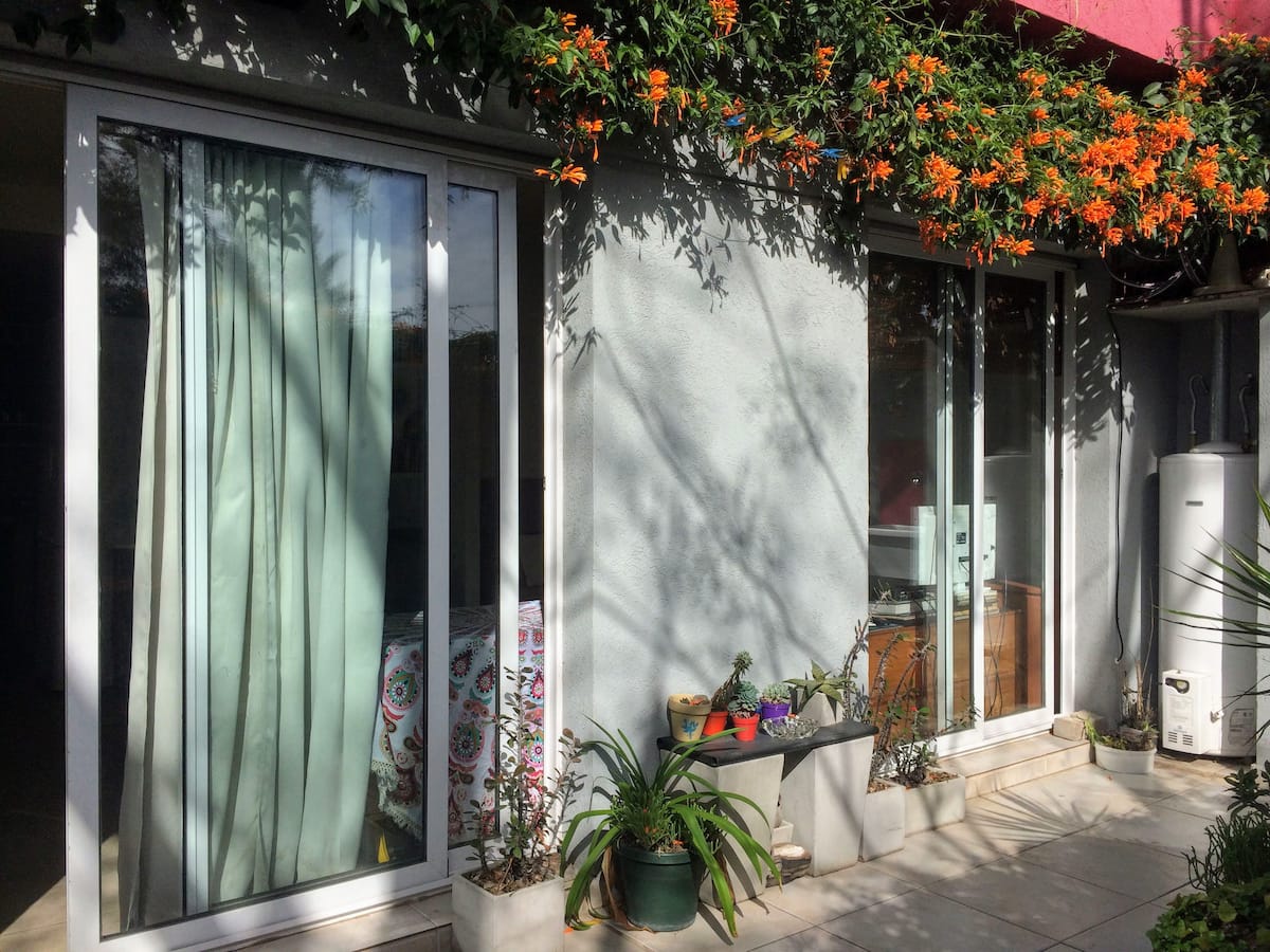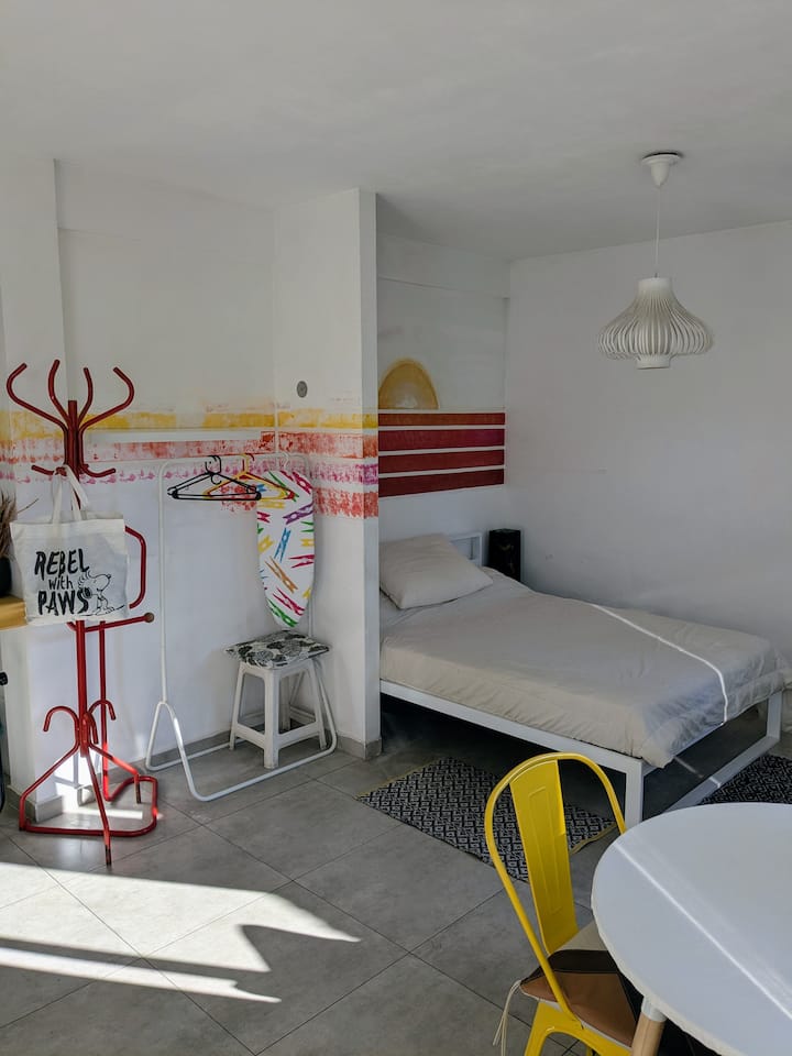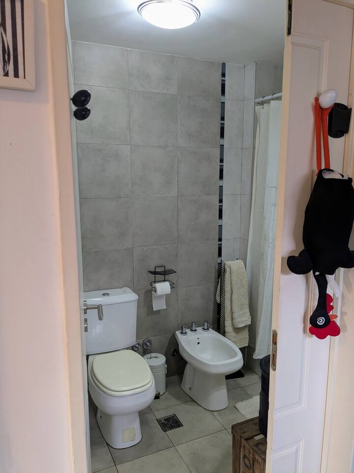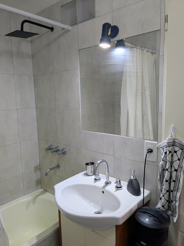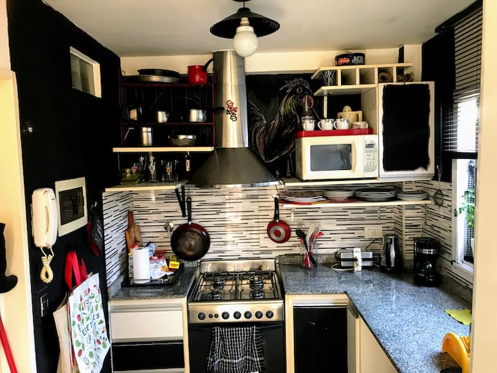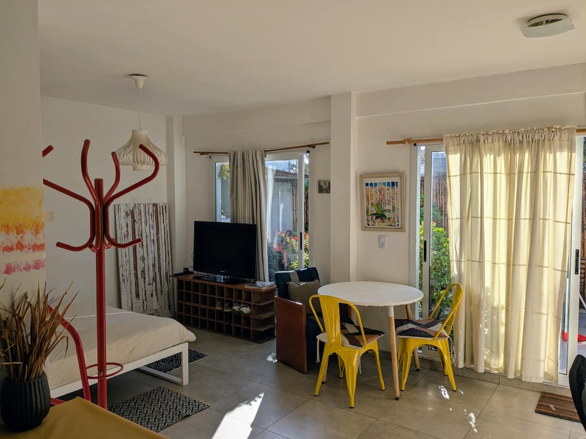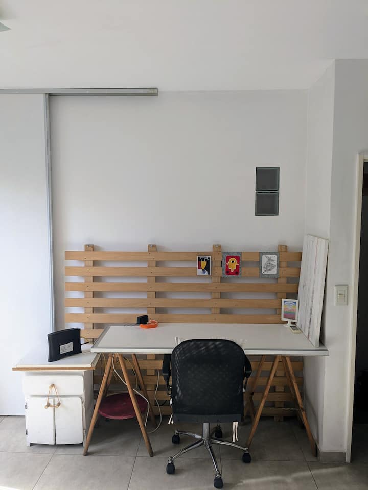 Estudio en alquiler con entrada independiente por escaleras y gran balcón. El ambiente se alquila completo. Cuenta con cocina equipada con microondas, frigobar, pava eléctrica, cafetera y sandwichera; baño completo con ducha. Dispone de WiFi y TV de 42" con cable y Chromecast.
