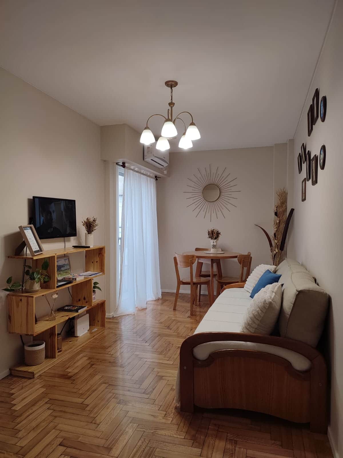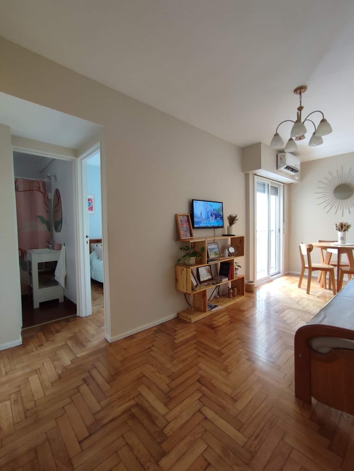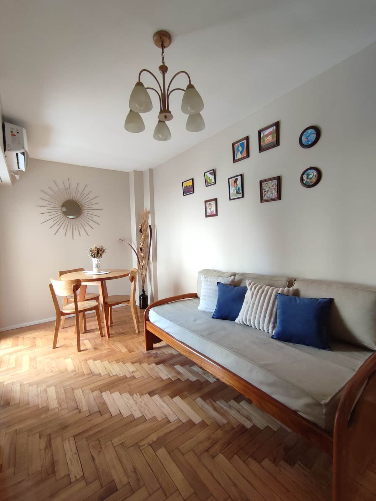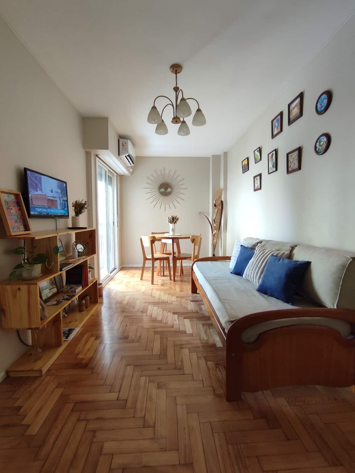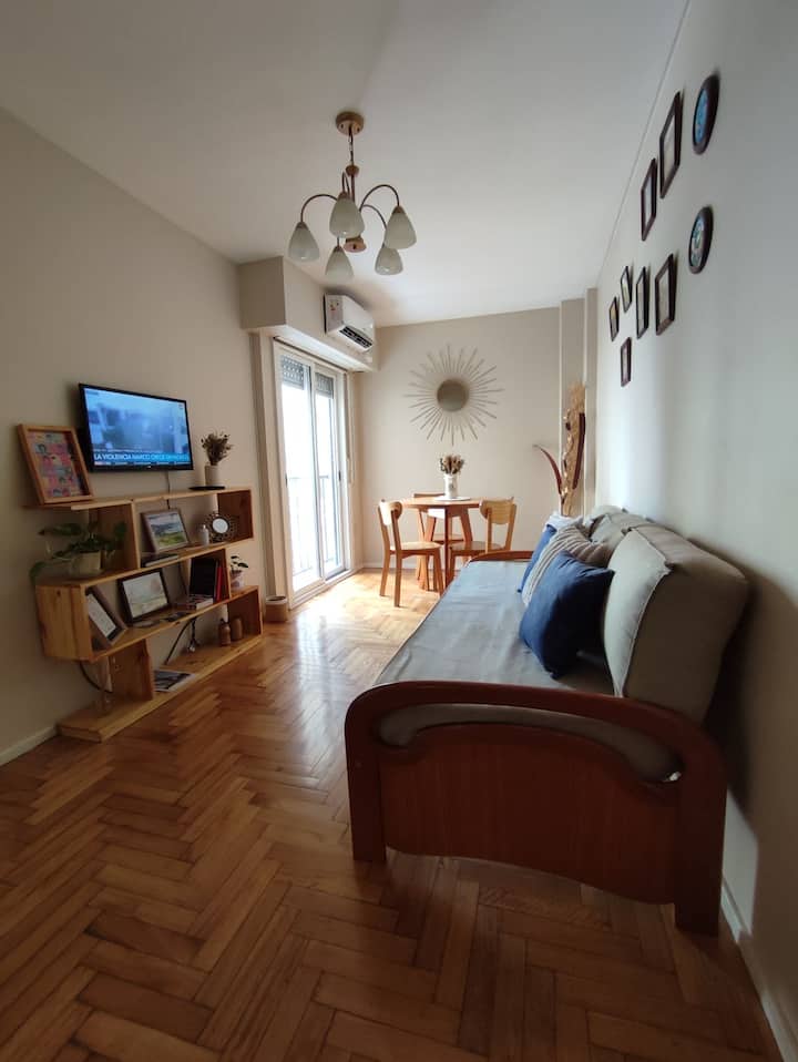 Departamento de 1 dormitorio con placard, en Buenos Aires. Incluye mobiliario con cama-sofá en el comedor y red de seguridad en las ventanas. Cocina completa con gas natural, microondas, plancha y cafetera eléctrica; también se informan adaptador para 220V, disponibilidad de ropa de cama y toallas con recambio semanal, y no se permite fumar dentro del departamento.