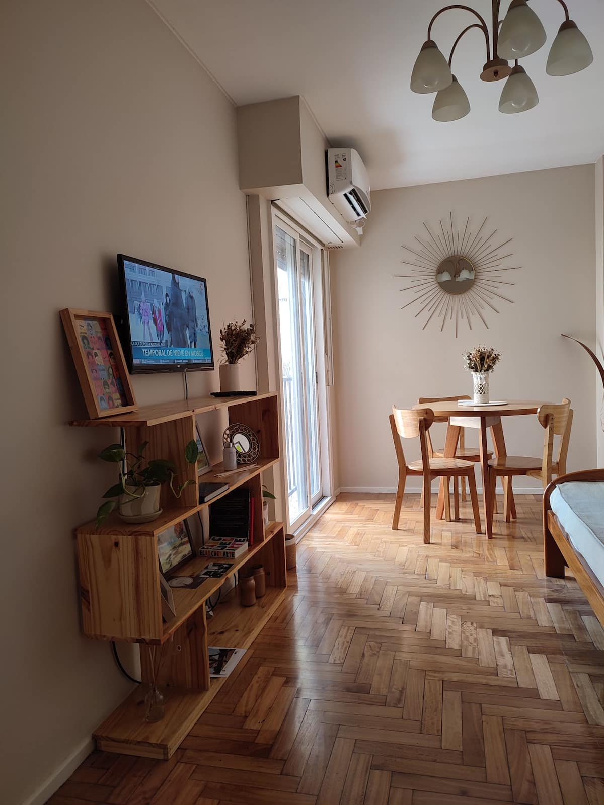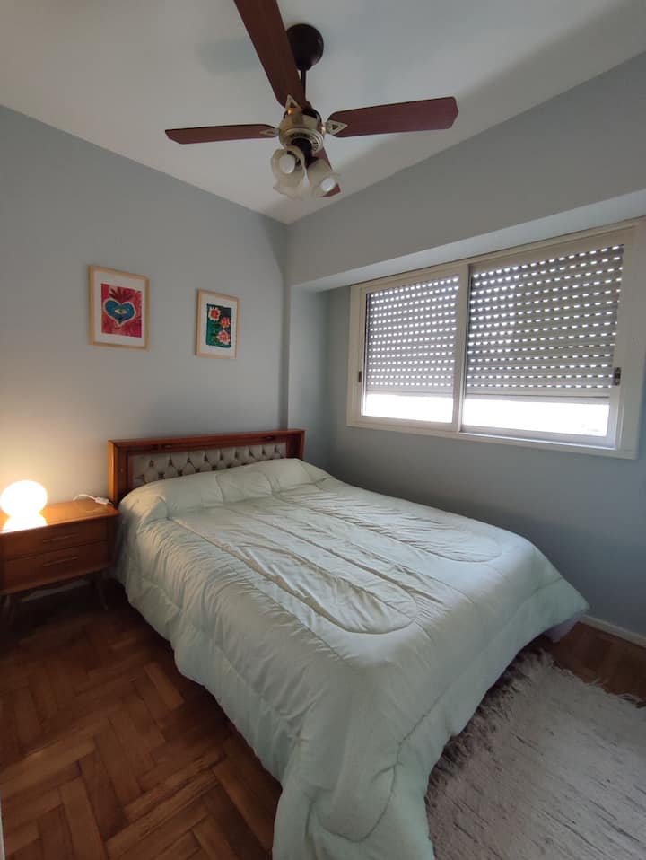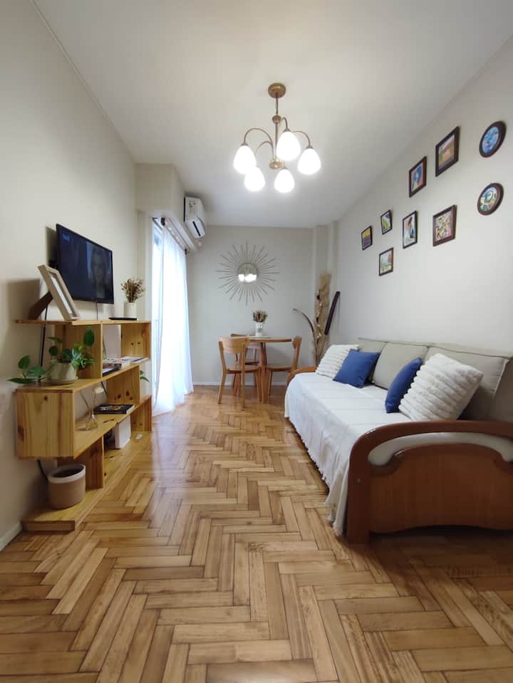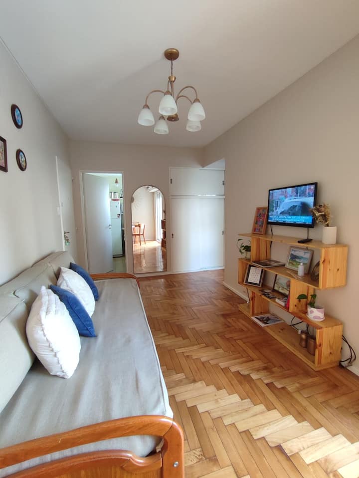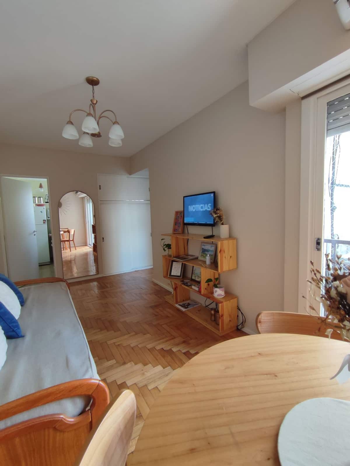 Departamento de 1 dormitorio con placard, en Buenos Aires. Incluye mobiliario con cama-sofá en el comedor y red de seguridad en las ventanas. Cocina completa con gas natural, microondas, plancha y cafetera eléctrica; también se informan adaptador para 220V, disponibilidad de ropa de cama y toallas con recambio semanal, y no se permite fumar dentro del departamento.