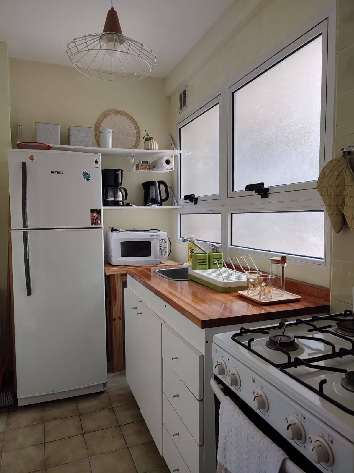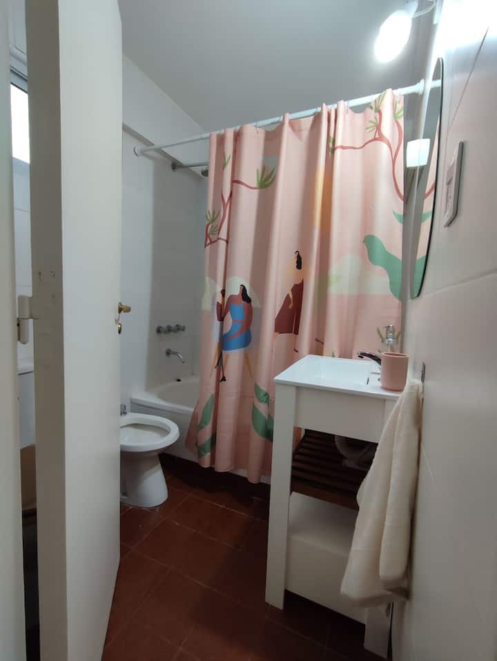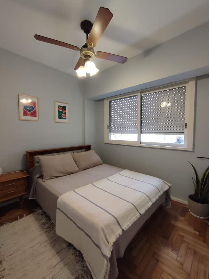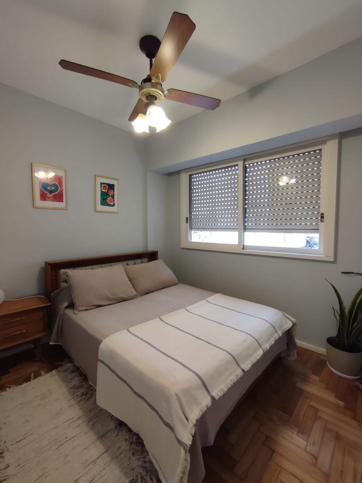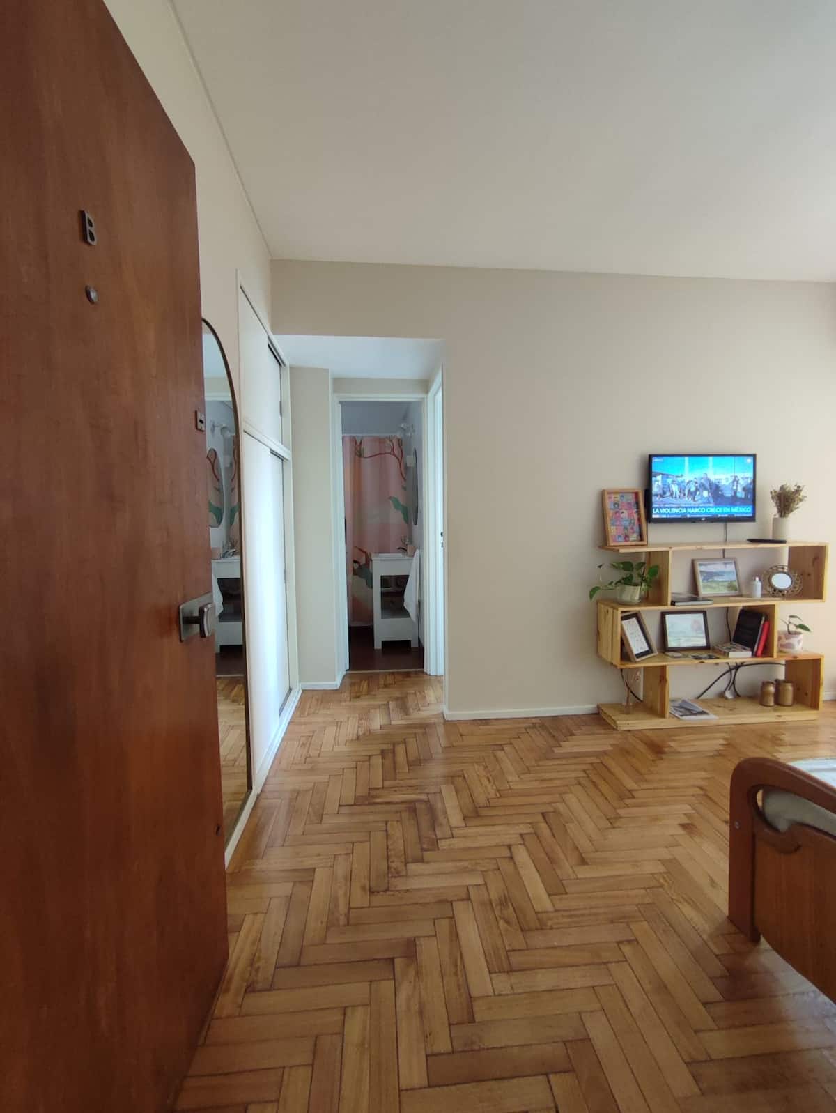Departamento de 1 dormitorio con placard, en Buenos Aires. Incluye mobiliario con cama-sofá en el comedor y red de seguridad en las ventanas. Cocina completa con gas natural, microondas, plancha y cafetera eléctrica; también se informan adaptador para 220V, disponibilidad de ropa de cama y toallas con recambio semanal, y no se permite fumar dentro del departamento.