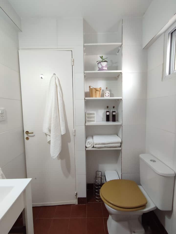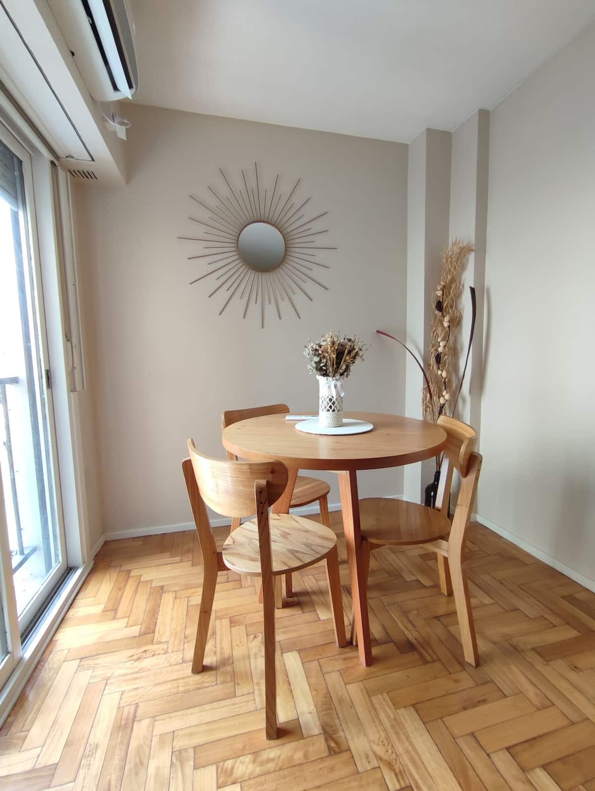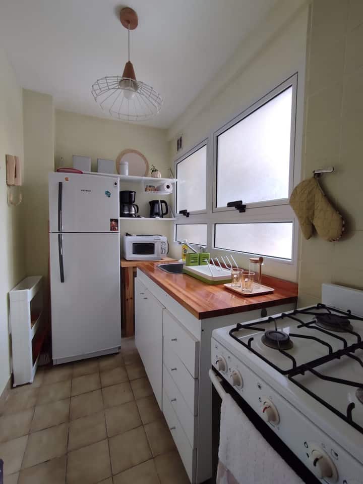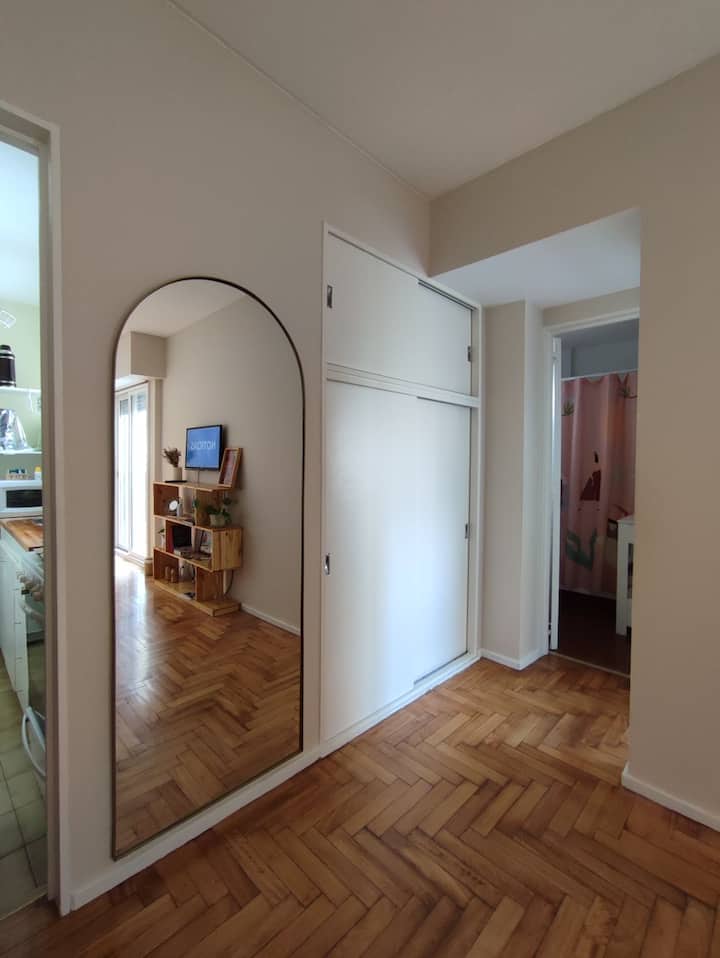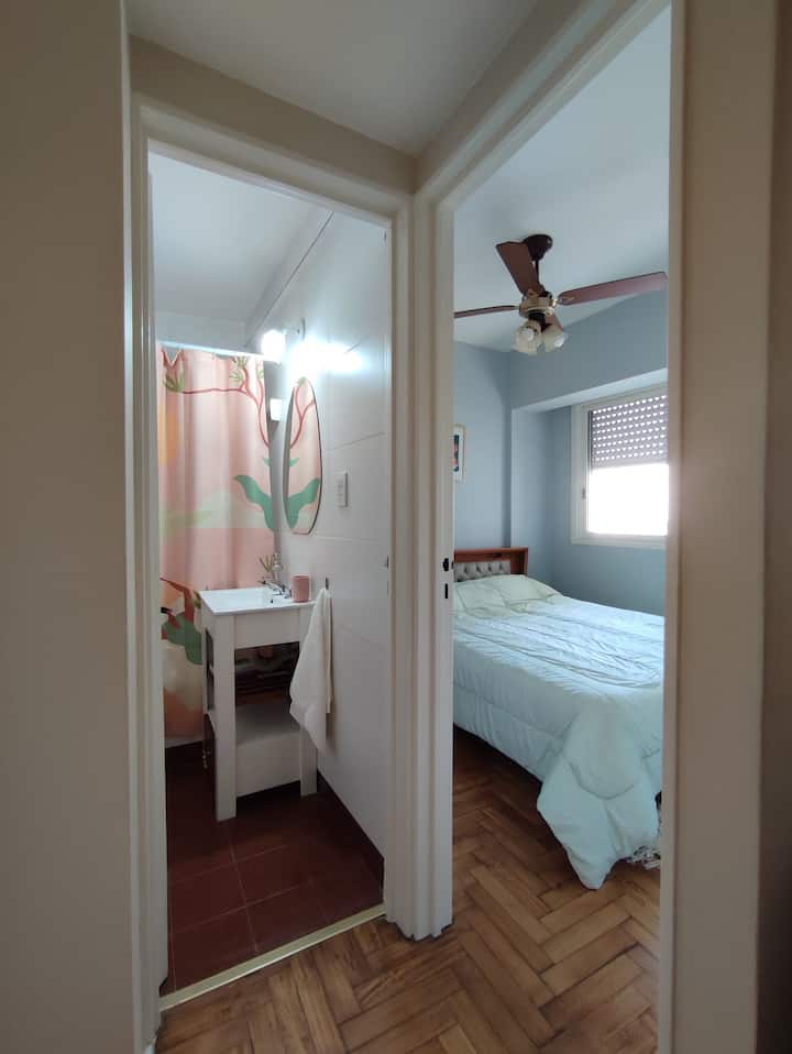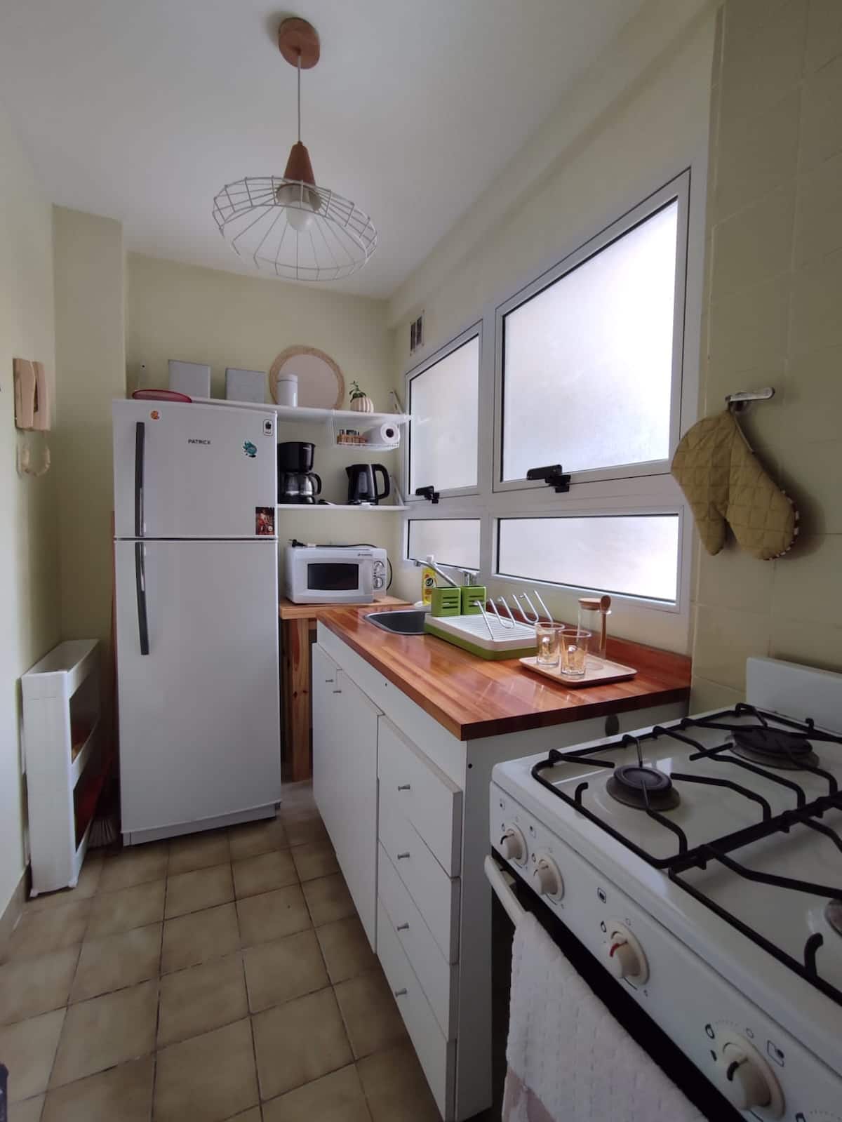 Departamento de 1 dormitorio con placard, en Buenos Aires. Incluye mobiliario con cama-sofá en el comedor y red de seguridad en las ventanas. Cocina completa con gas natural, microondas, plancha y cafetera eléctrica; también se informan adaptador para 220V, disponibilidad de ropa de cama y toallas con recambio semanal, y no se permite fumar dentro del departamento.
