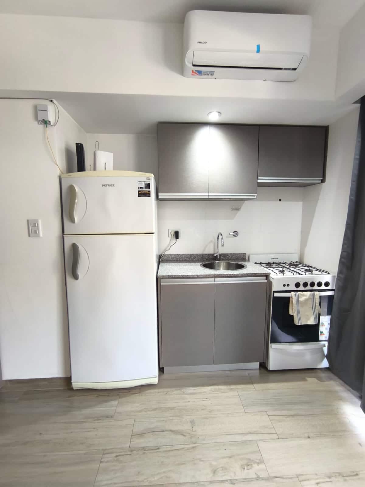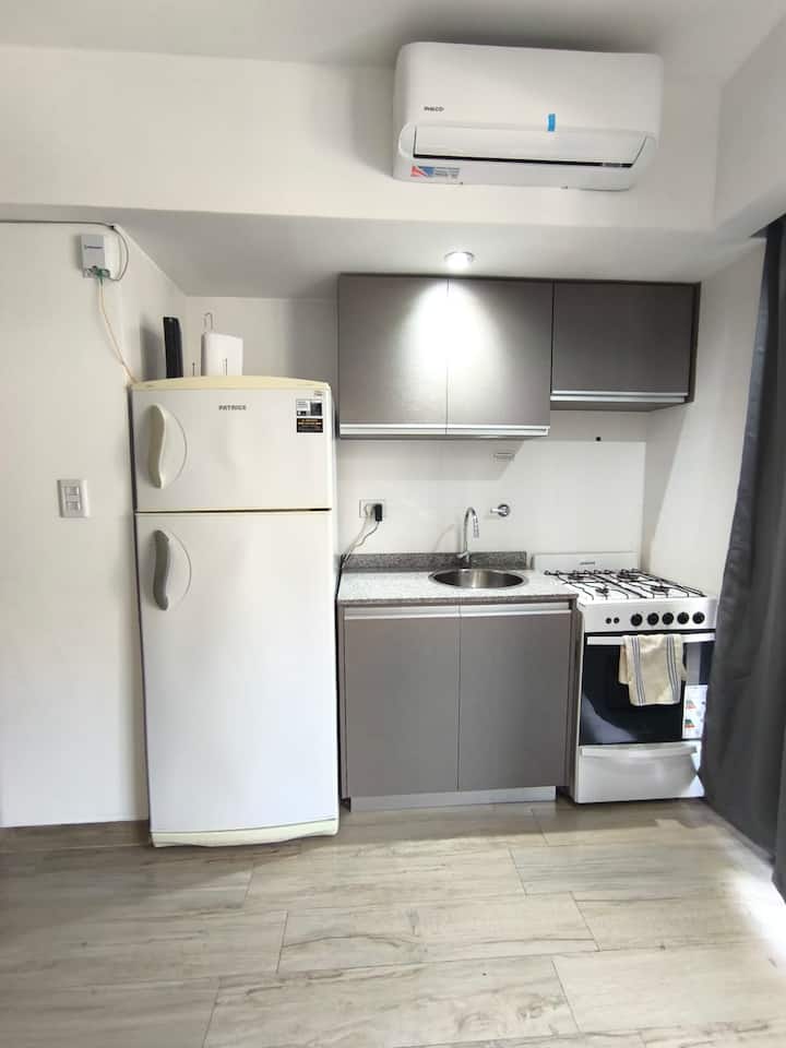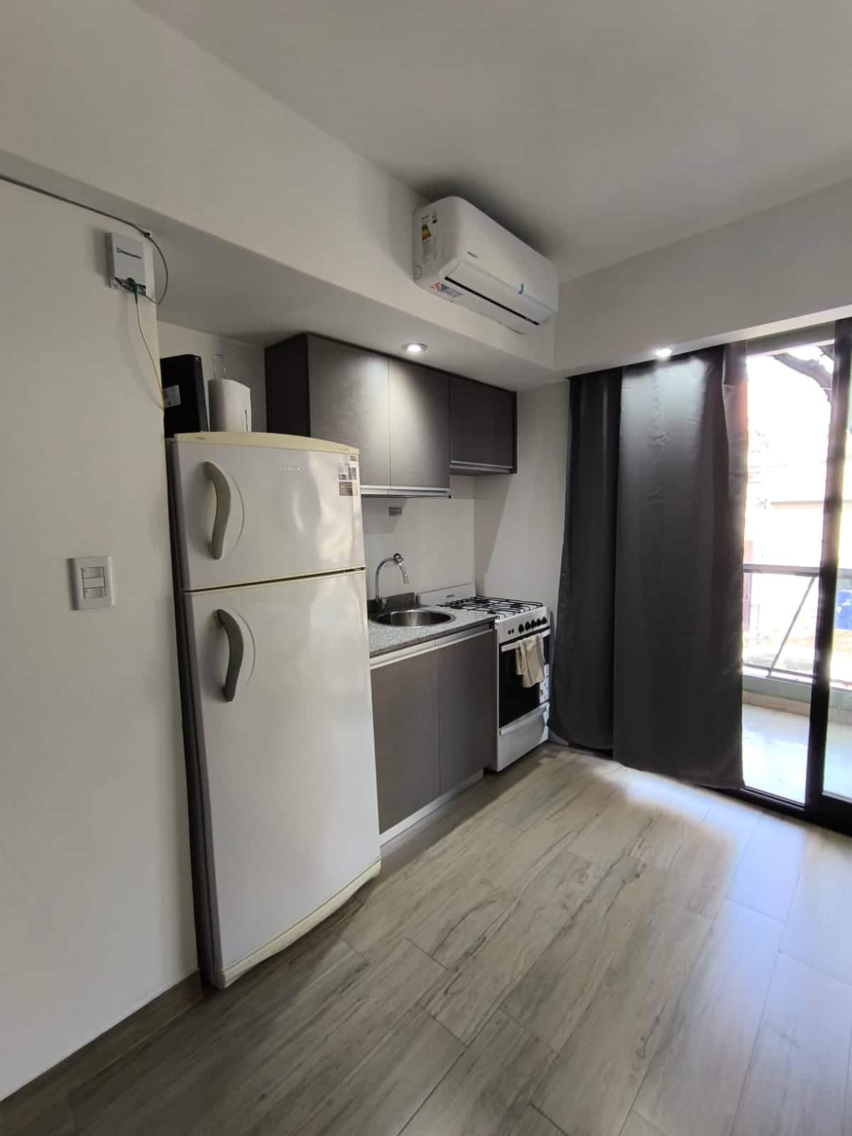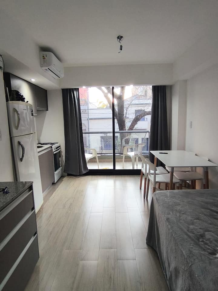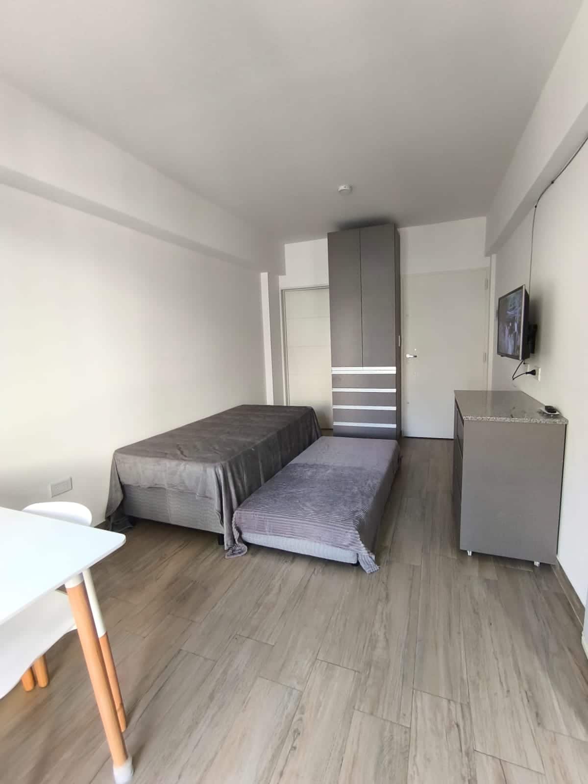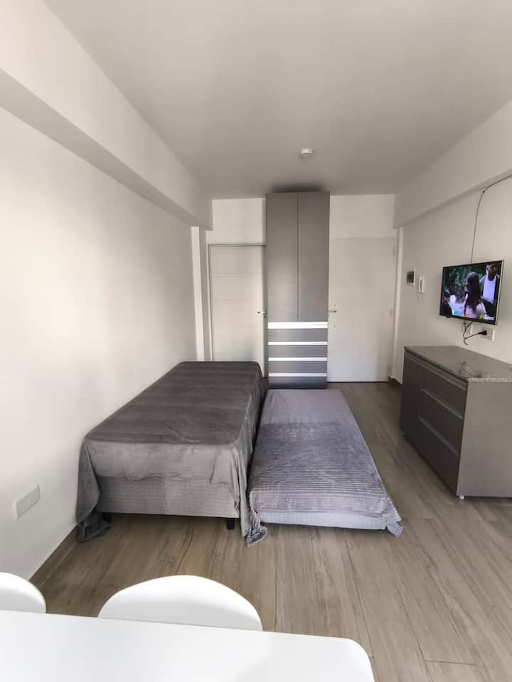 Departamento de 2 ambientes en San Cristóbal, con 1 habitación. Cuenta con una base de cama con carrito y cama auxiliar, para 2 personas. Se ubica a 1 cuadra de la estación de subte de la Línea H.