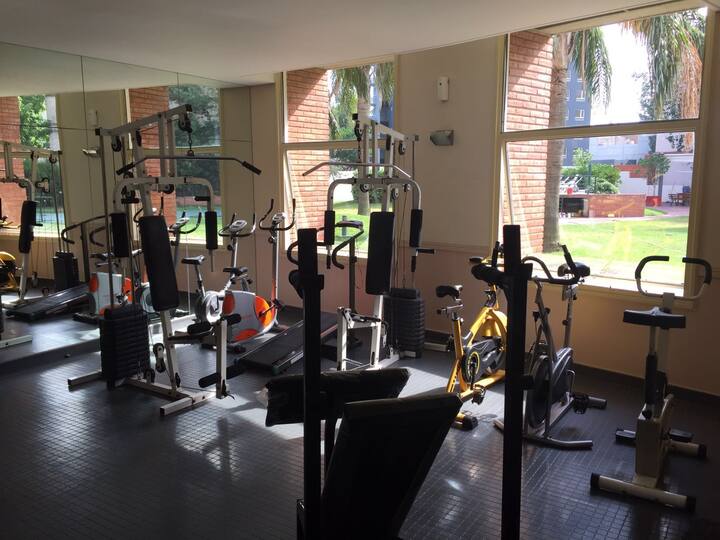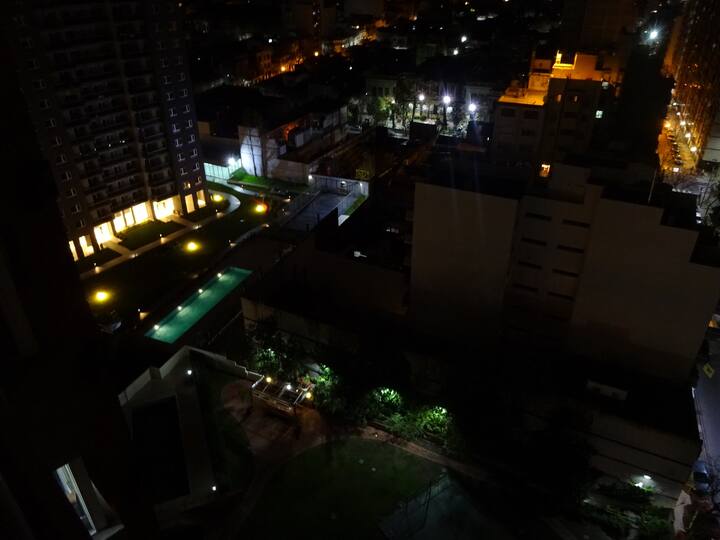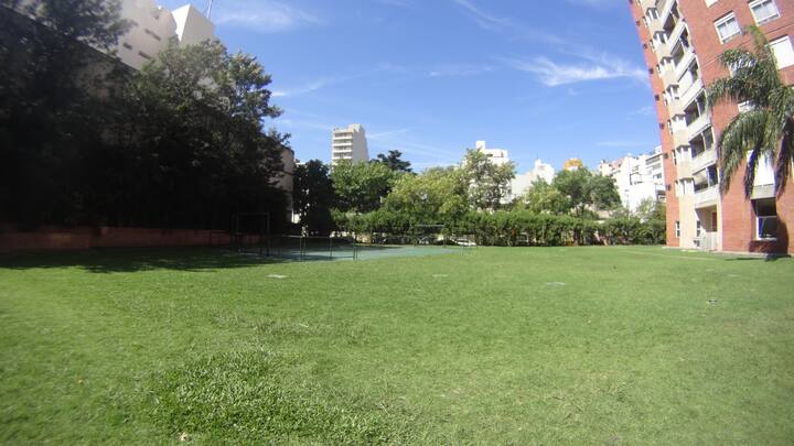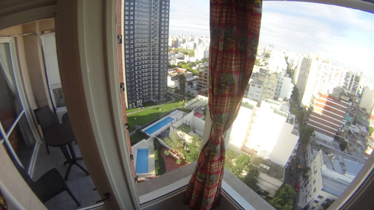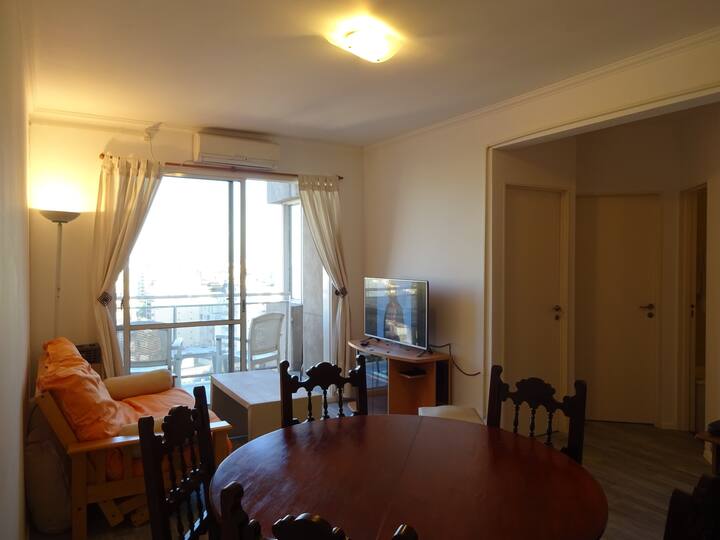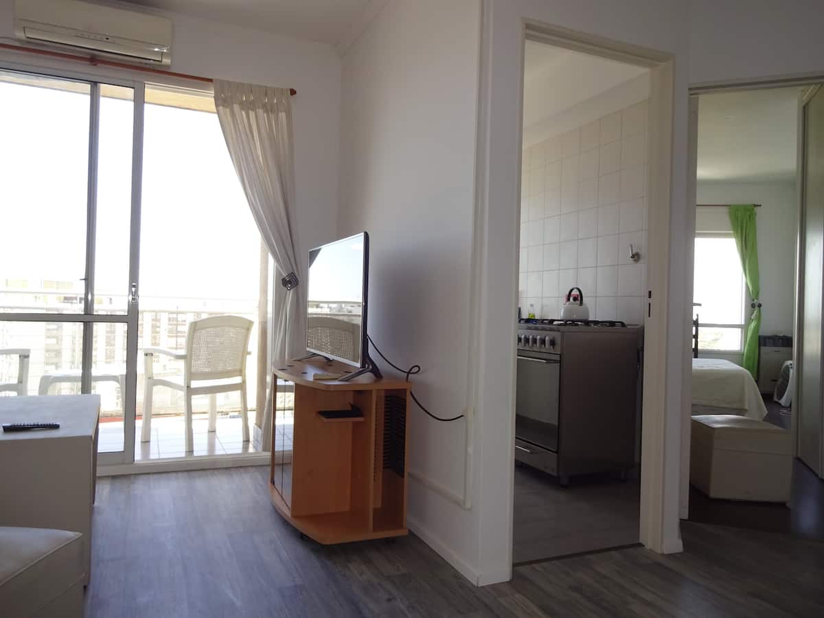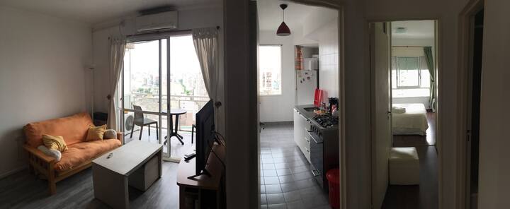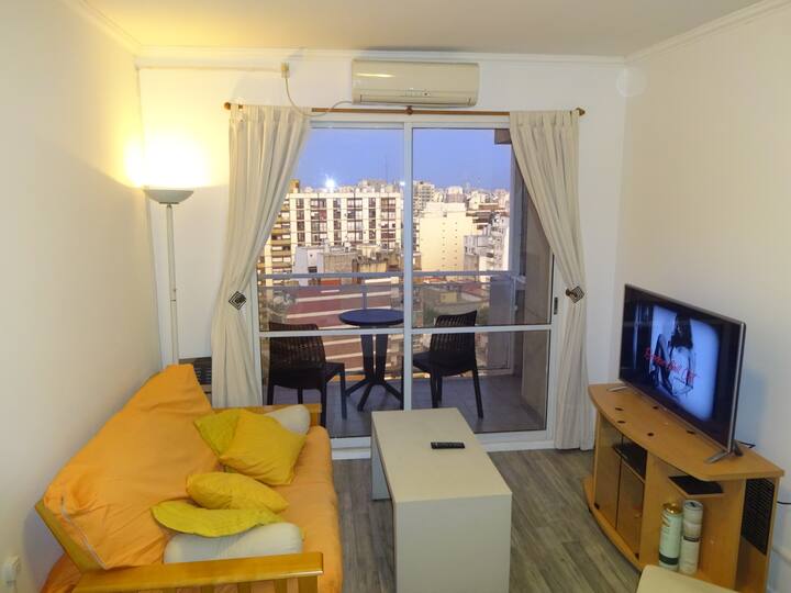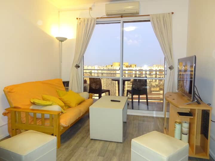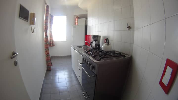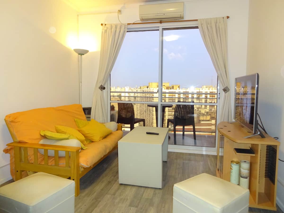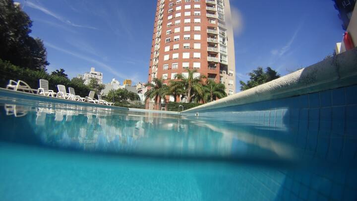 Departamento de 1 dormitorio con balcón. Vista abierta de la zona. Cuenta con seguridad, internet, TV por cable y cocina completa, con escritorio en un ambiente muy iluminado. El acceso a áreas comunes incluye pileta, gimnasio, parrilla y parque en los horarios del reglamento; la pileta es de uso exclusivo para huéspedes y no se admiten invitados.