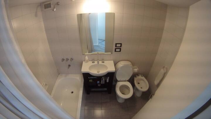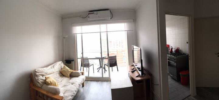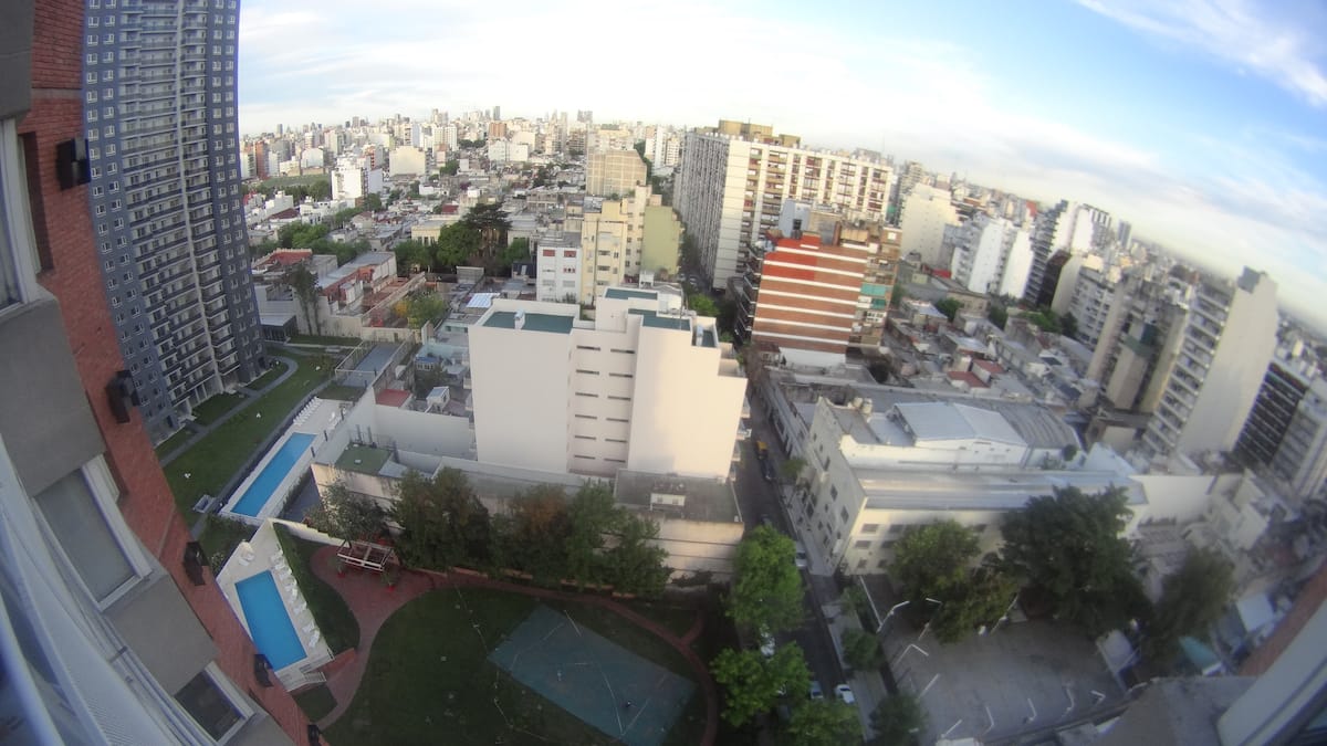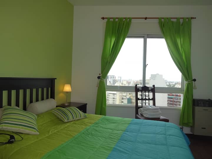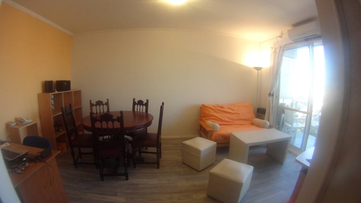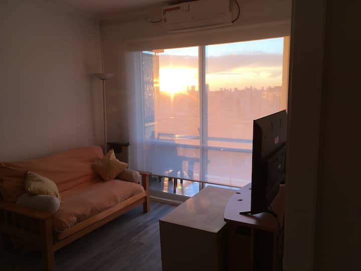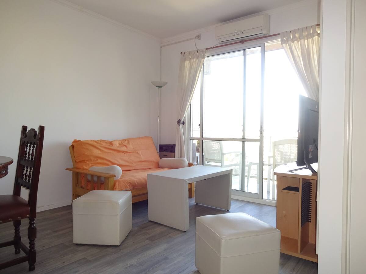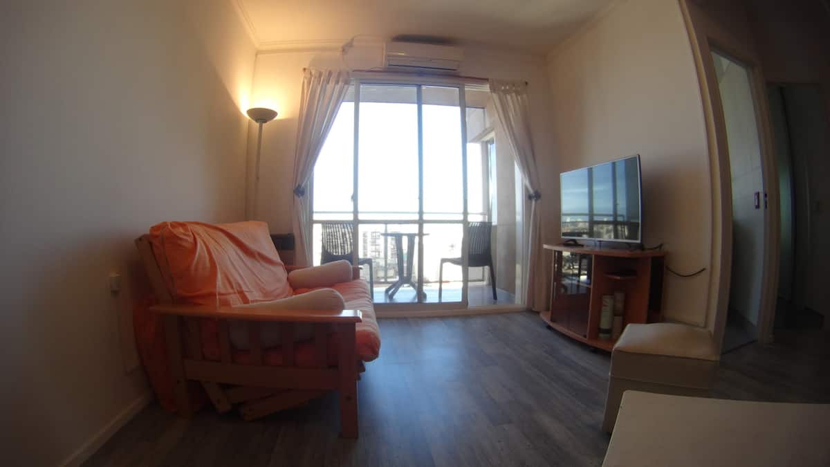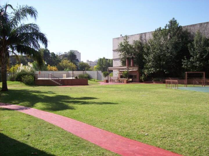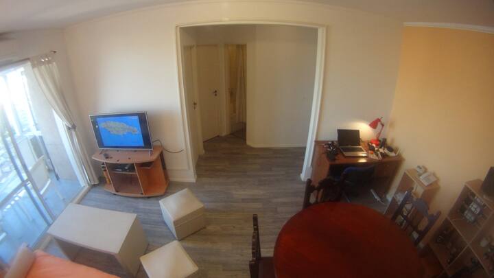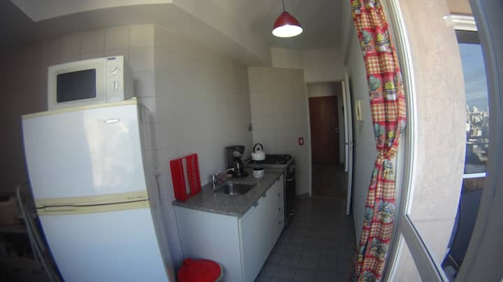 Departamento de 1 dormitorio con balcón. Vista abierta de la zona. Cuenta con seguridad, internet, TV por cable y cocina completa, con escritorio en un ambiente muy iluminado. El acceso a áreas comunes incluye pileta, gimnasio, parrilla y parque en los horarios del reglamento; la pileta es de uso exclusivo para huéspedes y no se admiten invitados.