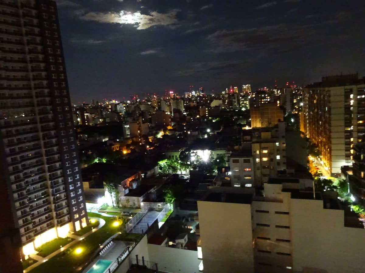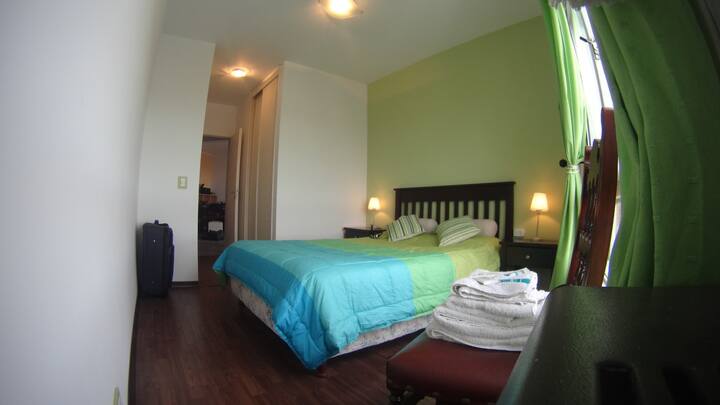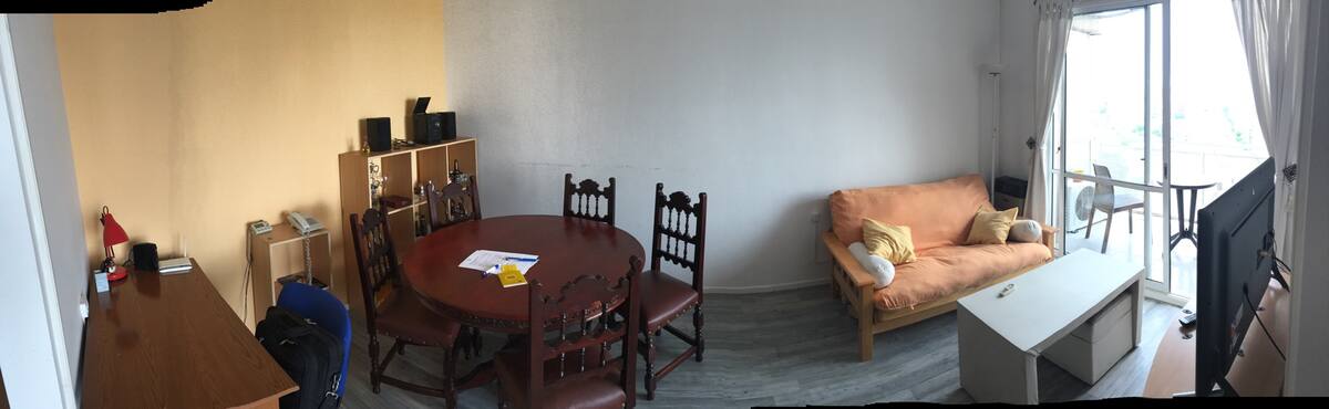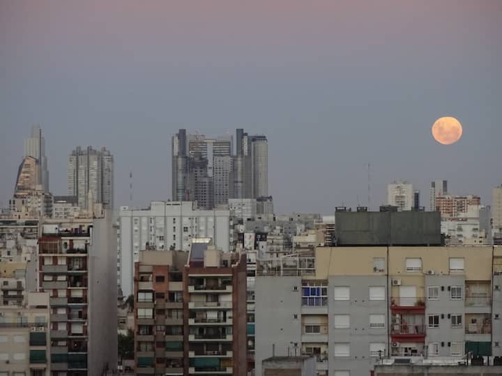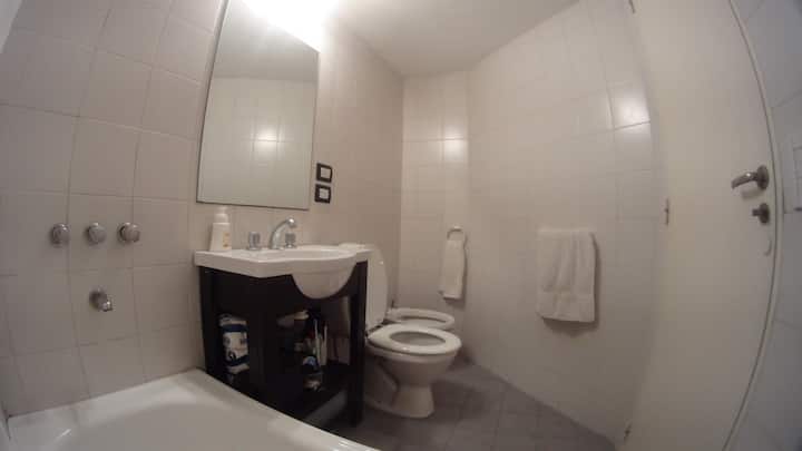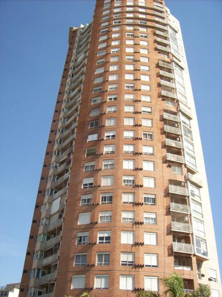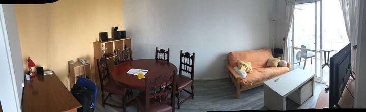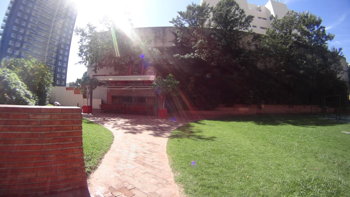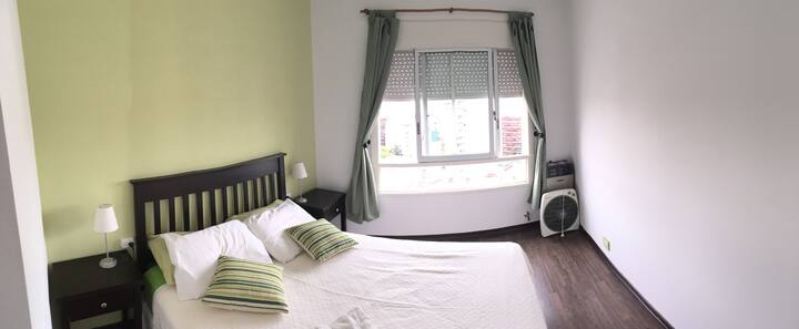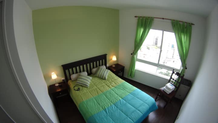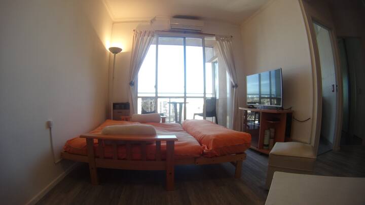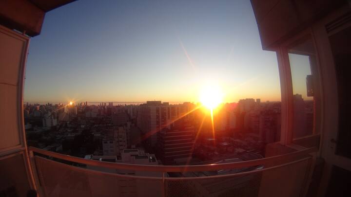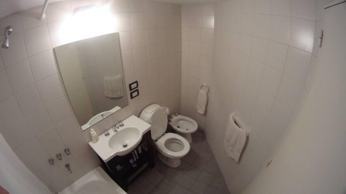 Departamento de 1 dormitorio con balcón. Vista abierta de la zona. Cuenta con seguridad, internet, TV por cable y cocina completa, con escritorio en un ambiente muy iluminado. El acceso a áreas comunes incluye pileta, gimnasio, parrilla y parque en los horarios del reglamento; la pileta es de uso exclusivo para huéspedes y no se admiten invitados.