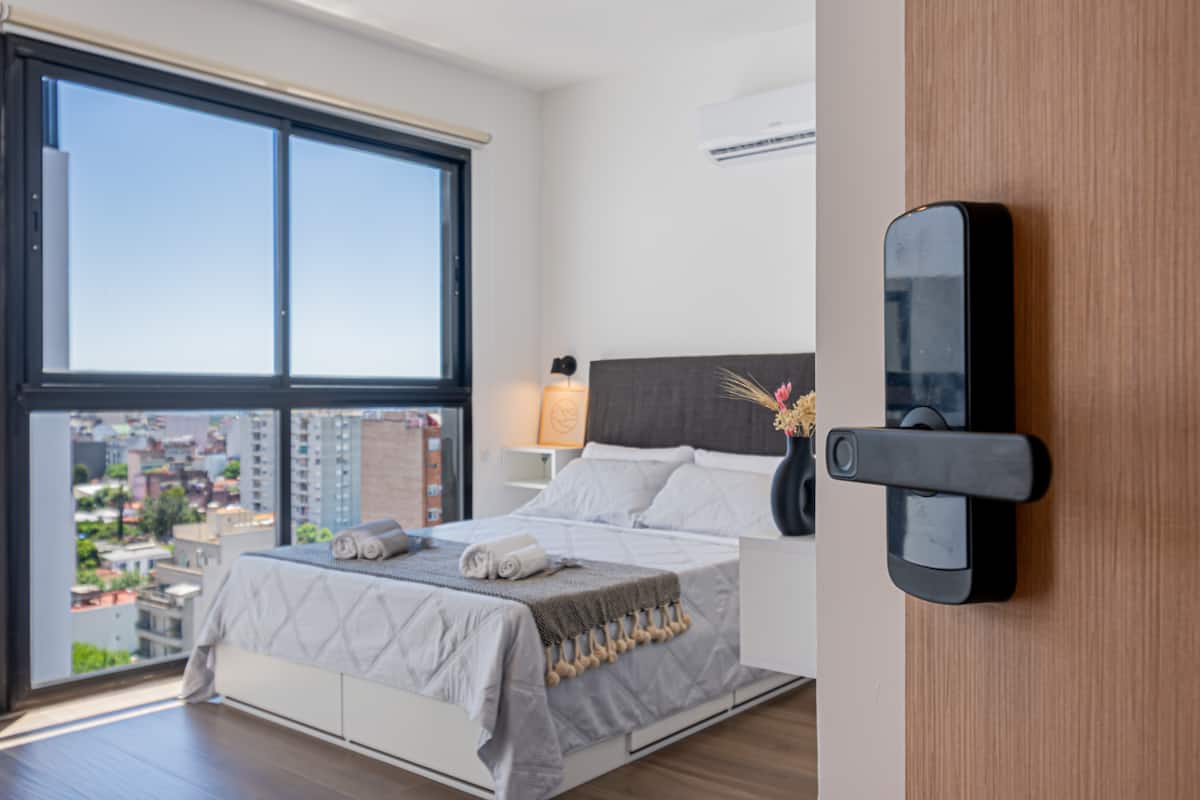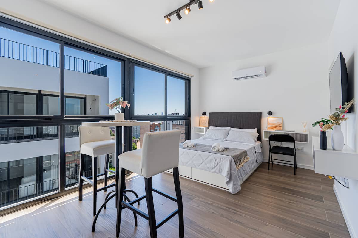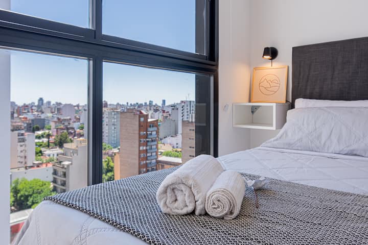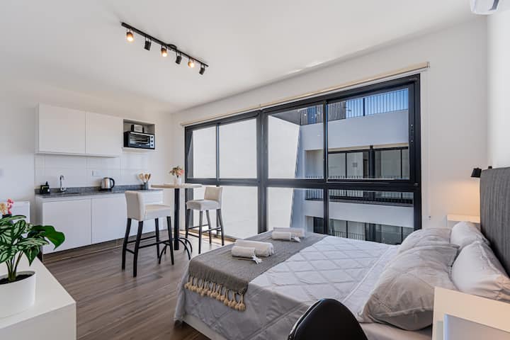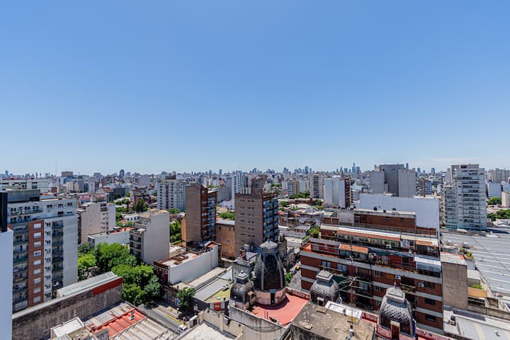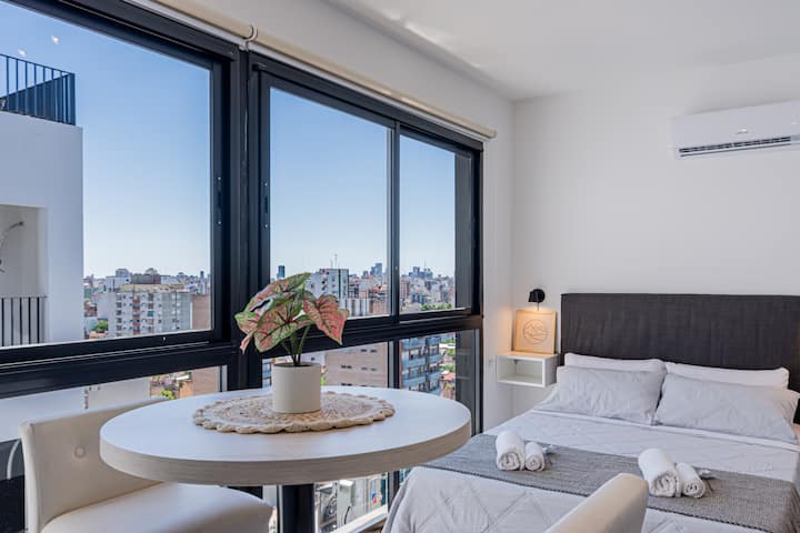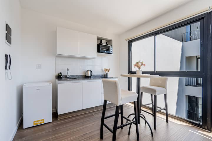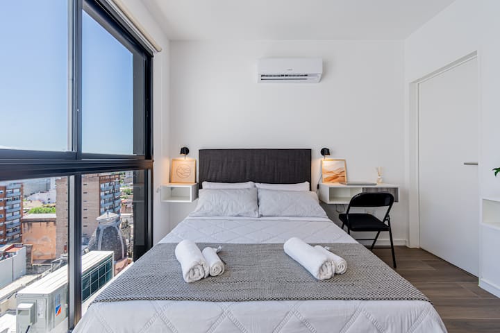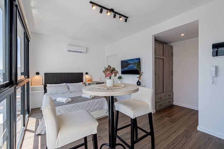 Apartamento de 1 quarto com 23 m², no 14º andar, em edifício novo em San Cristóbal, com vista aberta. Mobiliado para 2 pessoas, com acesso digital ao prédio e ao apartamento, internet Wi‑Fi e TV smart de 43" com Android TV. Cozinha integrada com geladeira com freezer, forno e fogão elétricos, torradeira e chaleira elétrica, além de ar-condicionado split frio e quente e banheiro completo com banheira.