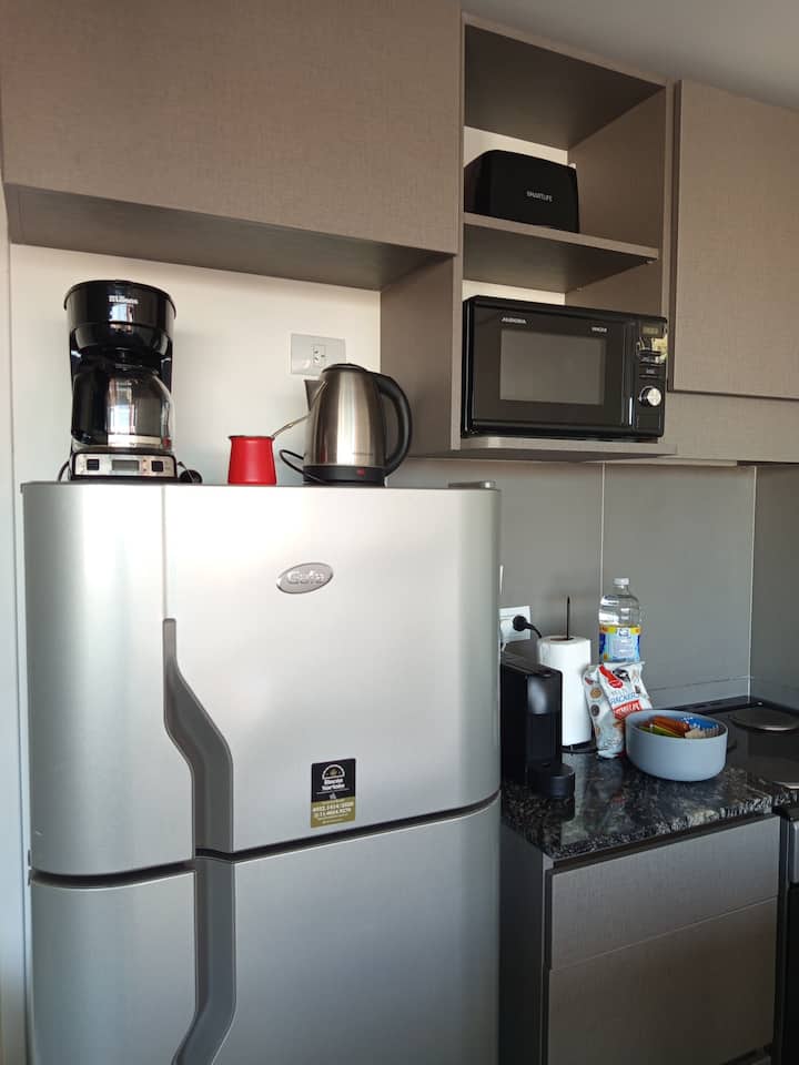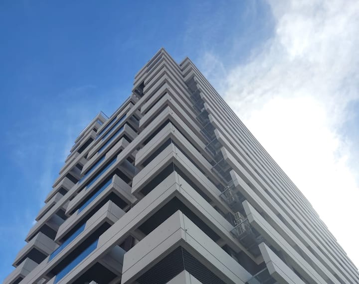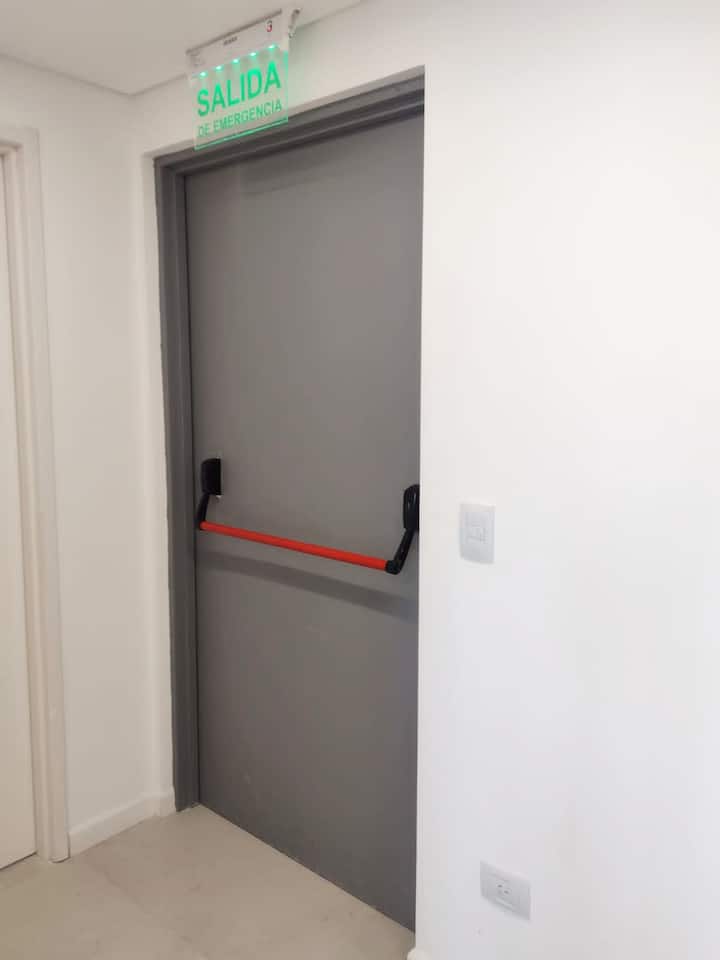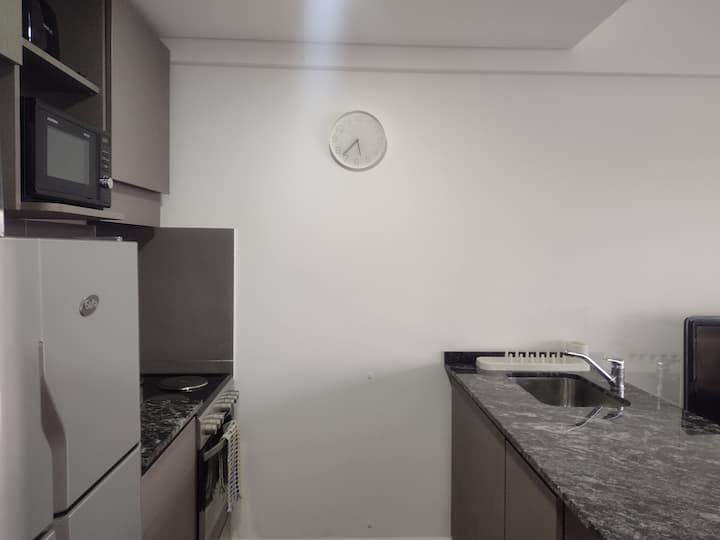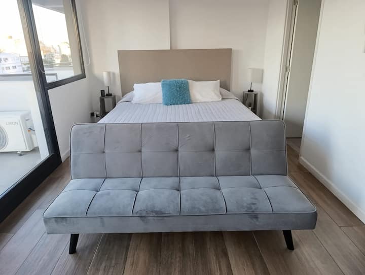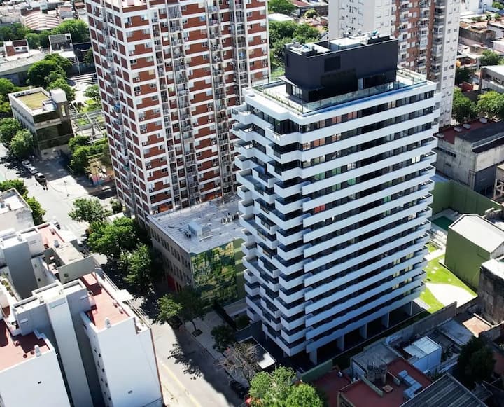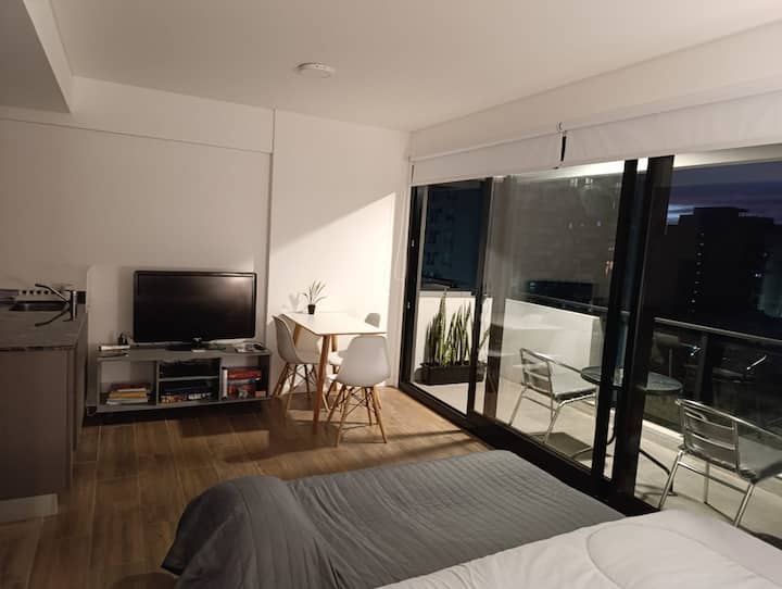 Departamento en una torre en San Cristóbal. Cuenta con 1 dormitorio, balcón y equipamiento para estadías: cama king size, smart TV con Chromecast, máquina Nespresso y WiFi. El edificio dispone de seguridad las 24 horas y tiene estacionamiento en la calle. El acceso a las líneas de Metro E y H es cercano.