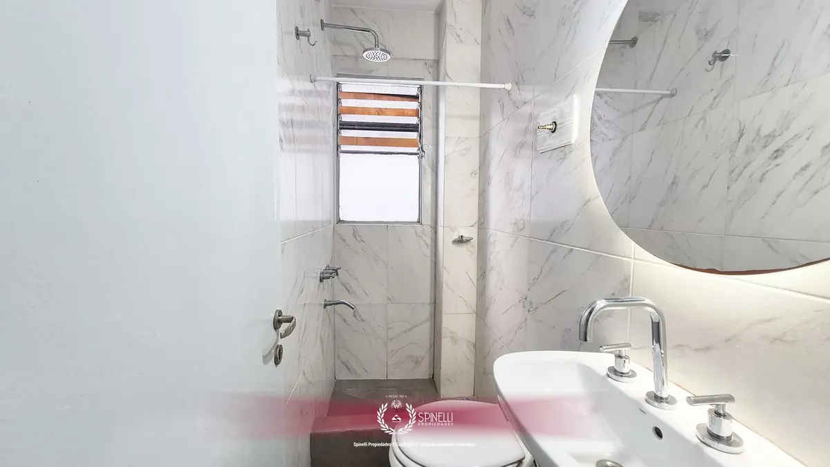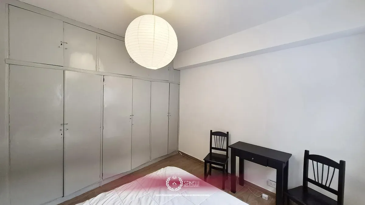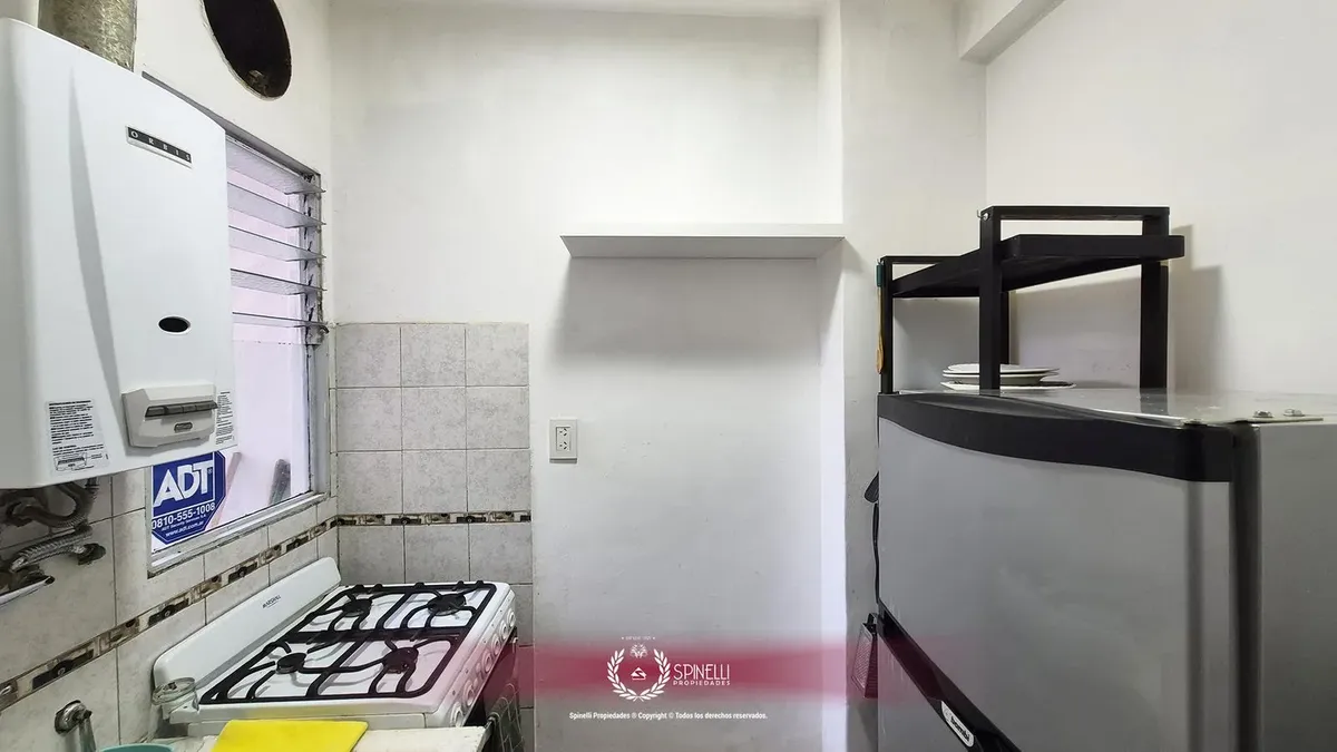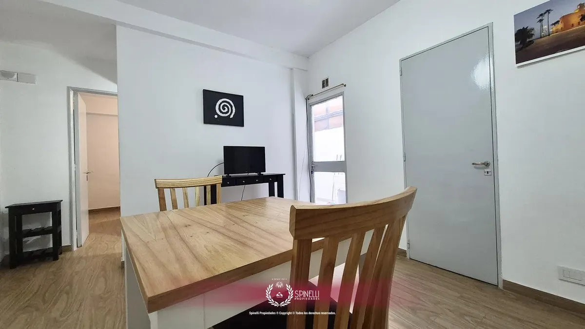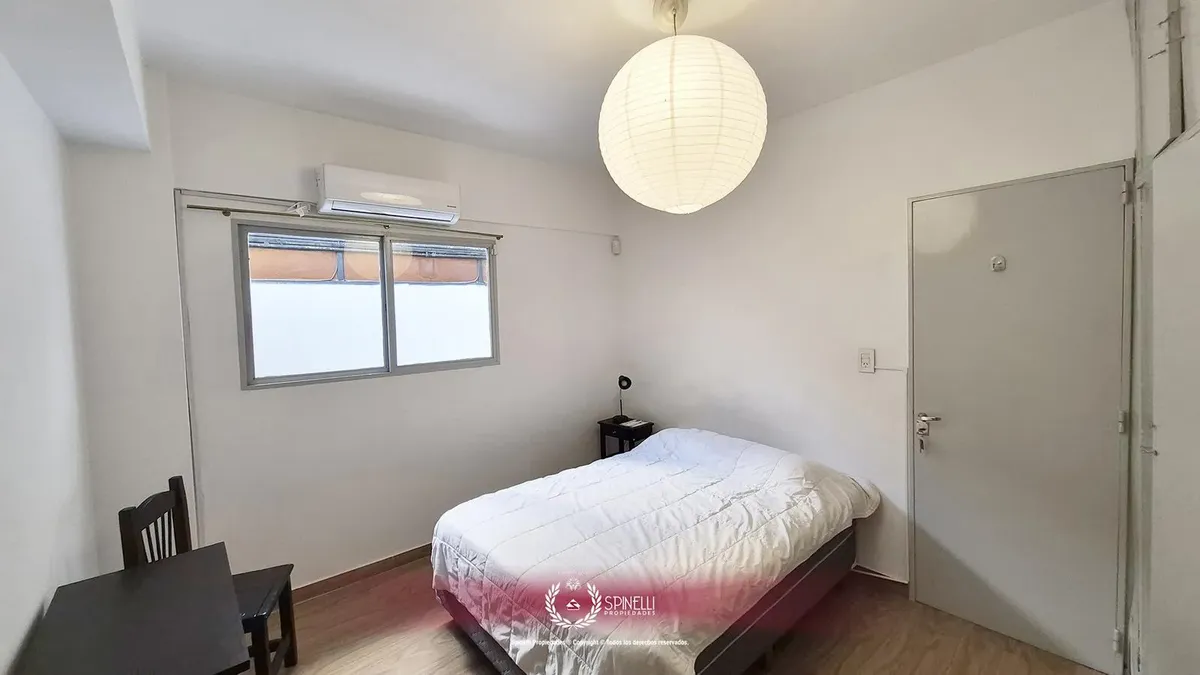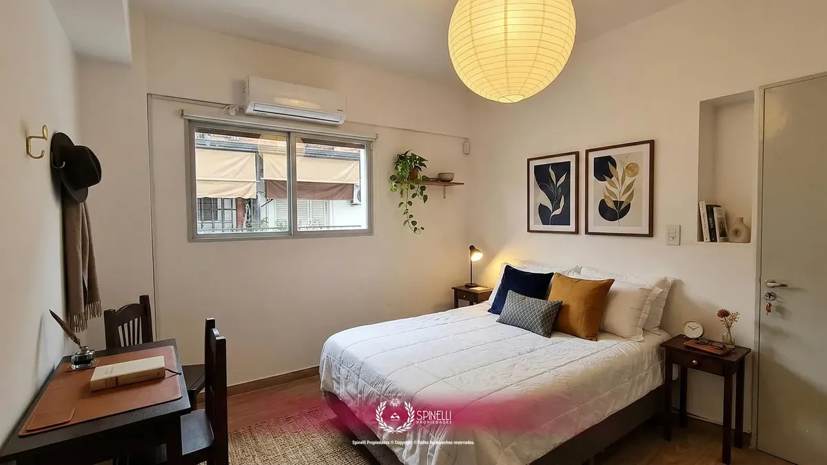 Departamento de 2 ambientes de 45 m² en planta baja, al contrafrente, con patio. Orientación oeste, con ventilación cruzada y aberturas hacia el exterior en todos los ambientes. El edificio es entre medianeras y fue construido en 1974; la fachada combina hormigón pintado, franjas de ladrillo visto y revestimiento de mármol en planta baja. Está a 165 metros de Av. Independencia y a 235 metros de Av. Jujuy. Se alquila con muebles.