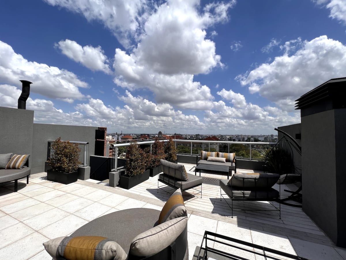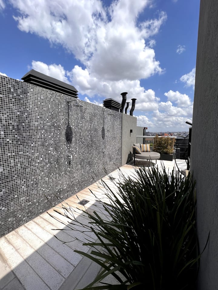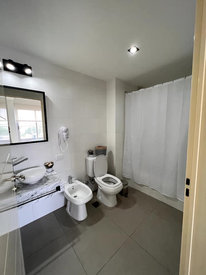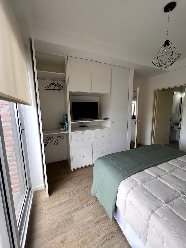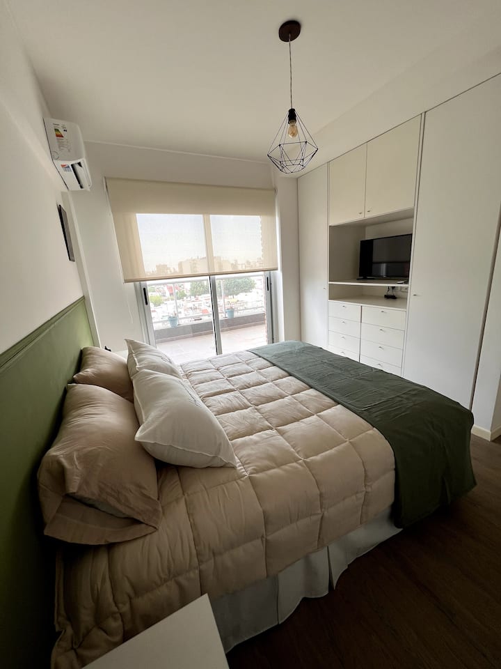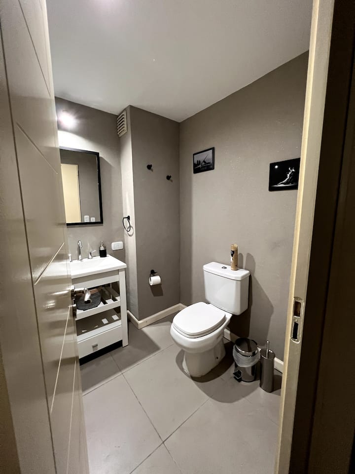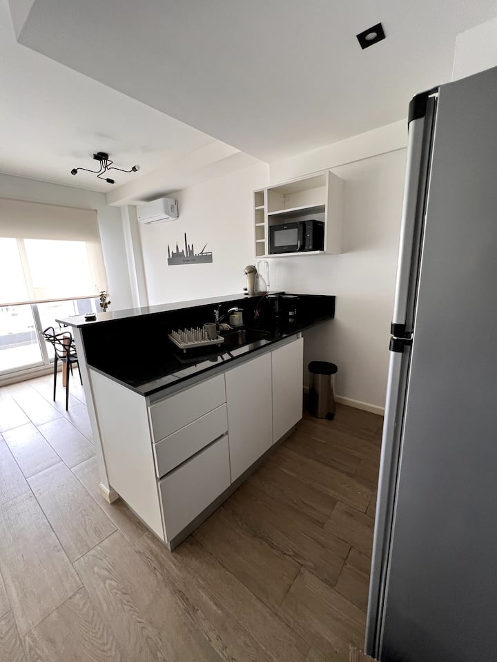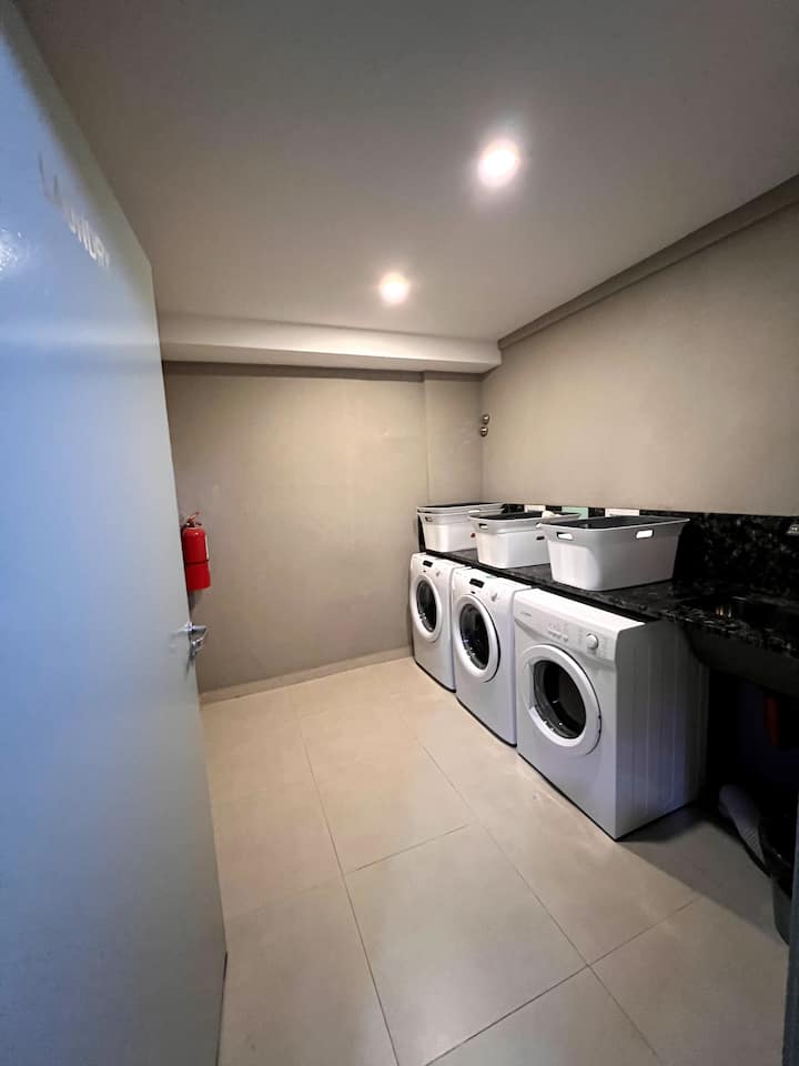 Квартира в San Cristóbal с мебелью и оборудованием: 1 комната с кроватью queen-size и ванной комнатой в suite, также есть зона кухни-гостиной-столовой и туалетный столик. Площадь не указана, в описании фигурирует большой балкон. В квартире есть Wi‑Fi, микроволновая печь, электрический гриль/духовка (hopper), капсульная кофемашина и тостер, а также постельное бельё и полотенца; утюг и гладильная доска, фен, сейф. В здании новая часть на первом уровне, есть лифт; прачечная в полуподвальном помещен