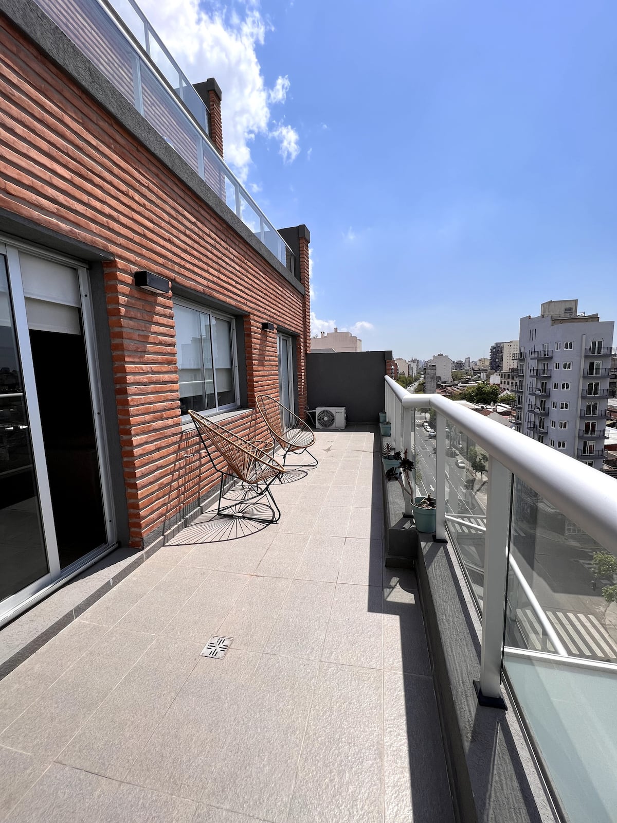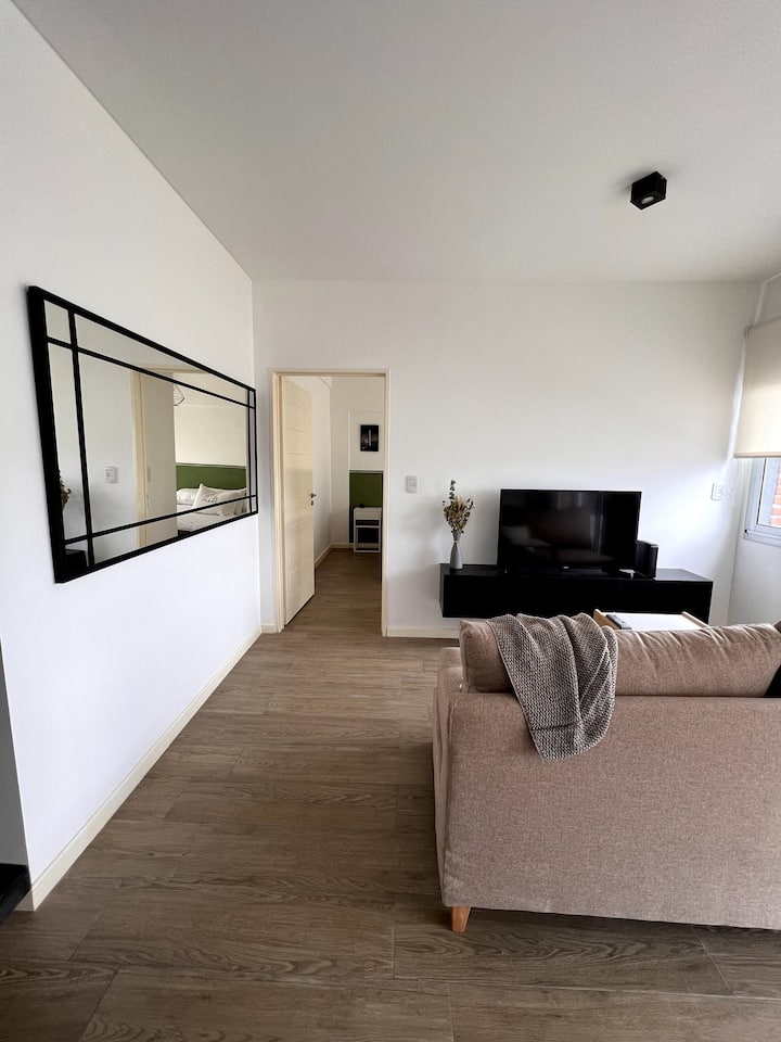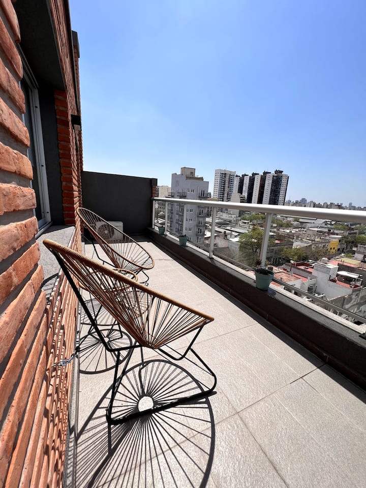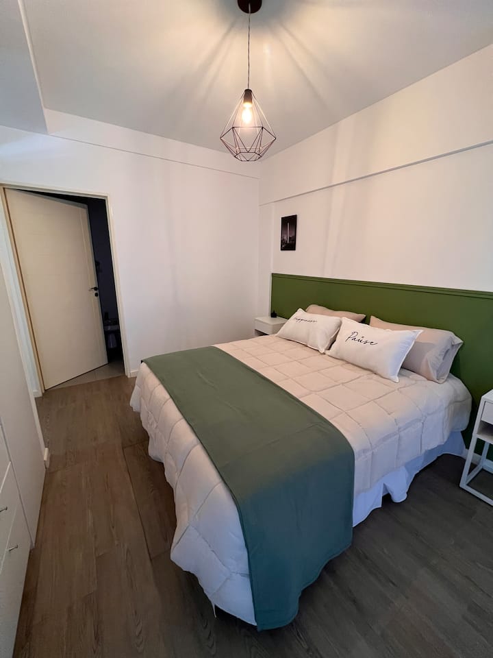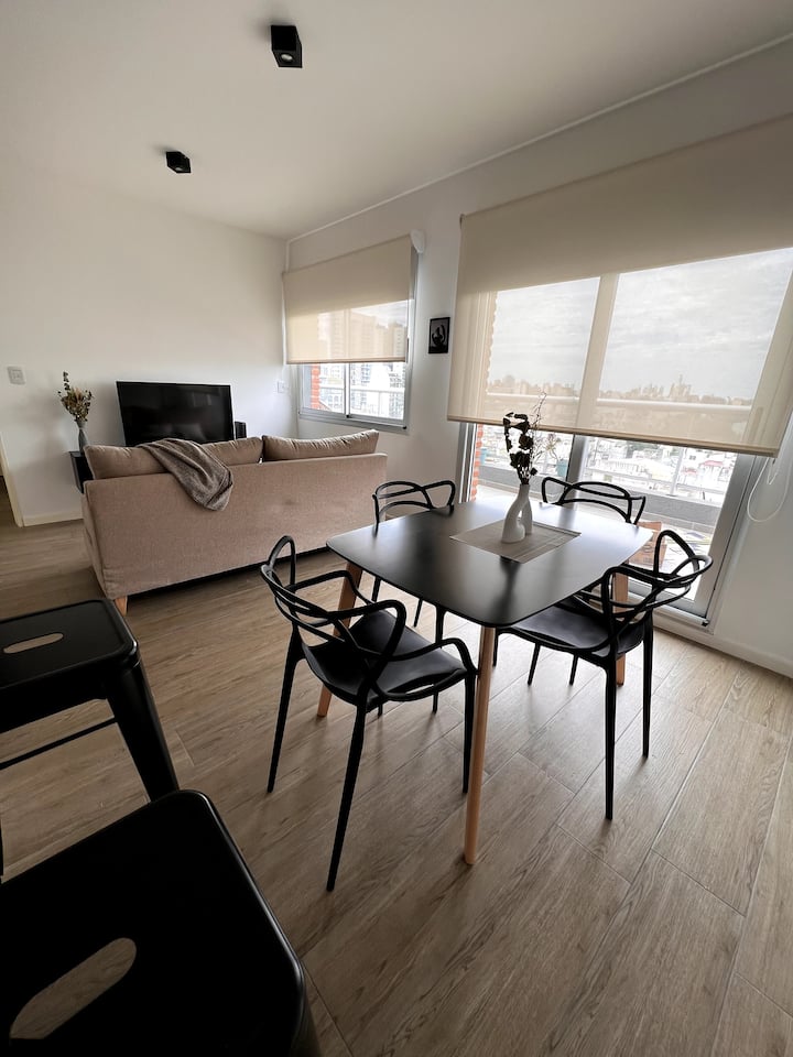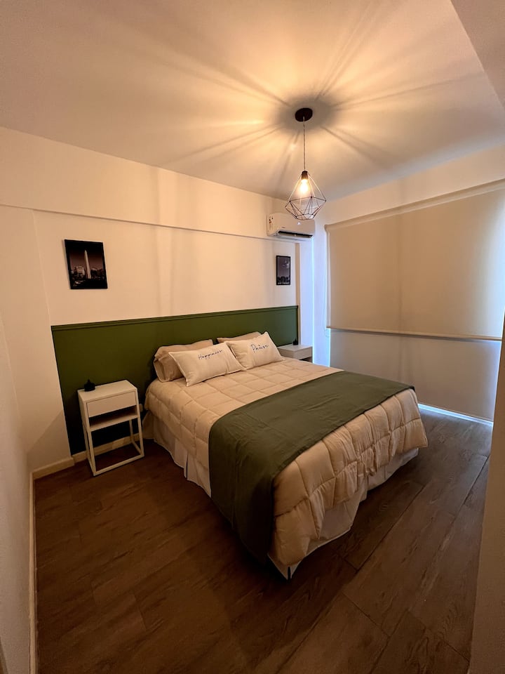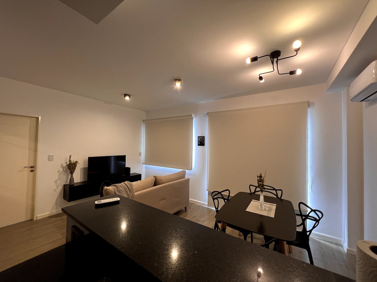 Квартира в San Cristóbal с мебелью и оборудованием: 1 комната с кроватью queen-size и ванной комнатой в suite, также есть зона кухни-гостиной-столовой и туалетный столик. Площадь не указана, в описании фигурирует большой балкон. В квартире есть Wi‑Fi, микроволновая печь, электрический гриль/духовка (hopper), капсульная кофемашина и тостер, а также постельное бельё и полотенца; утюг и гладильная доска, фен, сейф. В здании новая часть на первом уровне, есть лифт; прачечная в полуподвальном помещен