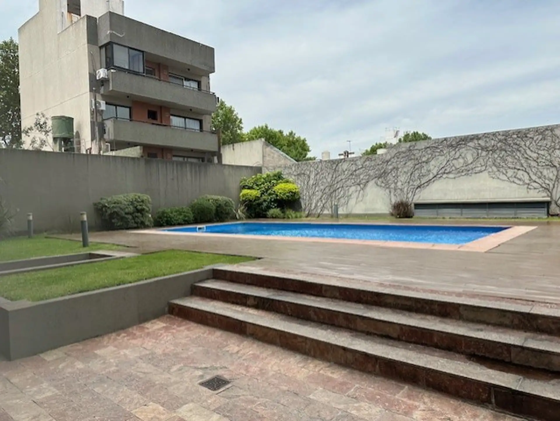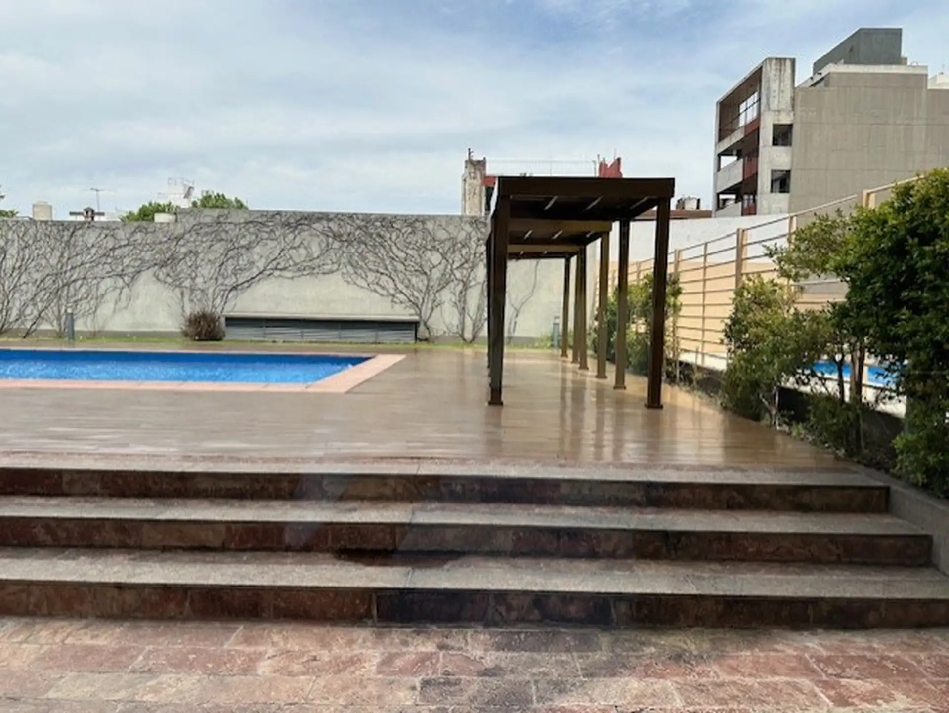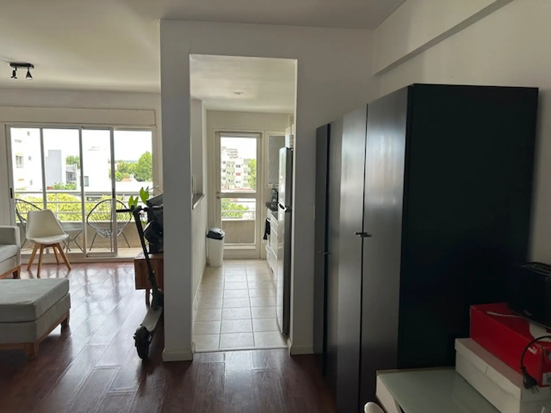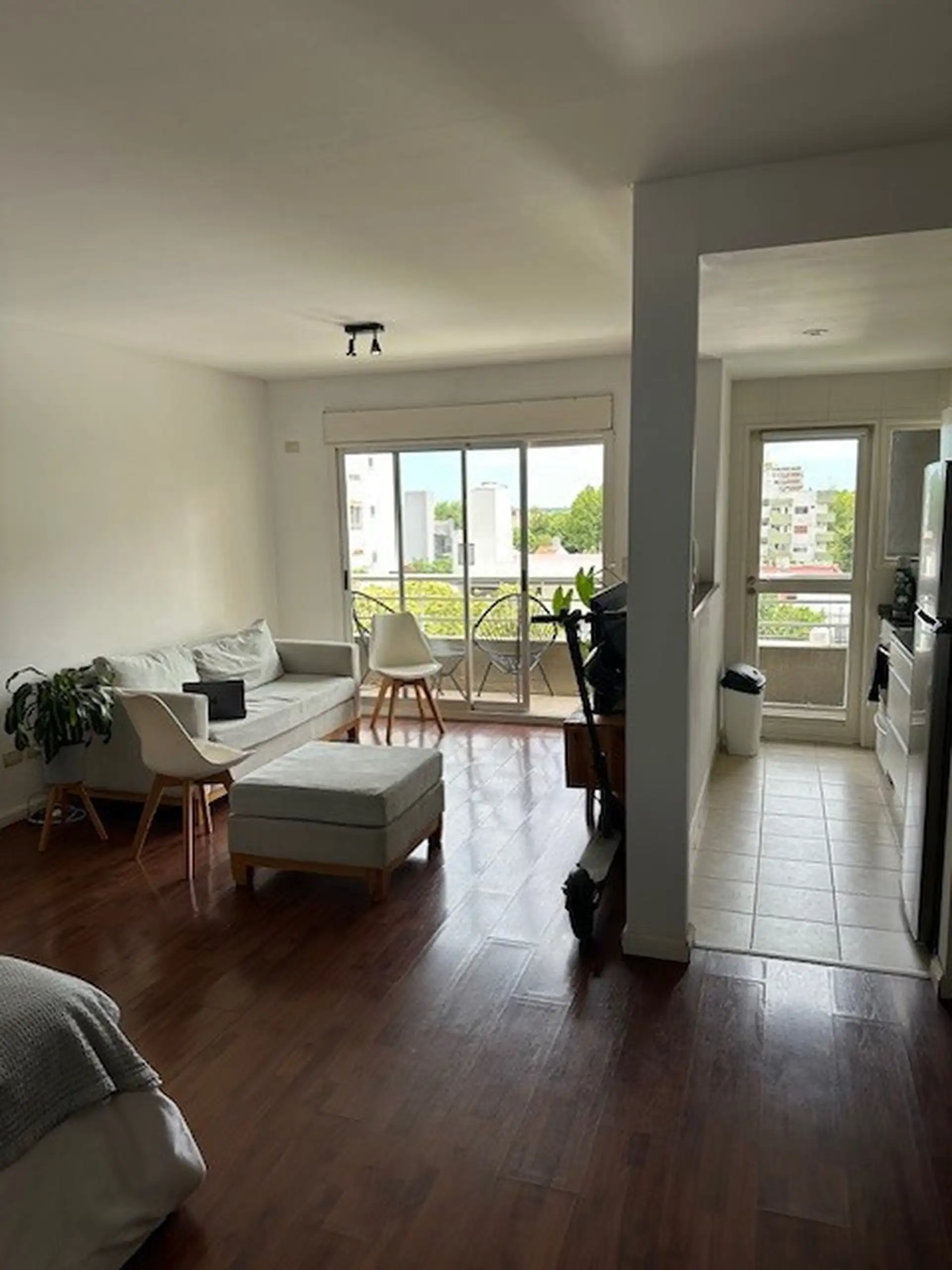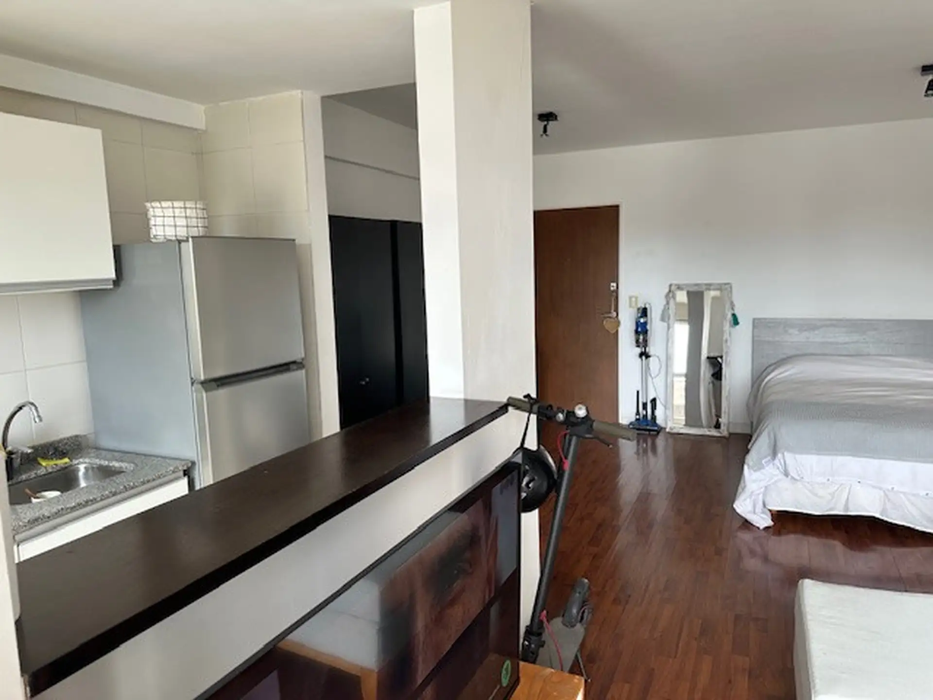 Departamento monoambiente en alquiler en San Fernando, con piso de madera y balcón. Cuenta con calefacción por loza radiante central, agua caliente por calefón y lavadero separado. Tiene cocina con bajo mesada y alacena, barra desayunadora que separa el ambiente, y baño completo con bañera y vanitory. El edificio ofrece pileta de natación, seguridad 24 horas y hall de recepción. Se desocupa a fines de diciembre.