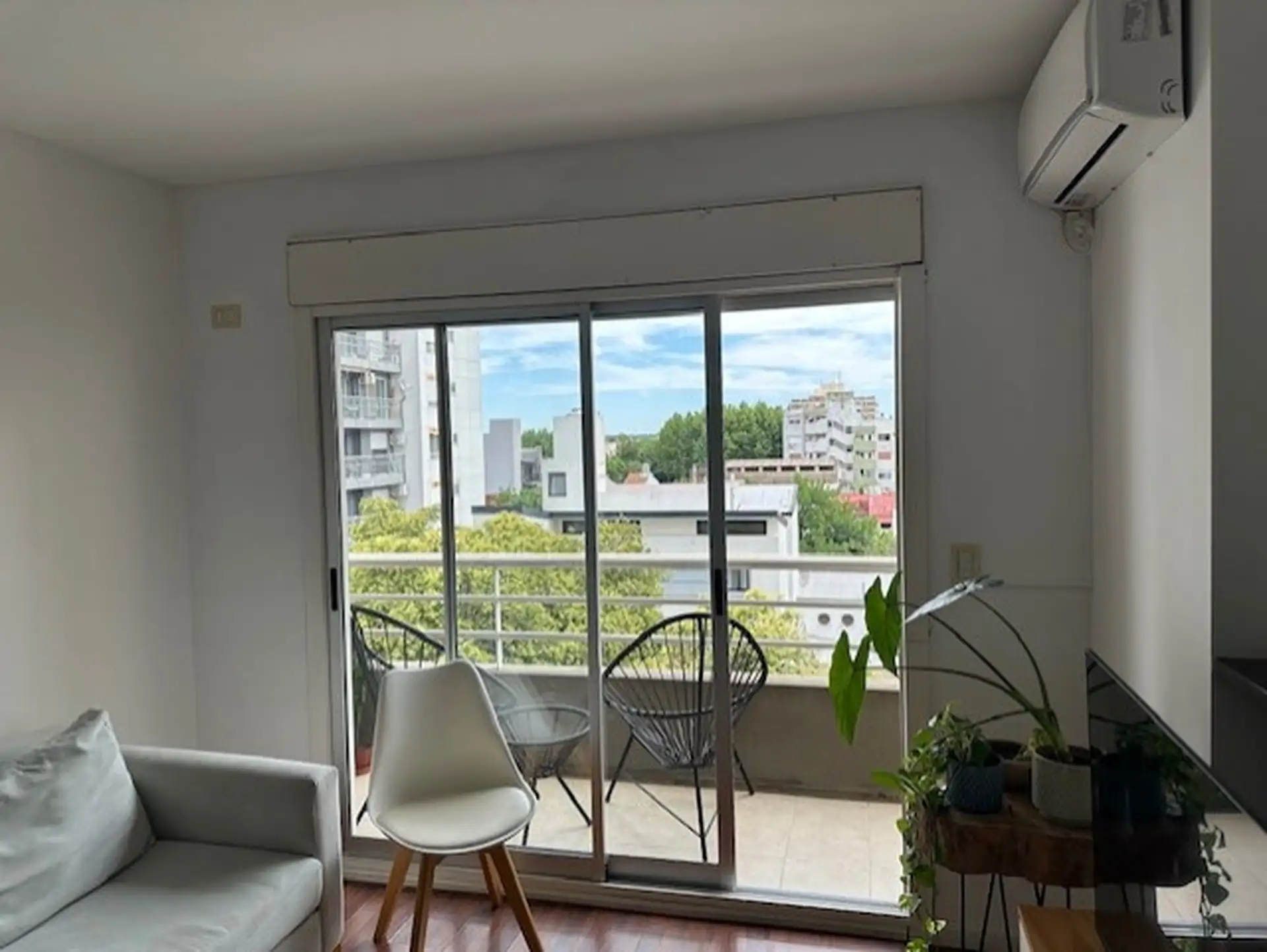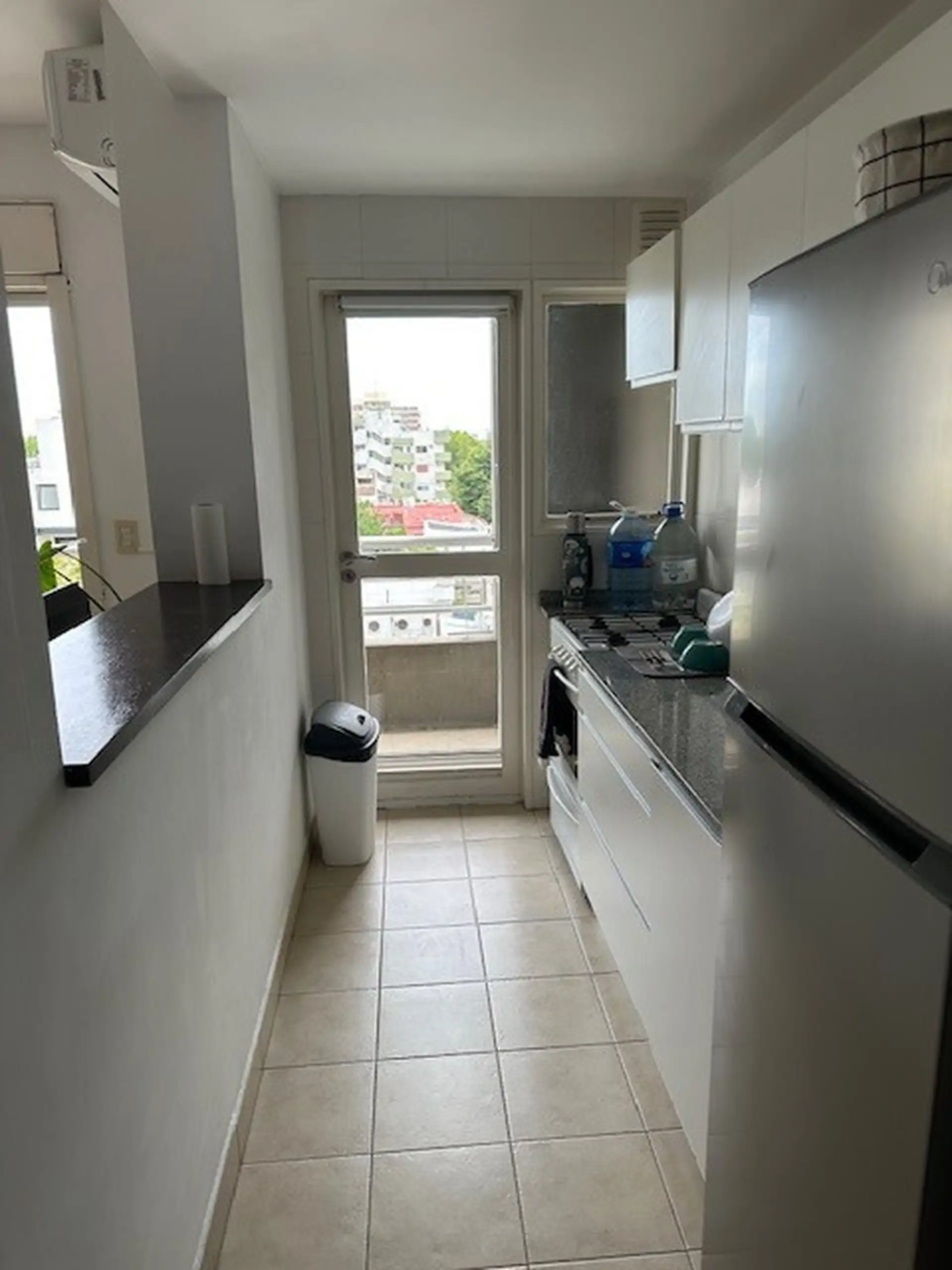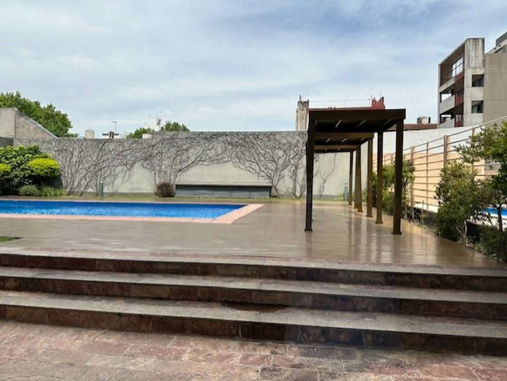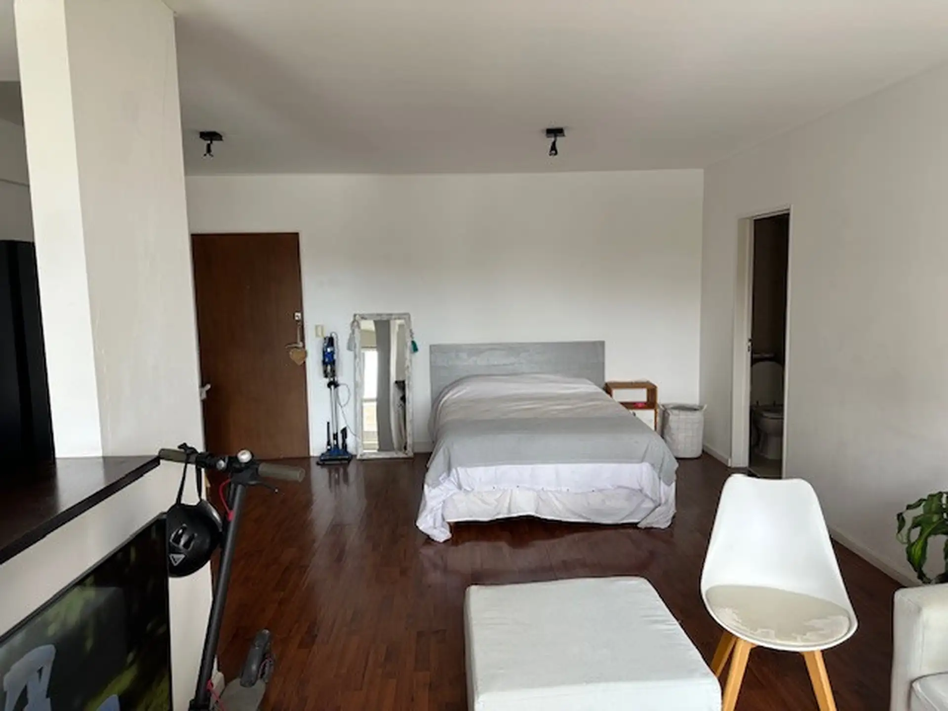 Departamento monoambiente en alquiler en San Fernando, con piso de madera y balcón. Cuenta con calefacción por loza radiante central, agua caliente por calefón y lavadero separado. Tiene cocina con bajo mesada y alacena, barra desayunadora que separa el ambiente, y baño completo con bañera y vanitory. El edificio ofrece pileta de natación, seguridad 24 horas y hall de recepción. Se desocupa a fines de diciembre.