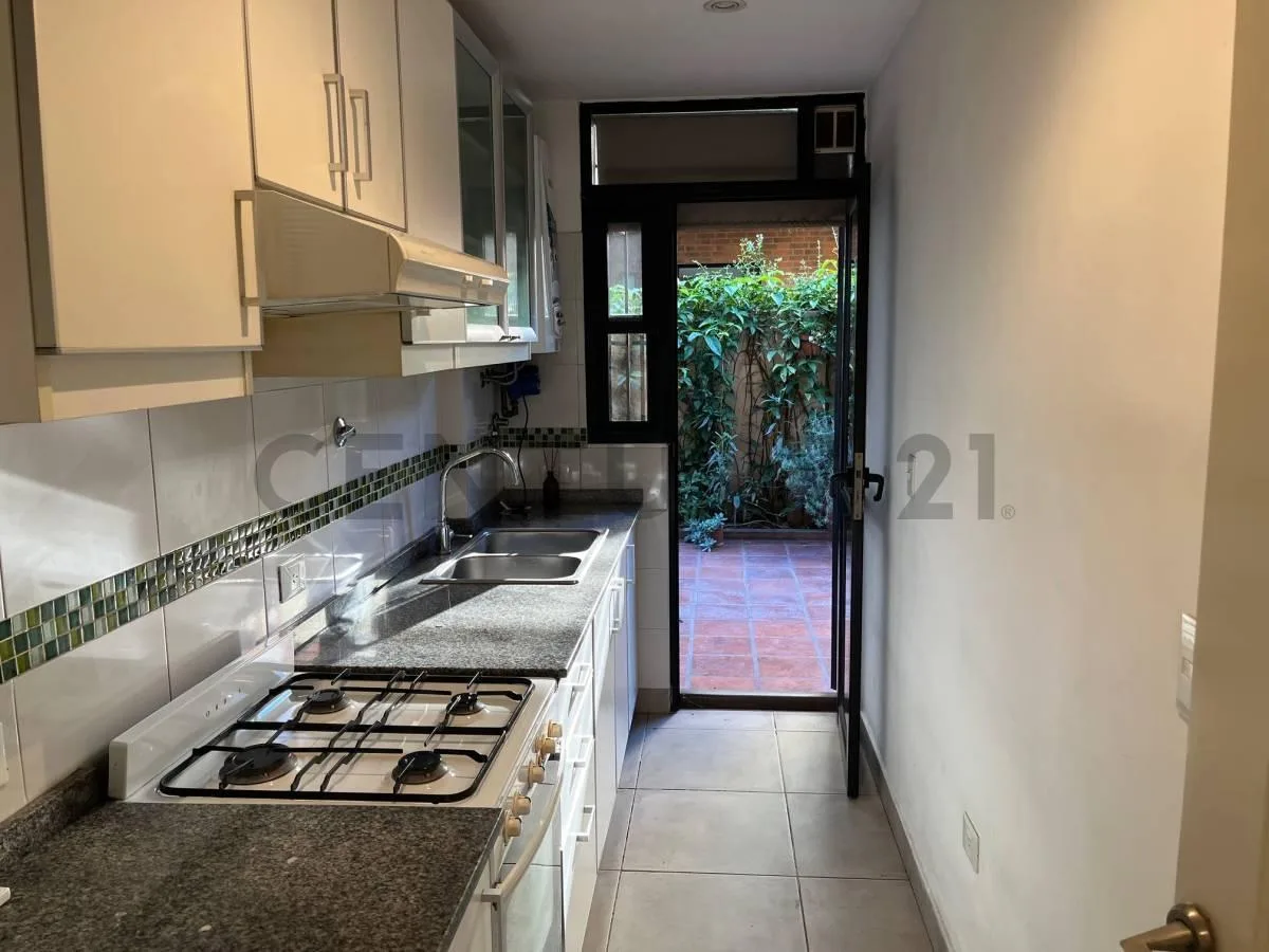 Departamento de 2 ambientes en planta baja, con 1 dormitorio y salida al patio. El dormitorio tiene piso flotante, placard y ventana hacia el patio; el living-comedor cuenta con aire acondicionado frío y calefactor a gas. Cocina separada con pisos cerámicos, alacena y bajo mesada, cocina Orbis y extractor; baño completo con inodoro, bidet y bañera. Patio de 28,50 m², con pileta de lavadero y espacio para conectar lavarropas; cochera fija cubierta y baulera; parrilla en terraza con baño y cocina.