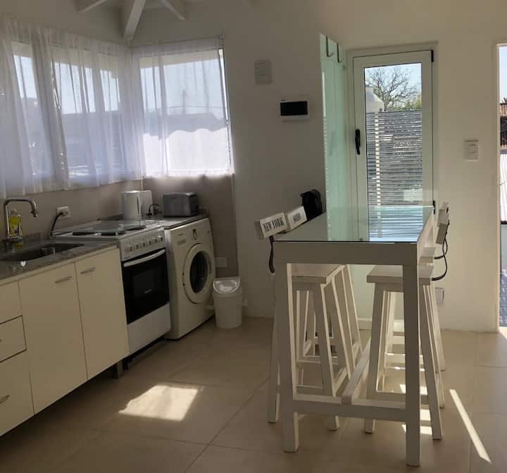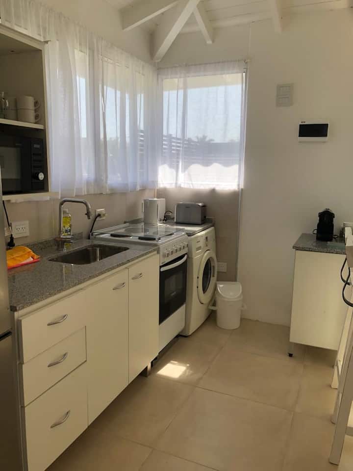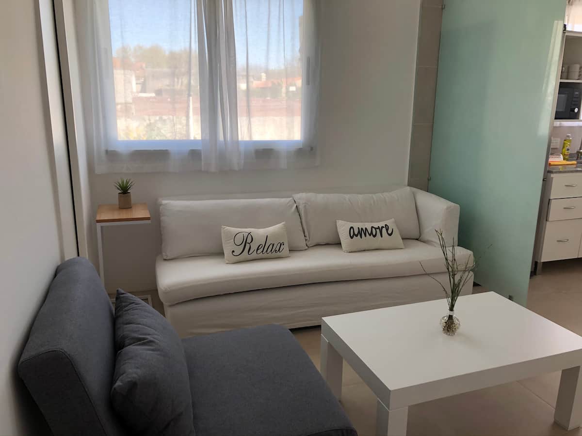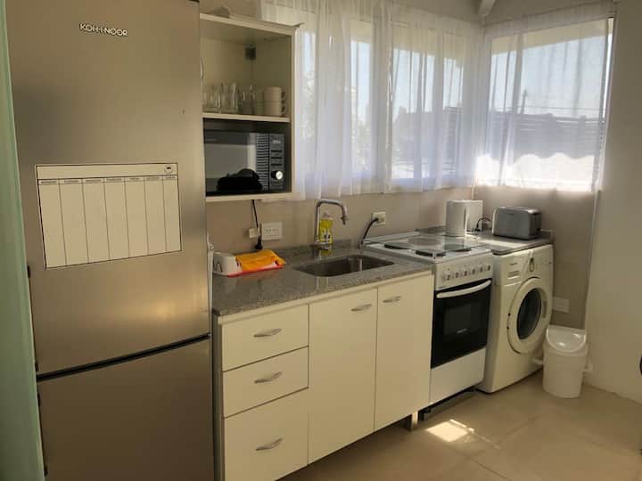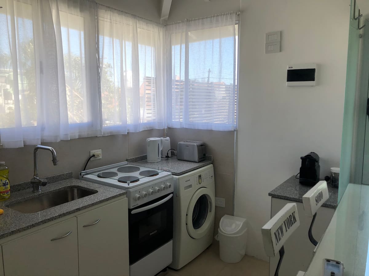 Departamento tipo penthouse en el último piso, en el barrio La Calabria, San Isidro. Tiene 2 ambientes, con ingreso privado a través de un hall propio. Cuenta con Smart TV en el living y en el dormitorio, y con WiFi; incluye sábanas y toallas. Se encuentra a 5 cuadras de Av. Centenario, Av. Rolón y Av. Marqués.