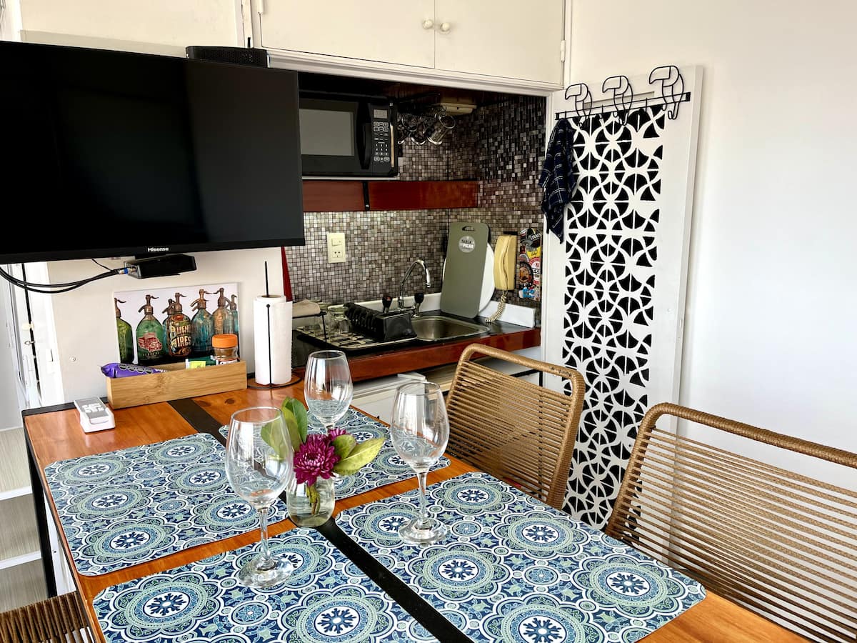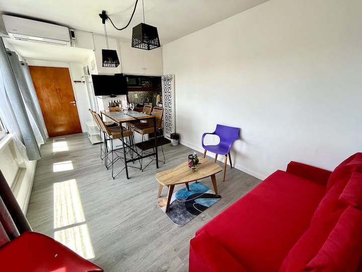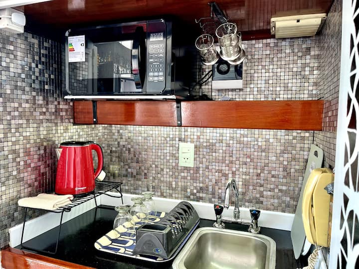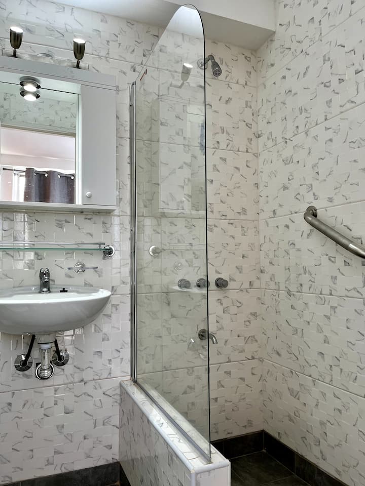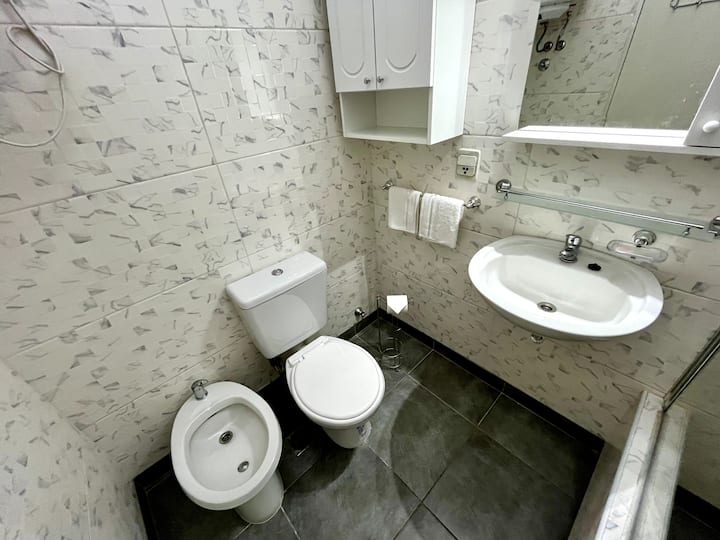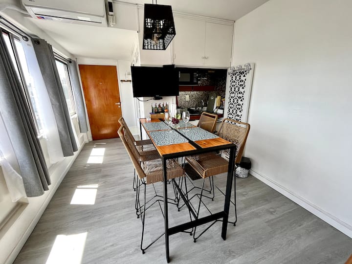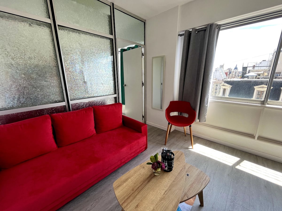 Monoambiente en San Nicolás con vista a Av. Corrientes. Incluye cocina-comedor con heladera, microondas y pava eléctrica, además de utensilios. Cuenta con área de estar con sofá y Smart TV, y un placard. El departamento tiene aire acondicionado en todos los ambientes y baño recientemente reciclado con ducha y bidet. Se ubica a 300 metros del Obelisco y del Teatro Colón.