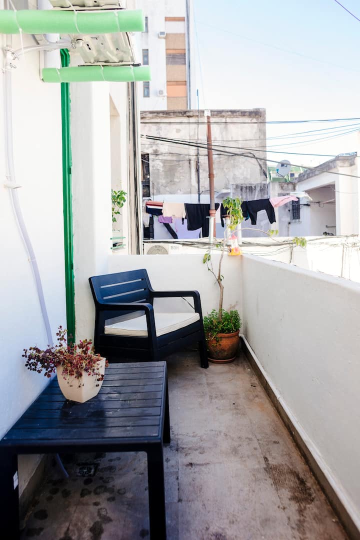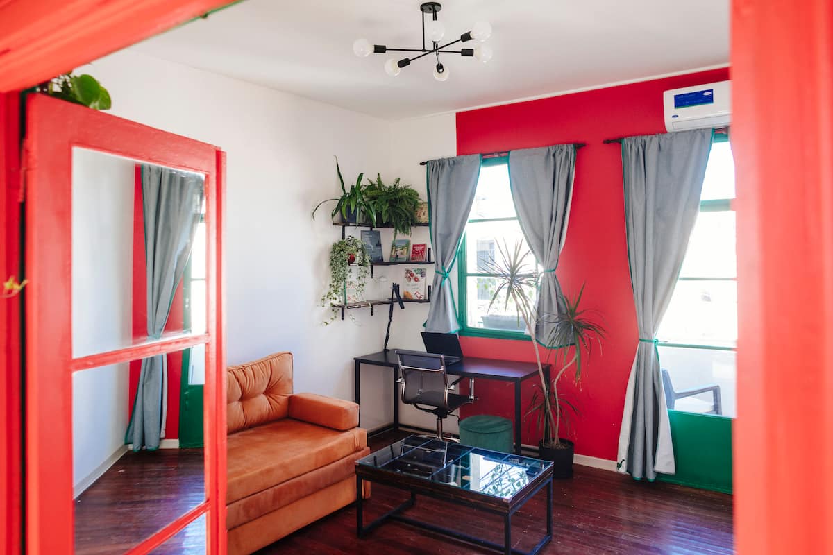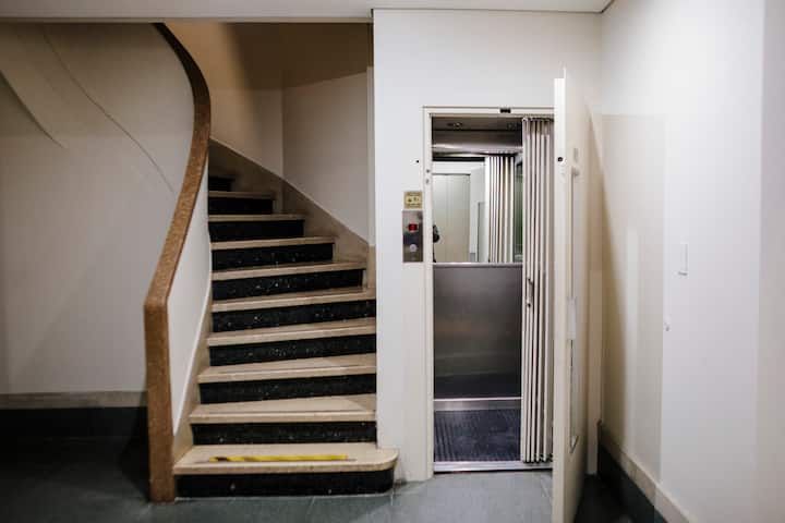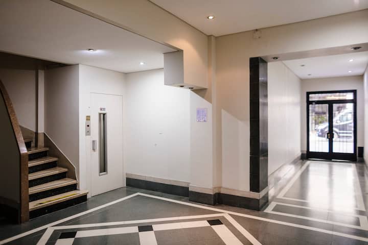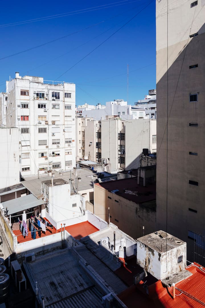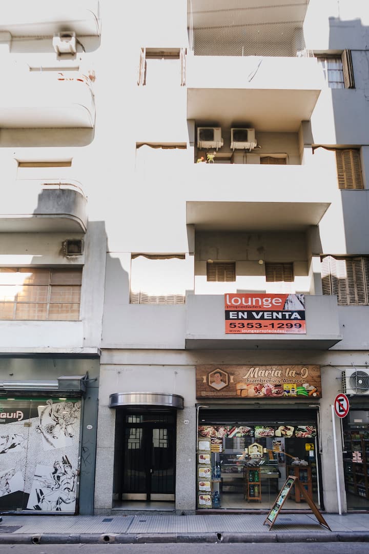 Departamento de 60 m² en el 6to piso de un edificio histórico con ascensor, en San Nicolás. Tiene 1 dormitorio privado, living conectado con cocina totalmente equipada, un home office con salida al balcón y 1 baño con ducha a ras de piso. Cuenta con cama doble en el dormitorio y dos sillones cama en el living y en el office. La cocina incluye cocina eléctrica, horno, cafetera Nespresso, microondas y utensilios de cocina. Dispone de lavarropas, 2 aires acondicionados (en el dormitorio y en el off
