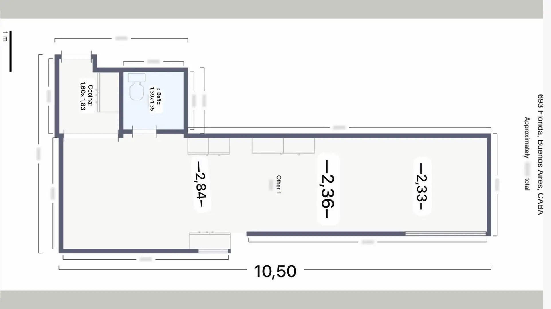 Departamento monoambiente en Microcentro, Centro, en Viamonte 600 esquina Florida. Cuenta con 31,17 m² cubiertos totales: ambiente principal de 26,36 m², cocina independiente y baño completo. Dispone de balcón semicubierto de 1,73 m².