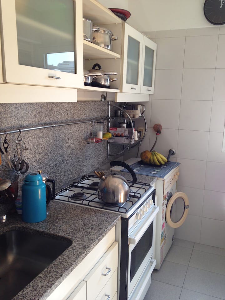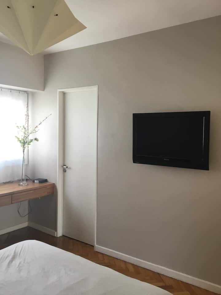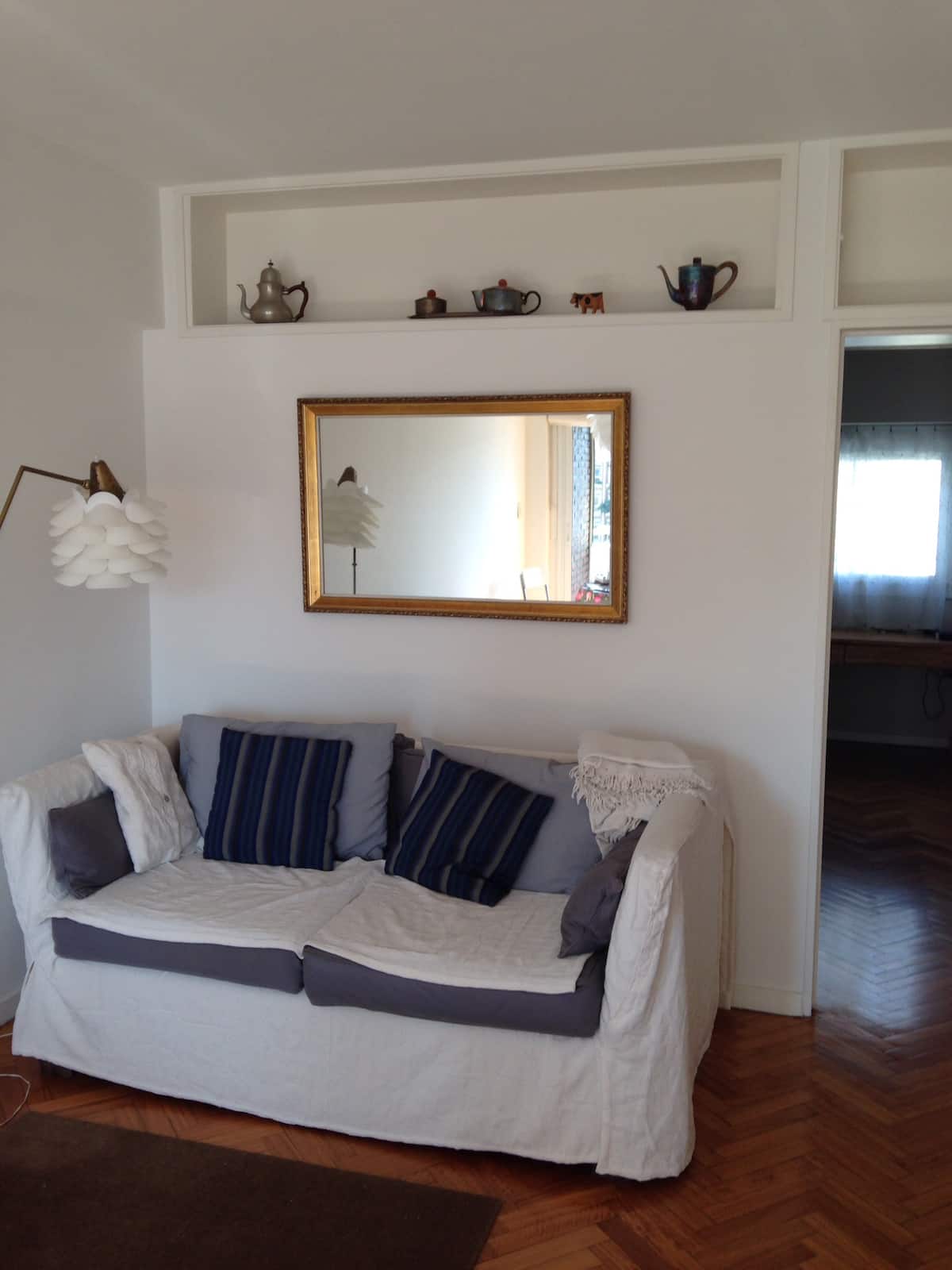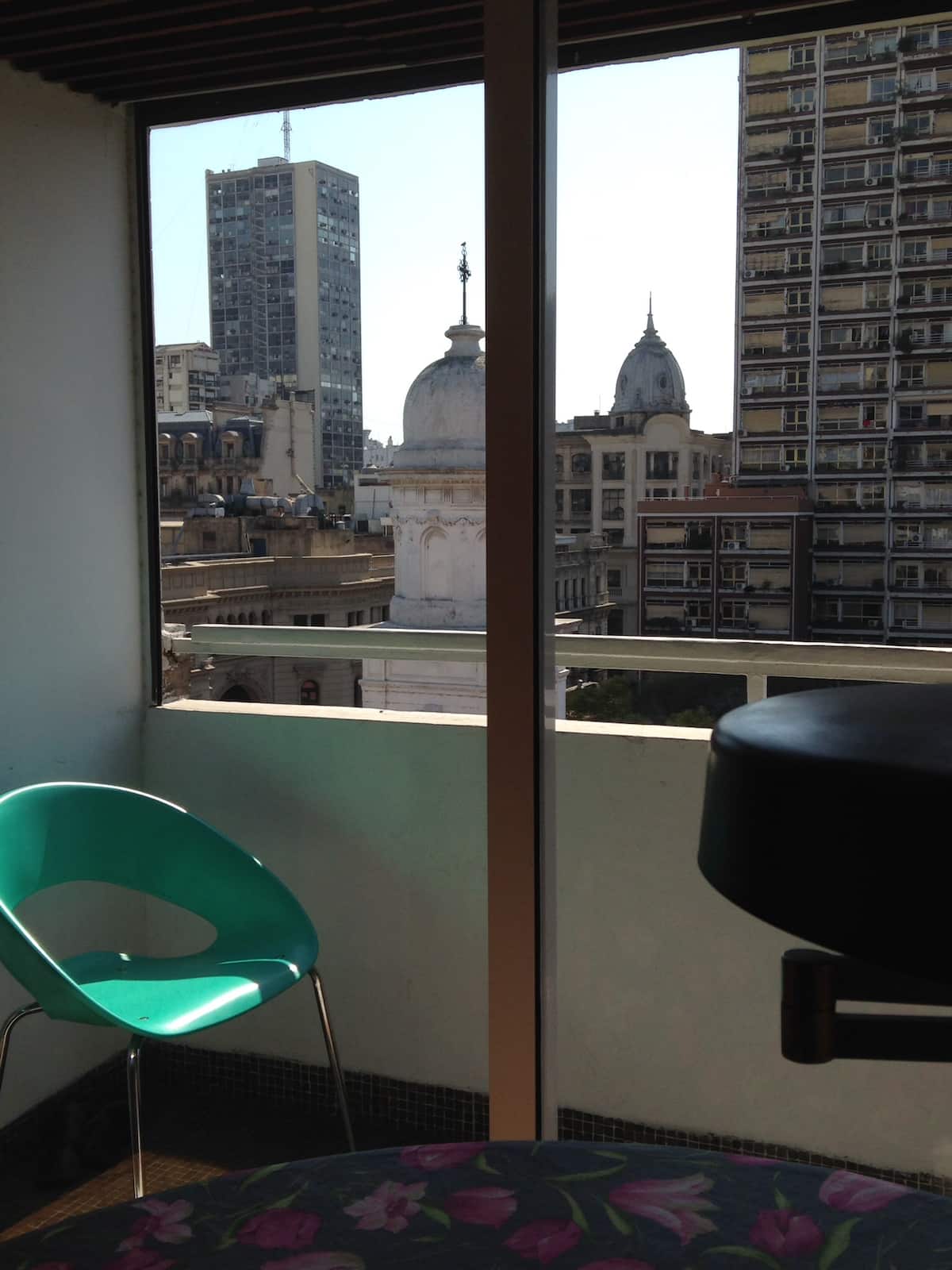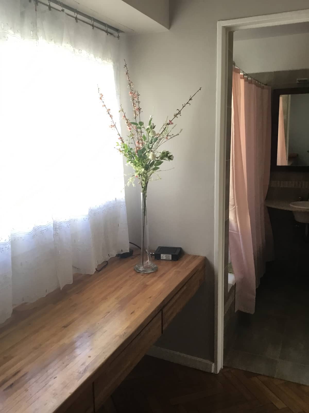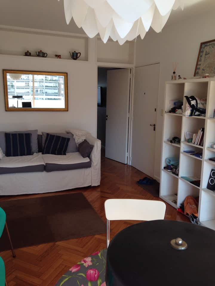 Квартира с 1 спальней площадью не указана, полностью меблирована, с окнами с видом. Отдельная кухня с выходом на балкон; вид на Galerías Pacífico. В описании указано, что в шаговой доступности Av. Florida и что рядом находится монастырь 1727 года, в котором сохранился внутренний дворик (клуатр), переоборудованный под ресторан.