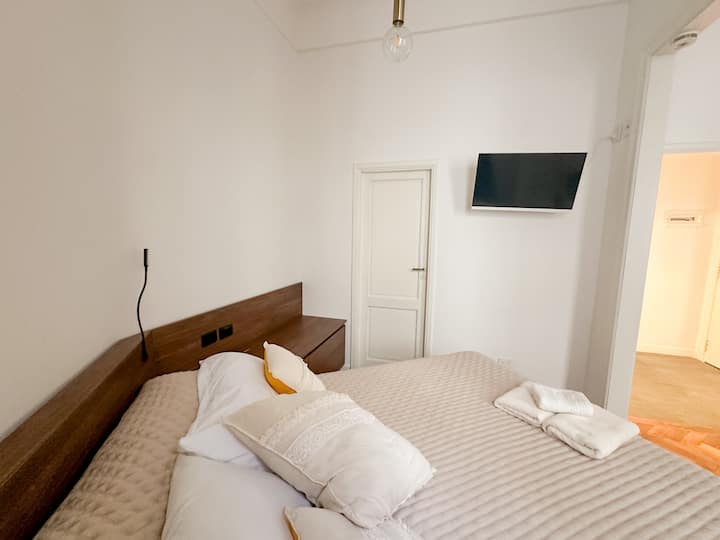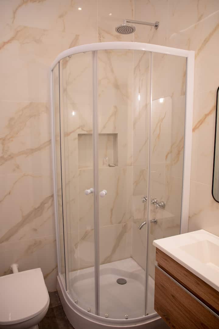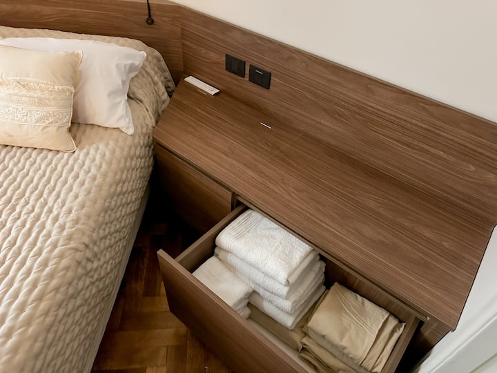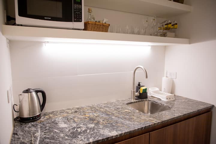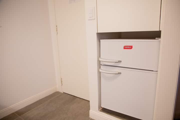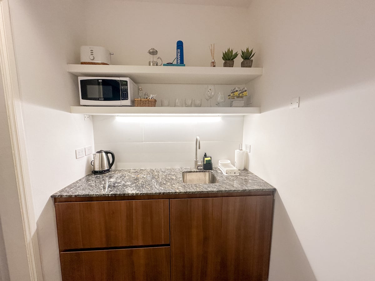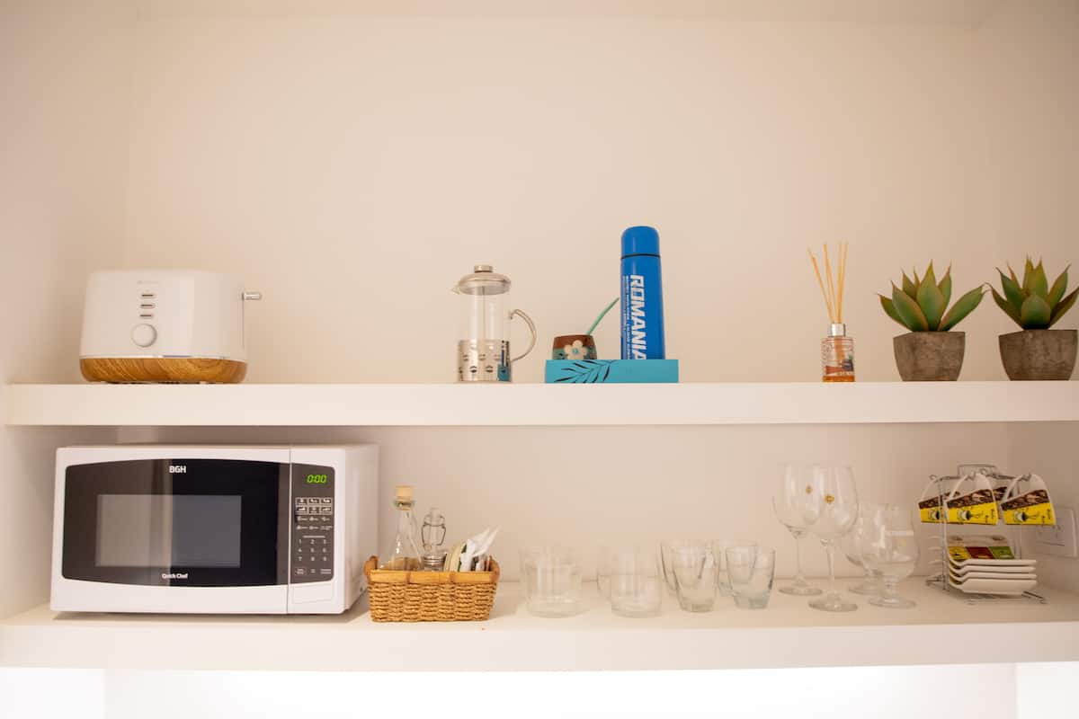 Departamento de 2 ambientes con 1 dormitorio y 1 baño, en el 8vo piso. Se ofrece amoblado para hasta 3 personas: 1 cama queen y 1 sillón de 1,95 m. Cuenta con TV y Wi-Fi de alta velocidad. El área de cocina tiene heladera con freezer, microondas, tostadora, pava eléctrica y cafetera de prensa. No tiene horno ni anafe/quemadores. En el dormitorio hay mesa de luz y cama queen. Baño completo con artículos de tocador.