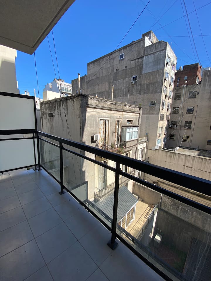 Departamento en un edificio nuevo, en San Nicolás. Tiene 1 dormitorio, balcón al contrafrente y 1 baño completo con bañera y bidet. Está a 2 cuadras del Teatro Colón, a 3 cuadras de Av. Corrientes y a 4 cuadras de Av. Santa Fe. A 50 metros de dos plazas con espacio verde.