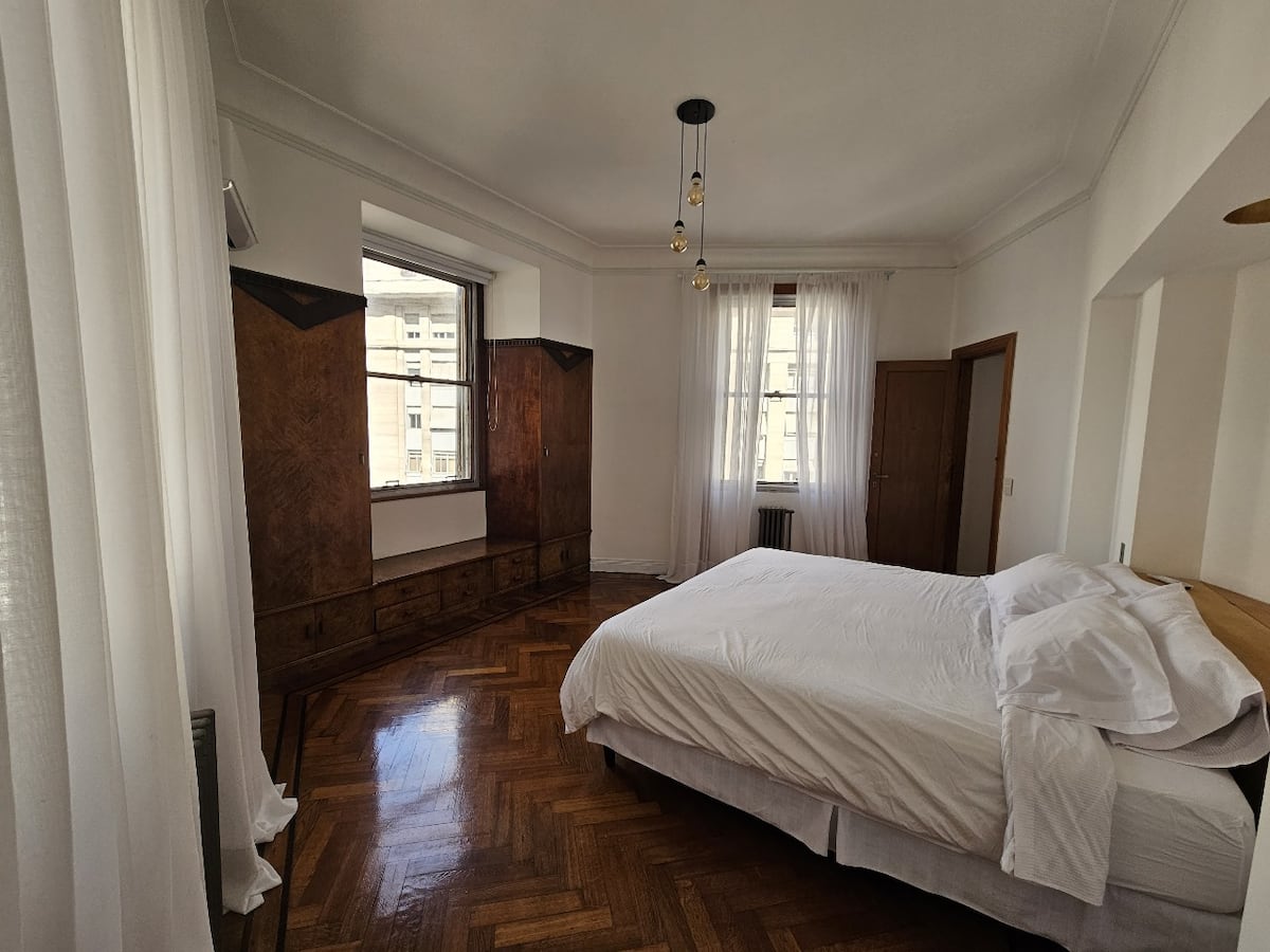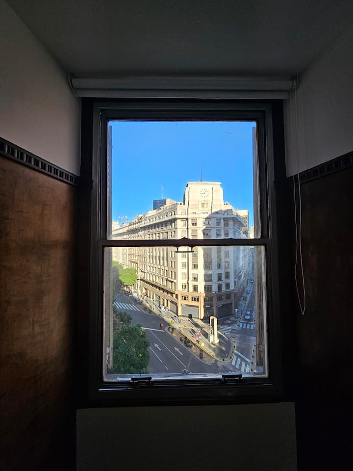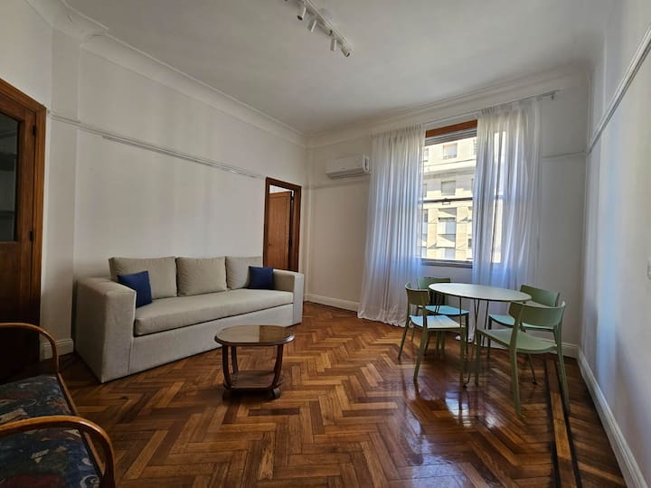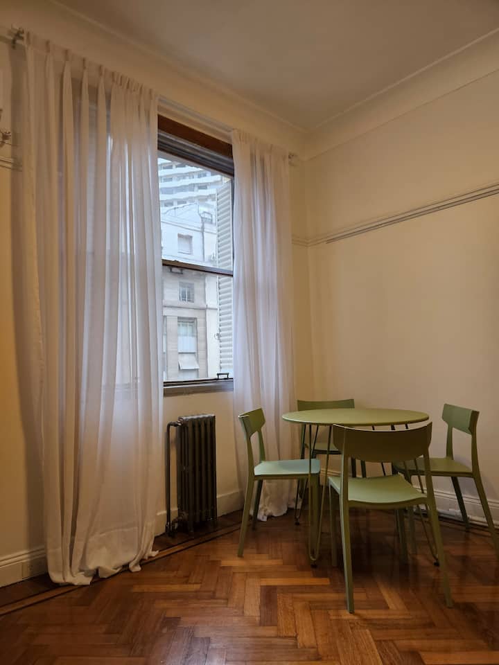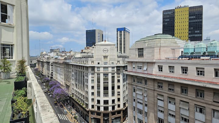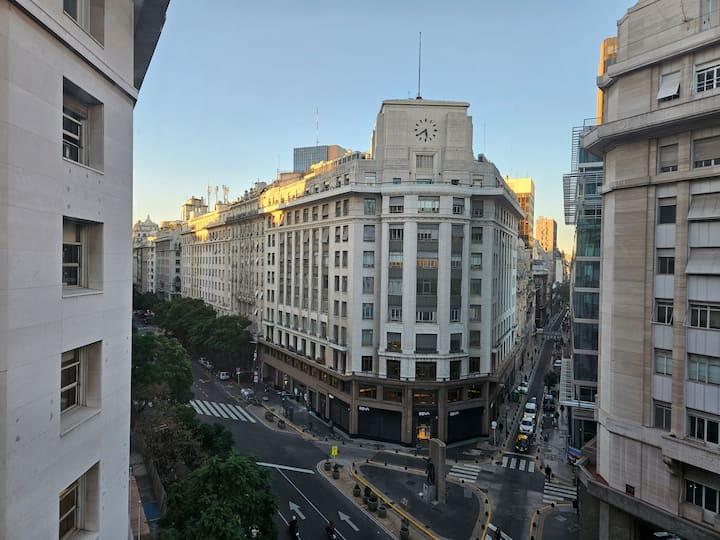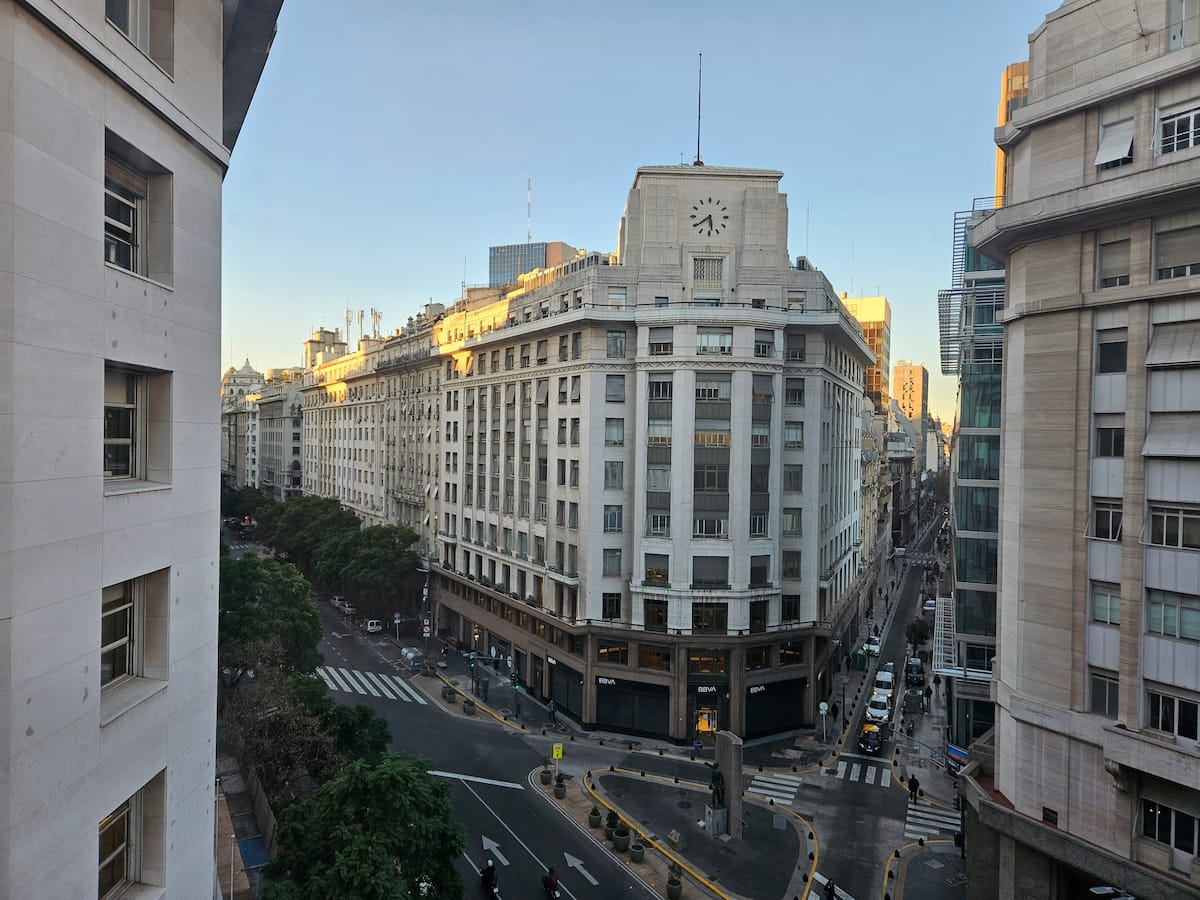 Departamento de 2 ambientes en un edificio de época en el centro de Buenos Aires, de 1933. Cuenta con techos altos y pisos de madera. Ventanales grandes con vista a la Av. Roque Sáenz Peña y al recorrido hacia Plaza de Mayo. Fue reciclado durante varios meses con una restauración que respetó elementos originales.