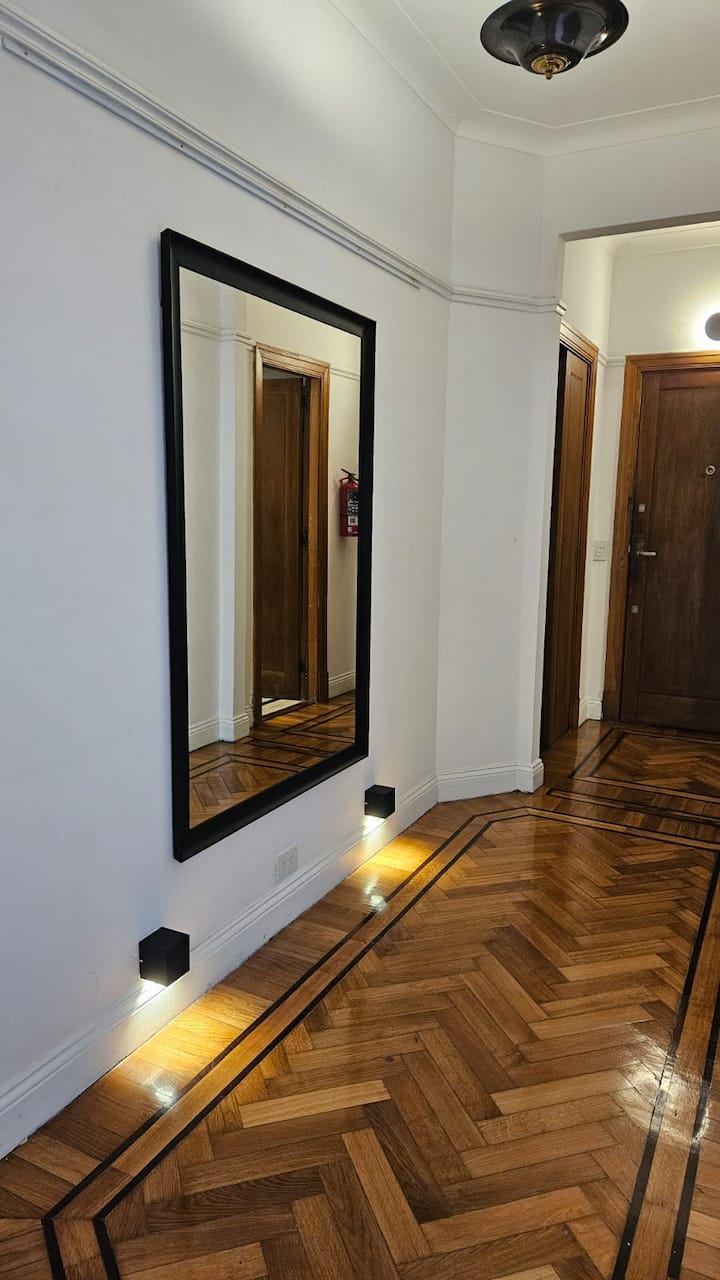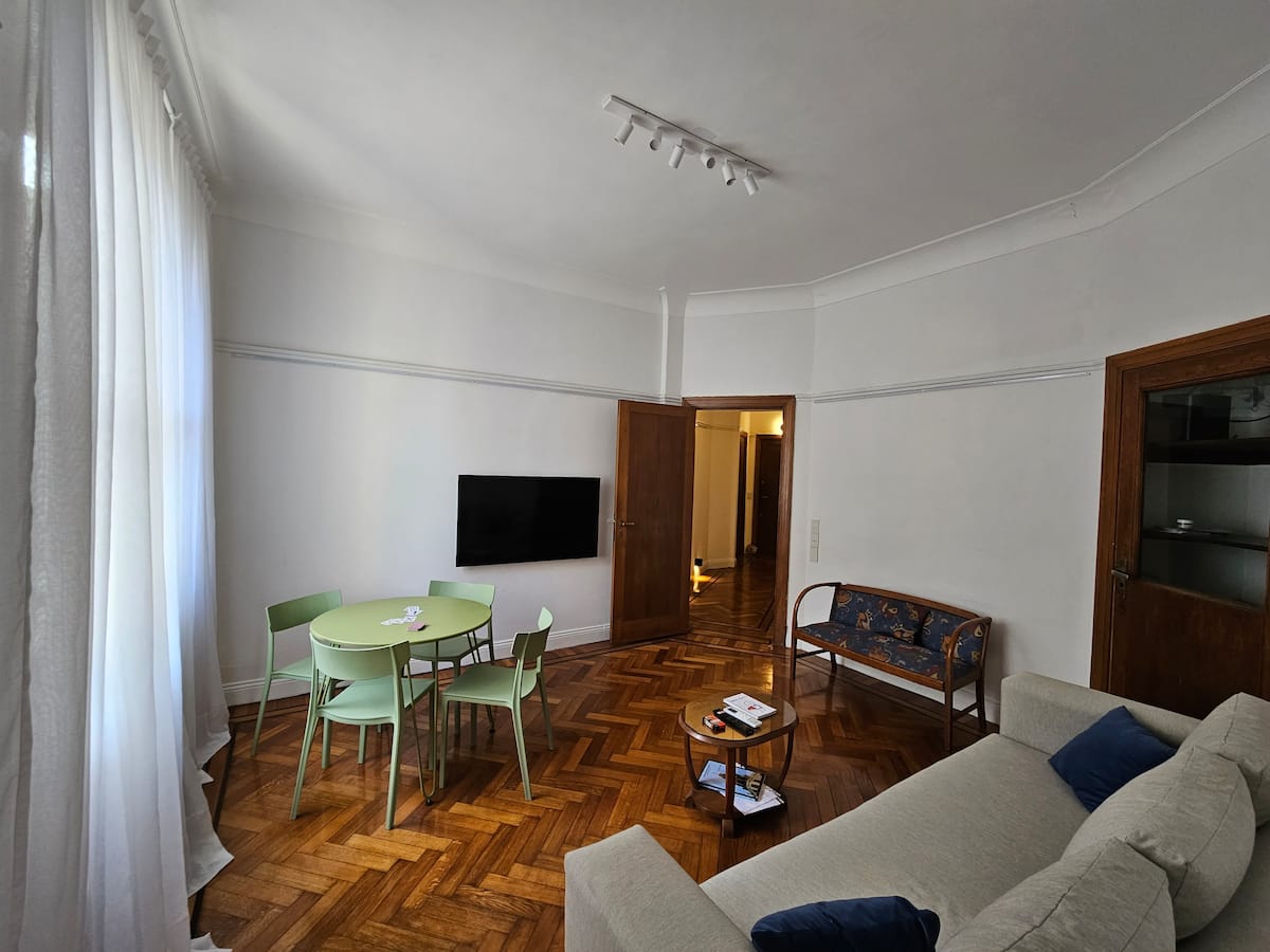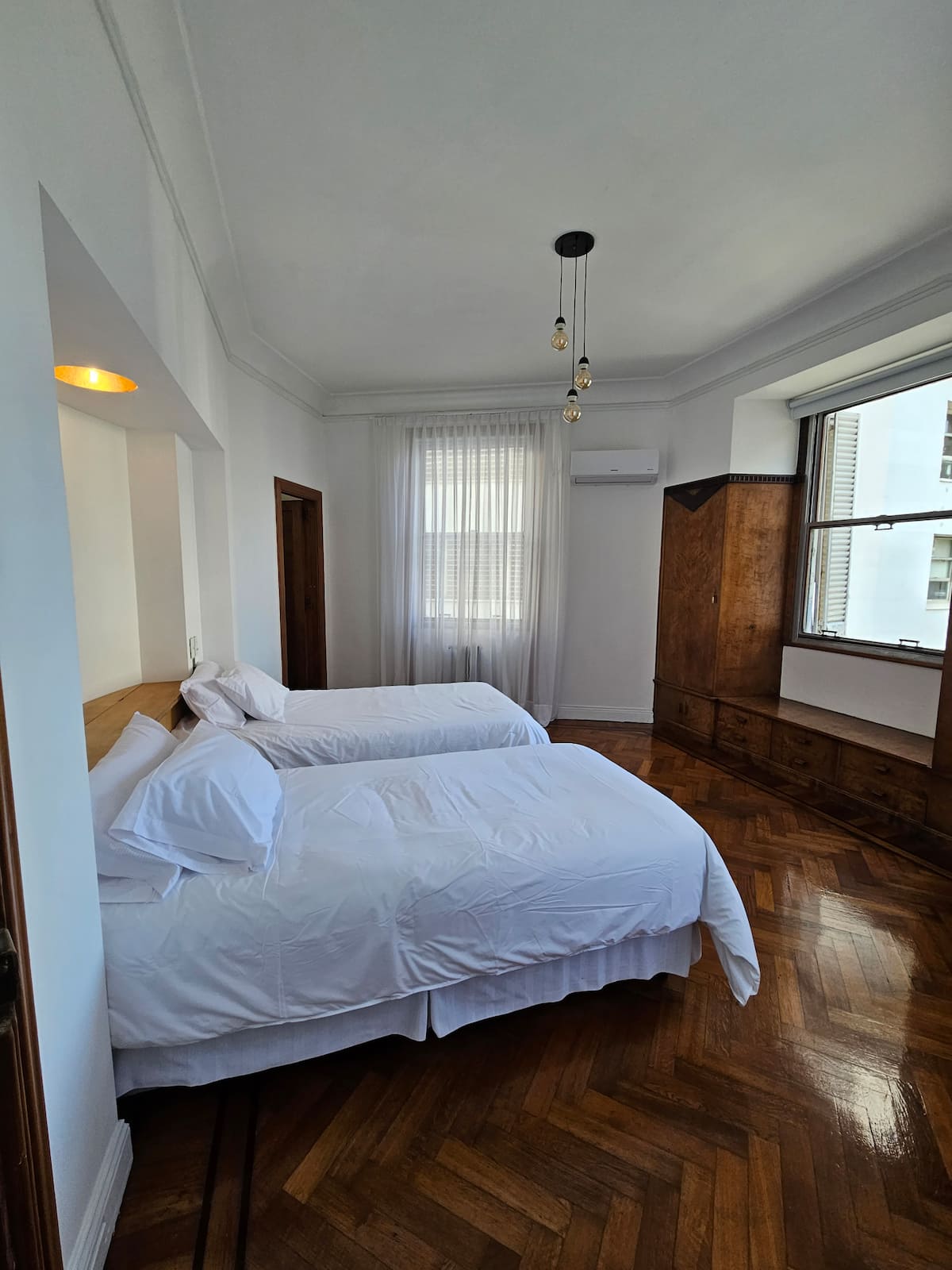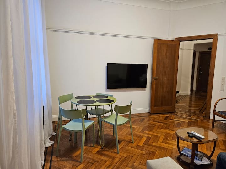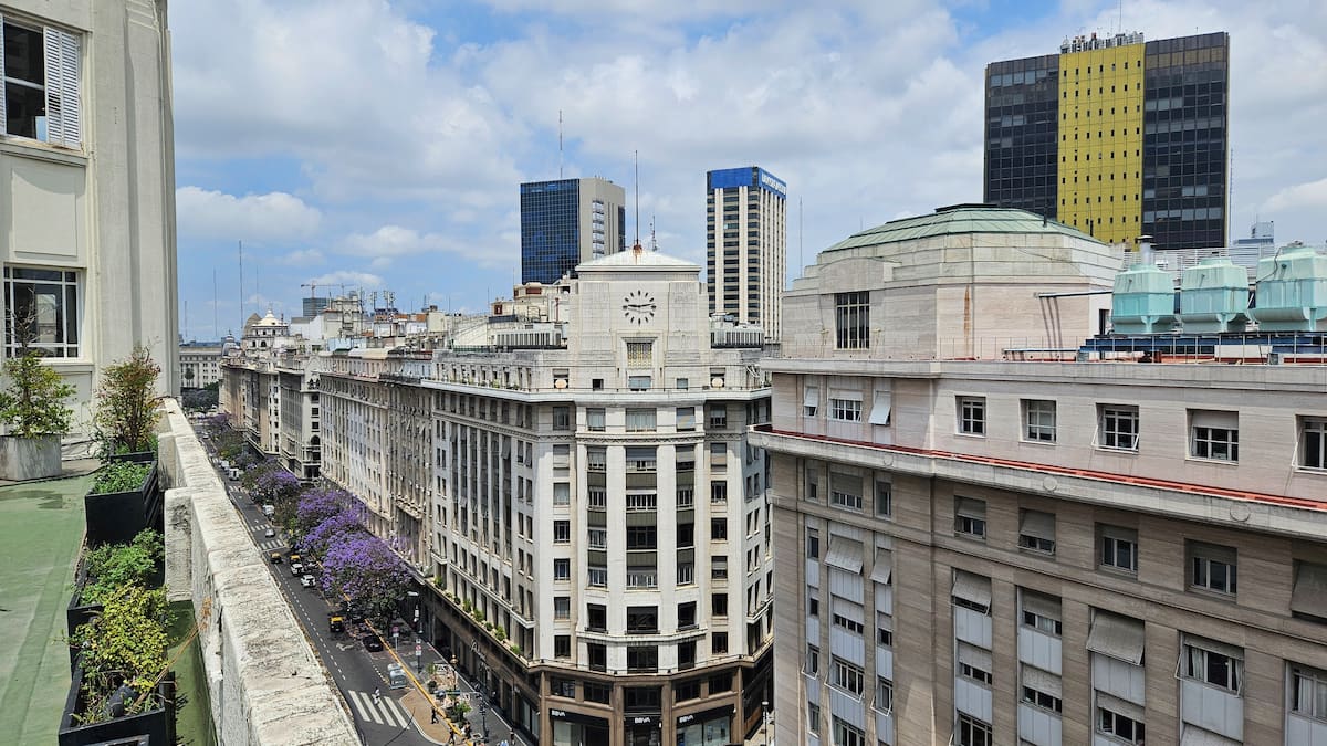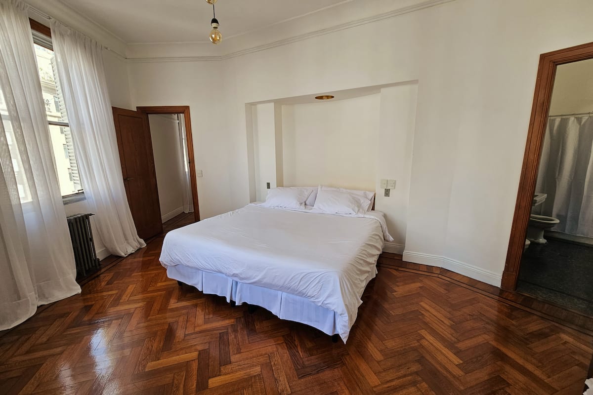 Departamento de 2 ambientes en un edificio de época en el centro de Buenos Aires, de 1933. Cuenta con techos altos y pisos de madera. Ventanales grandes con vista a la Av. Roque Sáenz Peña y al recorrido hacia Plaza de Mayo. Fue reciclado durante varios meses con una restauración que respetó elementos originales.