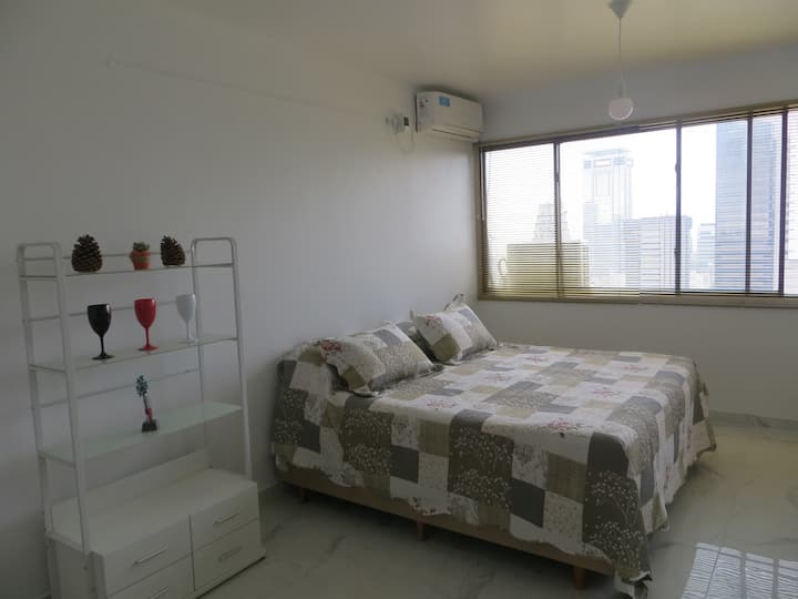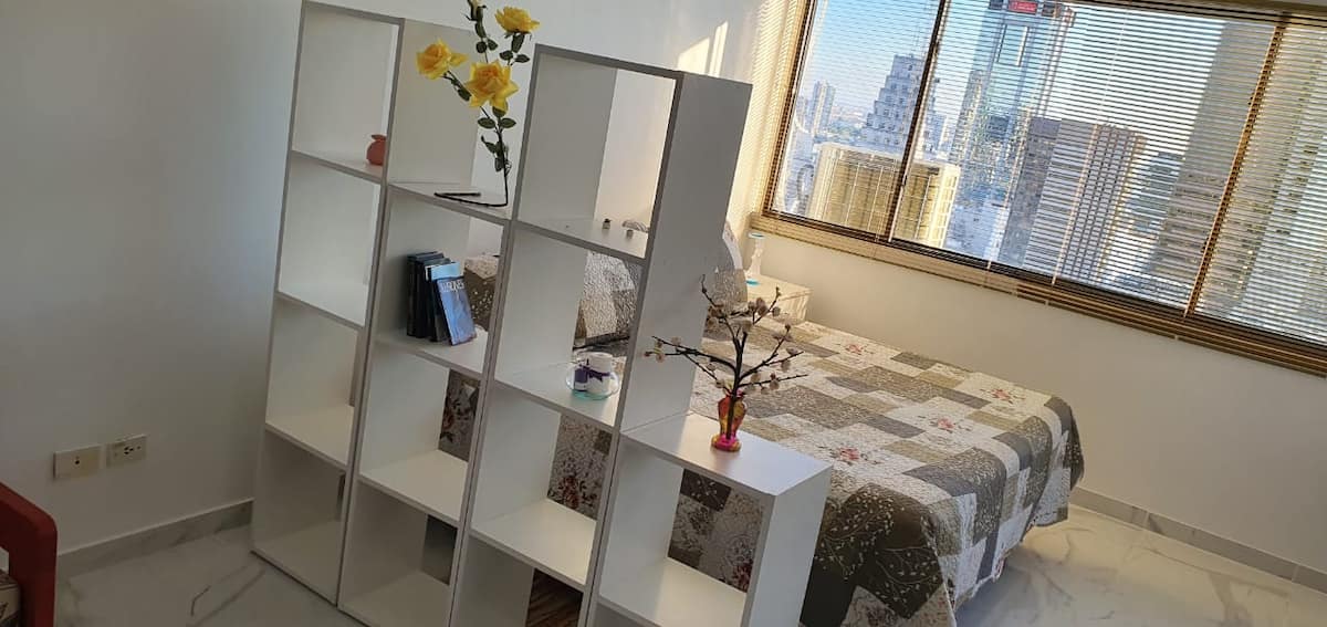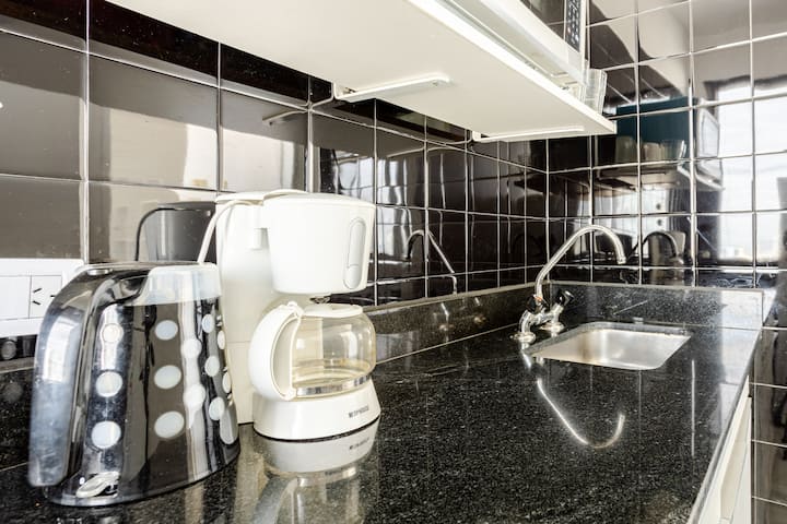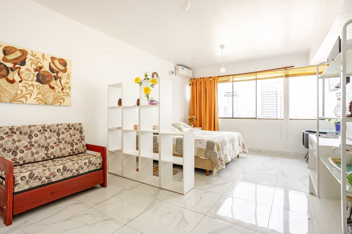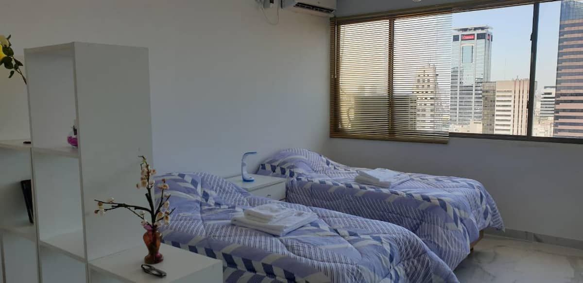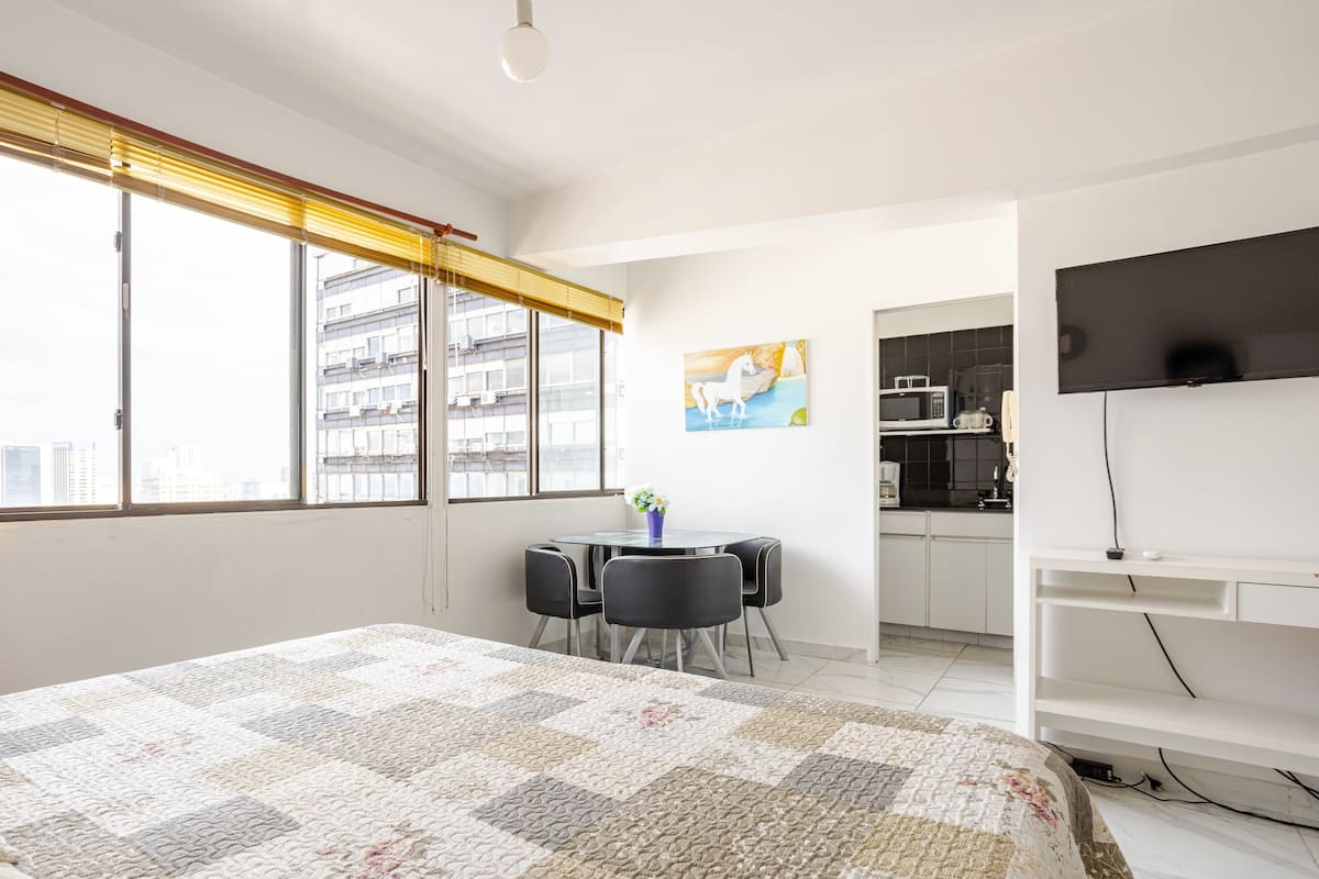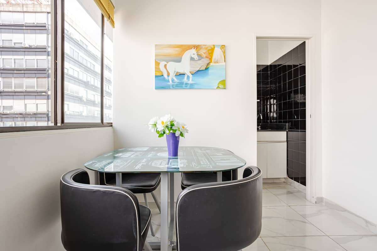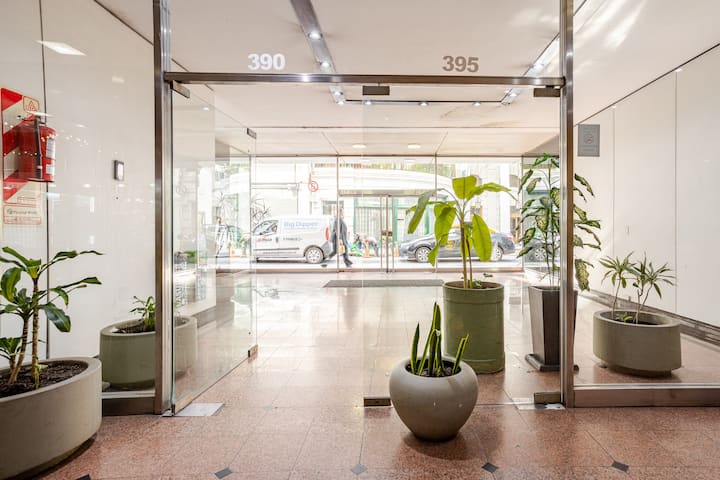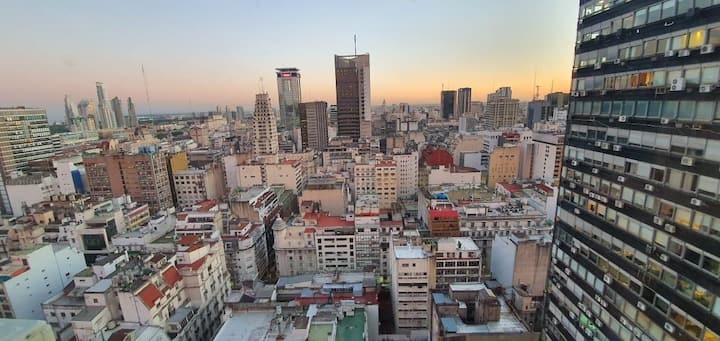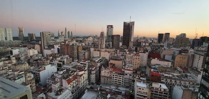 Departamento en el 24th piso, con vista abierta y ambiente muy luminoso. Cuenta con aire acondicionado y calefacción central. Incluye TV con señal por cable, internet, microondas, heladera con freezer, tostadora, cafetera, pava eléctrica, secador de pelo, vajilla completa, plancha y tendedero, además de sábanas y toallas. El edificio dispone de seguridad 24 horas; está a 5 cuadras de Puerto Madero.