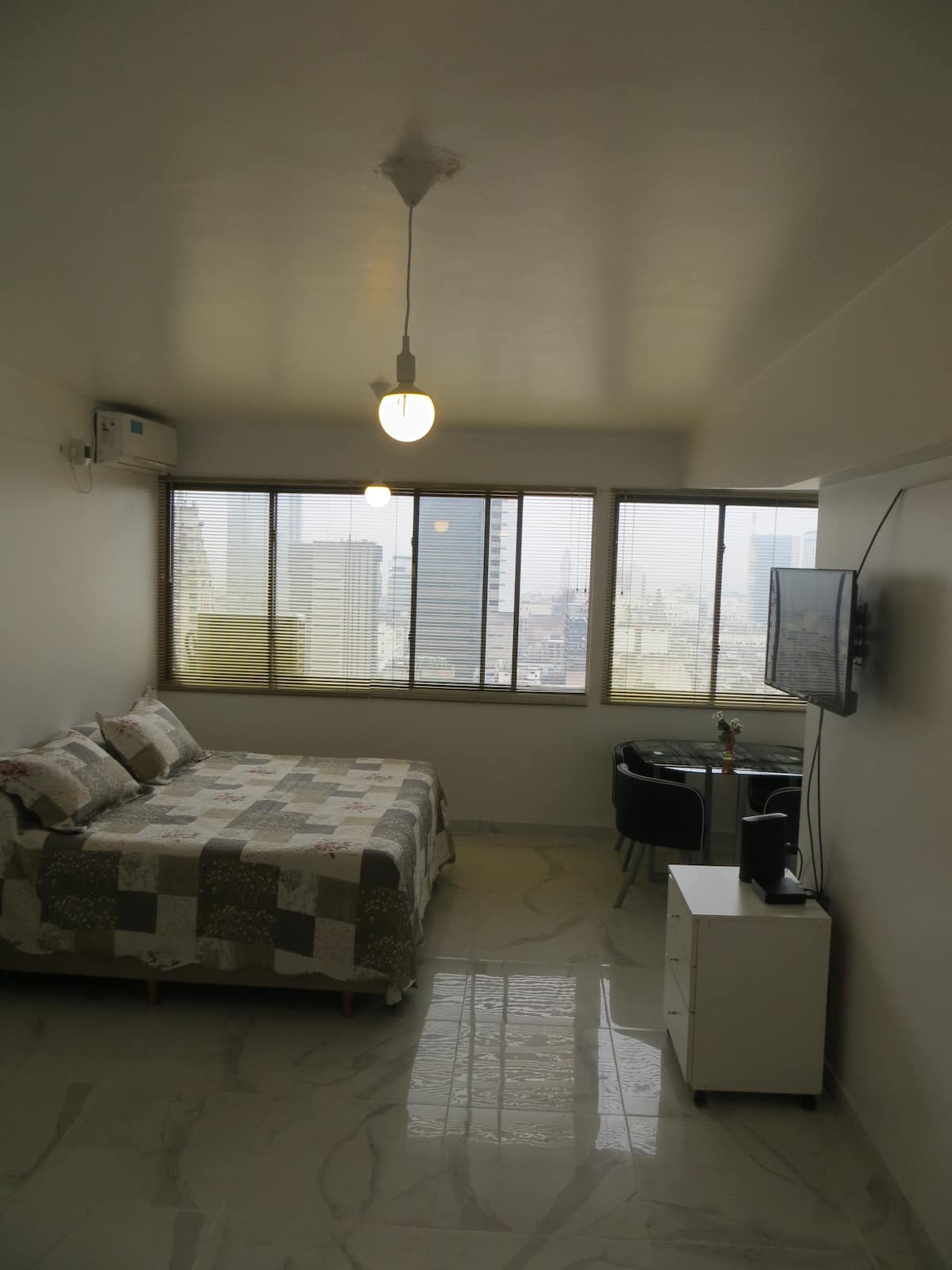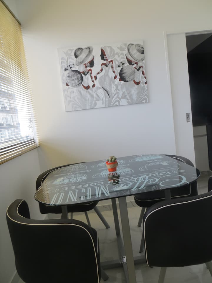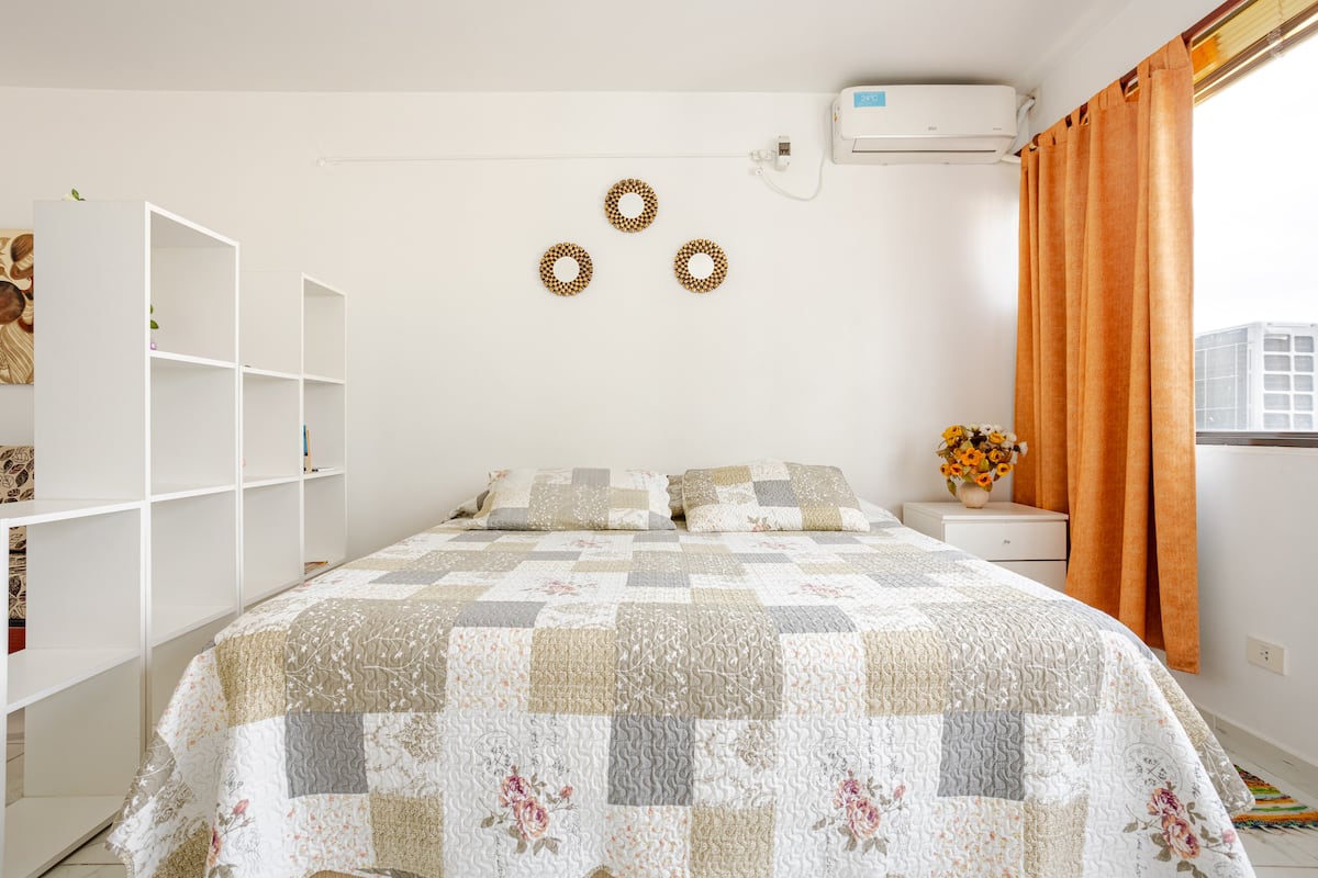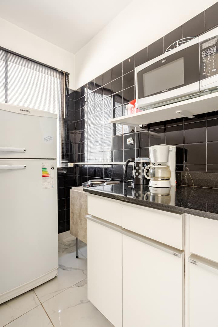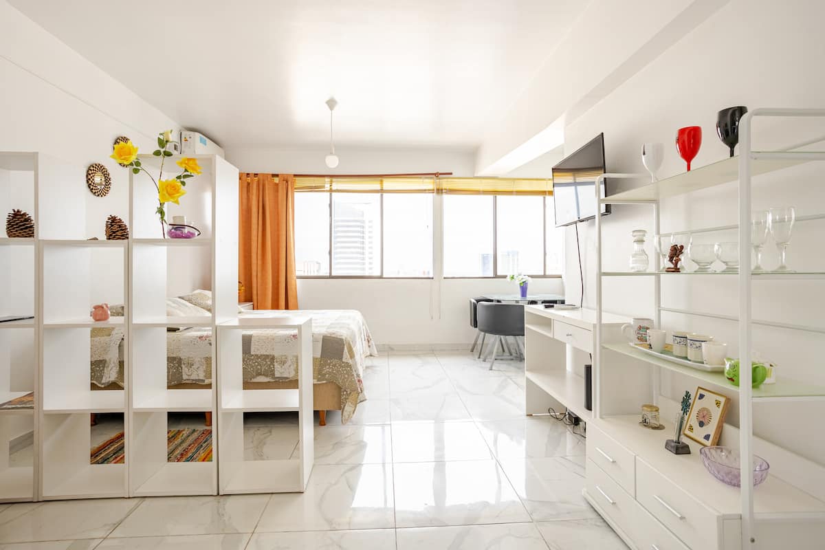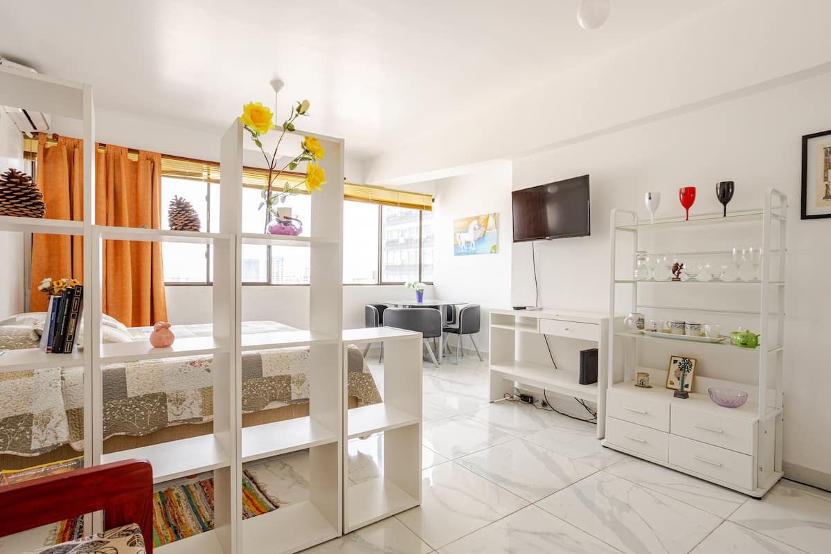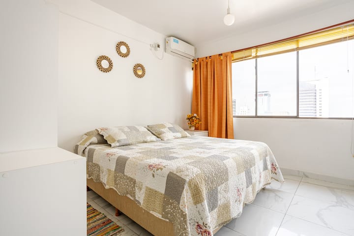 Departamento en el 24th piso, con vista abierta y ambiente muy luminoso. Cuenta con aire acondicionado y calefacción central. Incluye TV con señal por cable, internet, microondas, heladera con freezer, tostadora, cafetera, pava eléctrica, secador de pelo, vajilla completa, plancha y tendedero, además de sábanas y toallas. El edificio dispone de seguridad 24 horas; está a 5 cuadras de Puerto Madero.