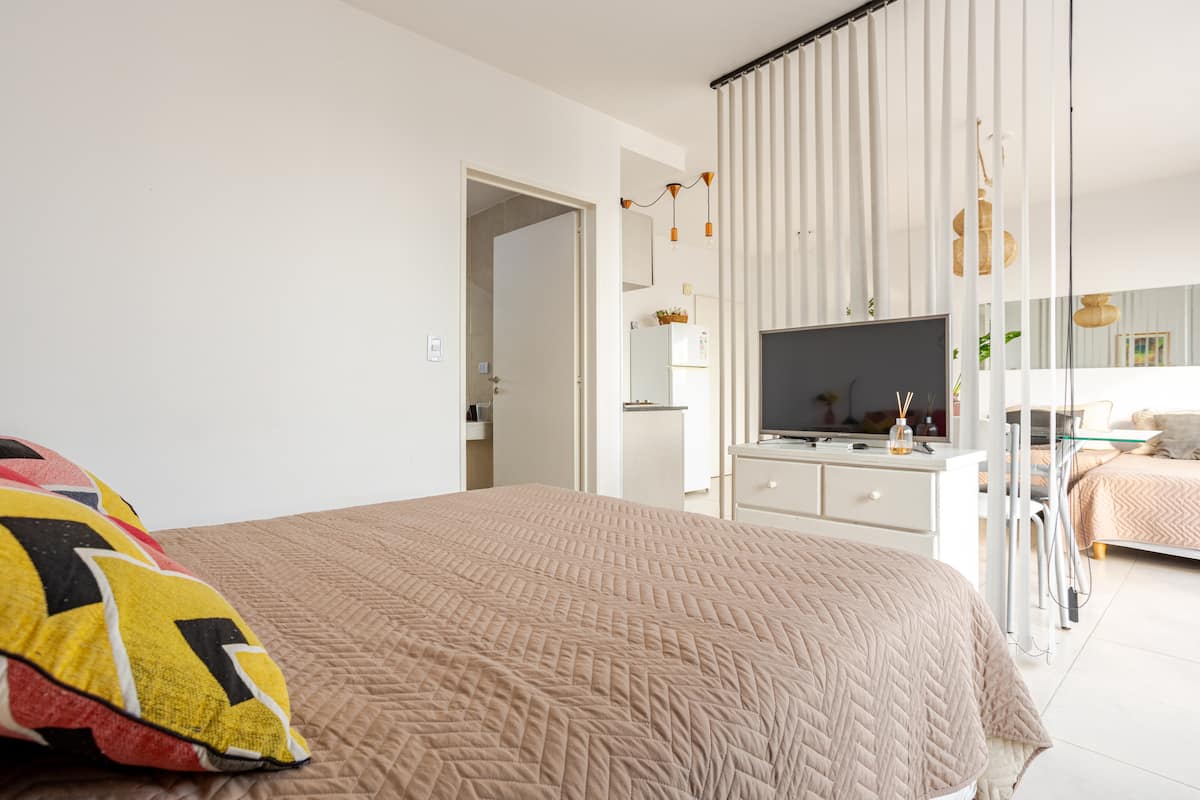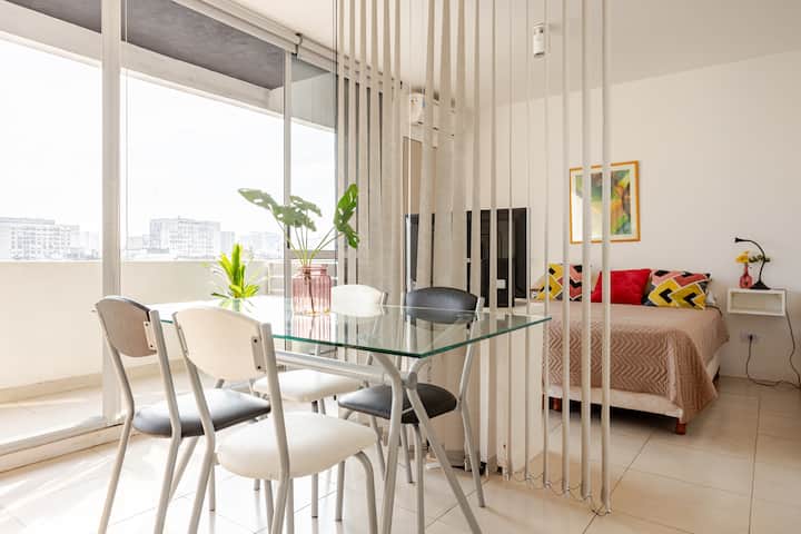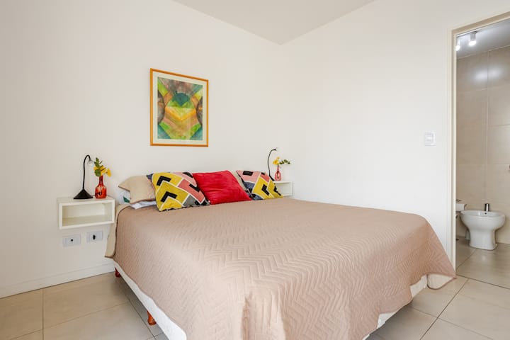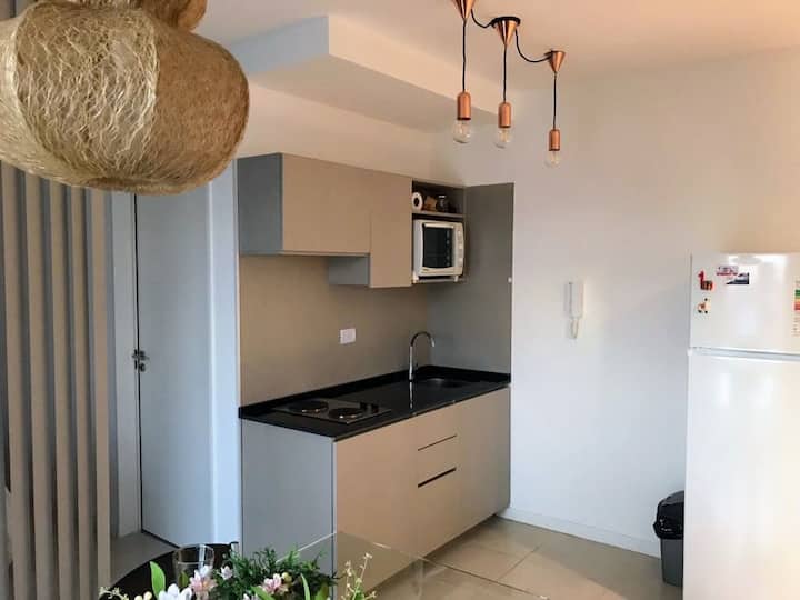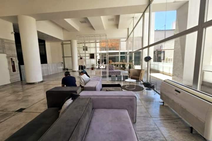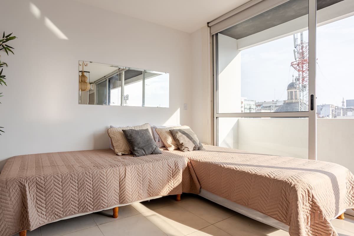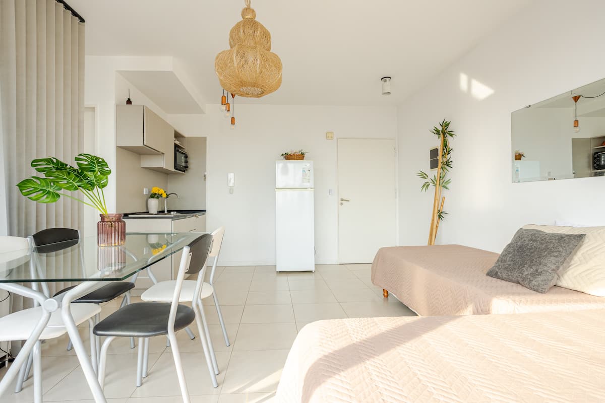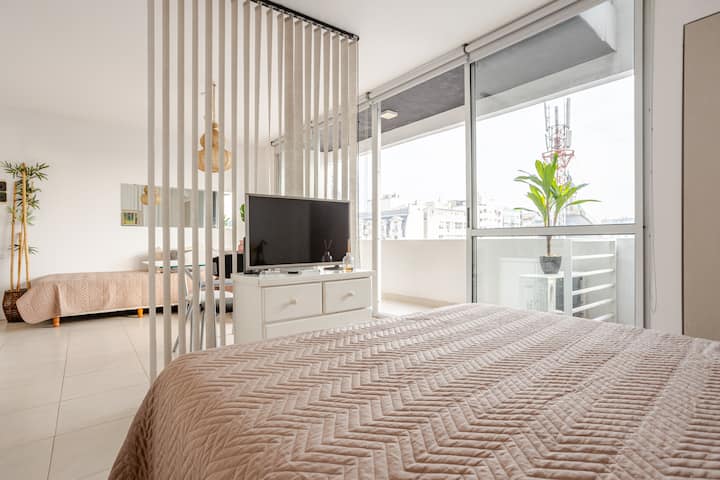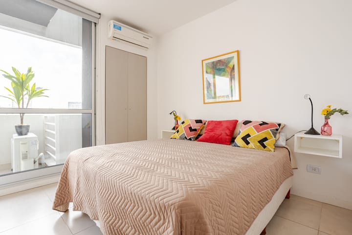 Departamento de 1 dormitorio en un piso 11 con vista abierta a edificios de Buenos Aires. Se ofrece amoblado y cuenta con cocina integrada equipada con anafe, microondas, heladera y utensilios de cocina. Dispone de lavadero con lavarropas y baño con ducha, bidet y toilettes, además de TV de pantalla plana. El edificio tiene laundry, recepción en el lobby, seguridad 24 h, 4 ascensores, pileta, solárium y parrillas, SUM, gimnasio, restaurante o bar y galería de arte.