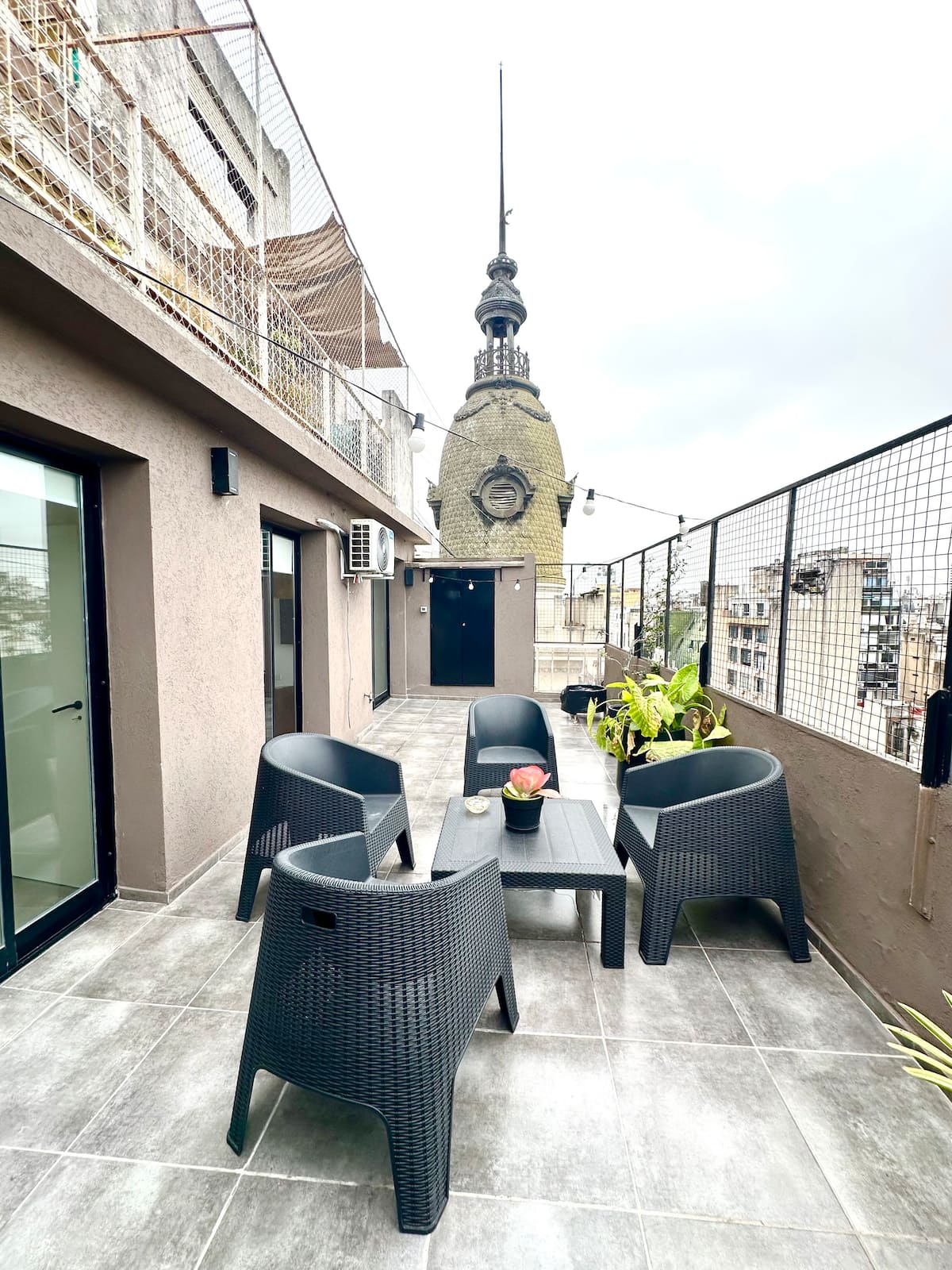 Departamento en San Nicolás con 1 dormitorio y terraza privada con vista a la ciudad y a una cúpula histórica. Se encuentra sobre la Av. Corrientes. El entorno incluye teatros y restaurantes, con acceso al subte y al transporte público.