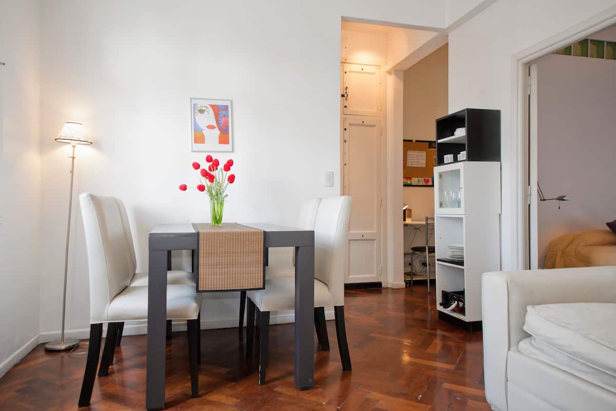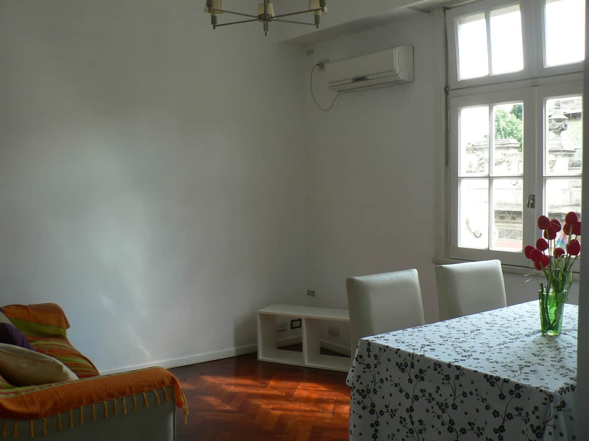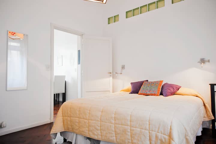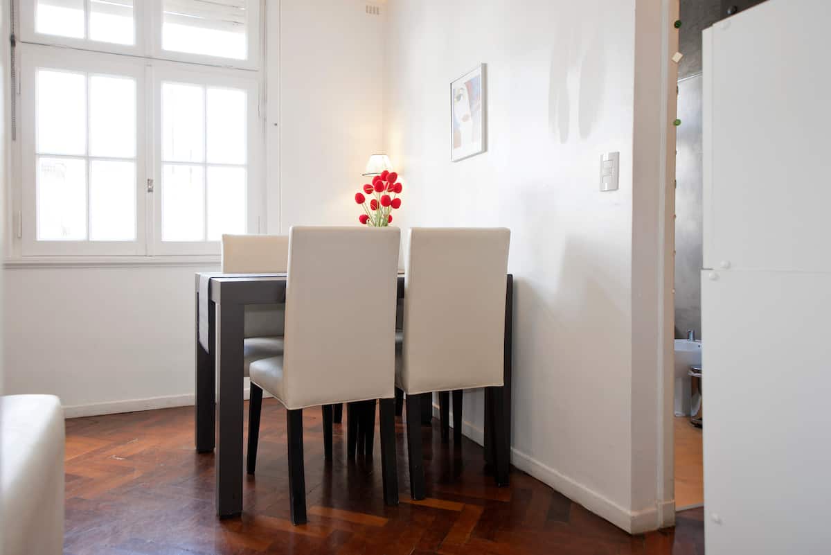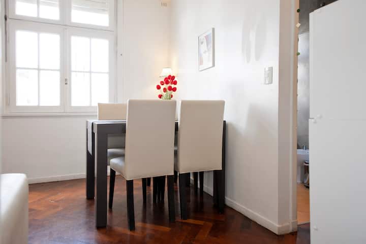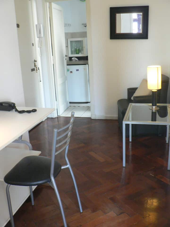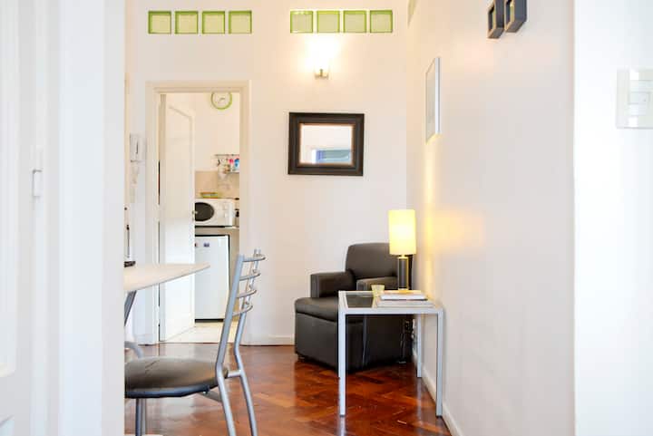 Departamento en San Telmo, con dormitorio interno y vista a la calle desde el living. Cuenta con cocina equipada con microondas, licuadora, cocina, tostadora y cafetera, baño con bañera y placard. Incluye Wi-Fi, escritorio y sector de lectura, y el dormitorio tiene 1 cama doble o 2 camas simples. Está cerca de la estación Independencia y de Av. 9 de Julio, y a pocos minutos a pie de Plaza de Mayo, Av. Florida, Obelisco y Puerto Madero. El servicio de mucama es semanal y está incluido; el check-i