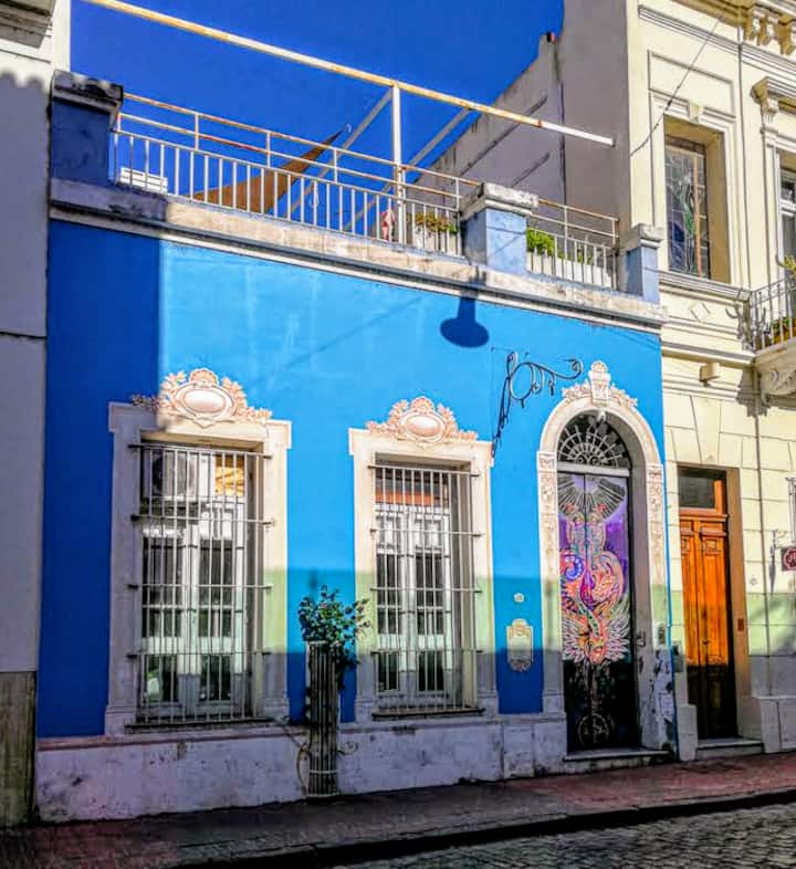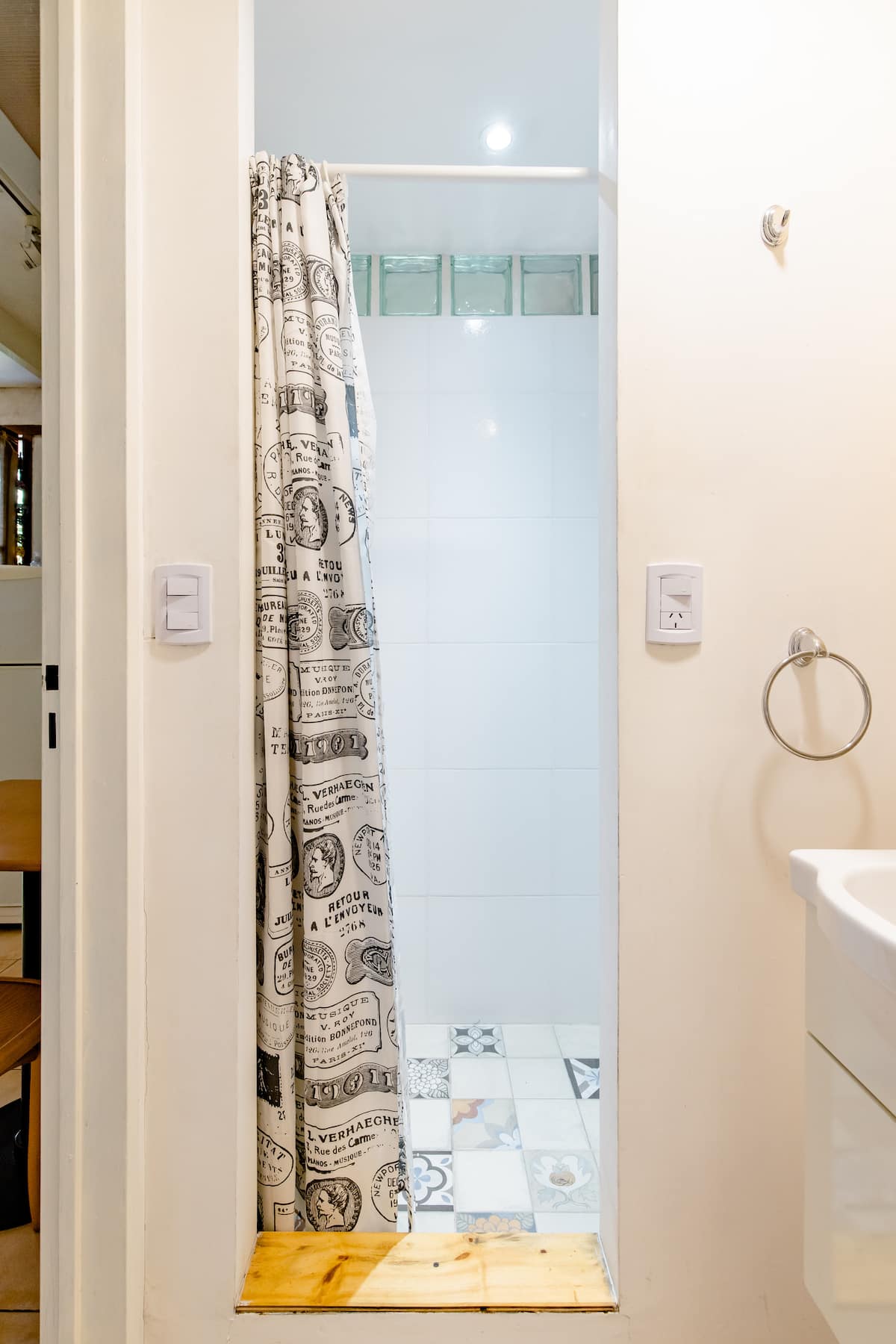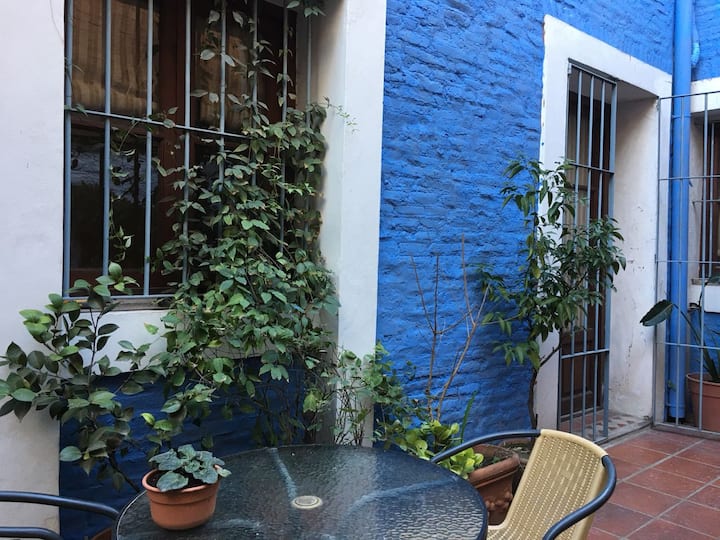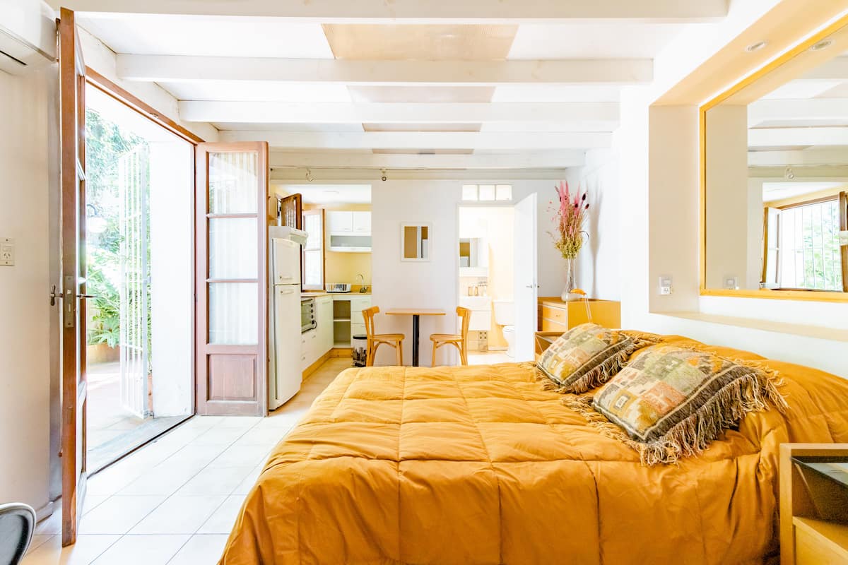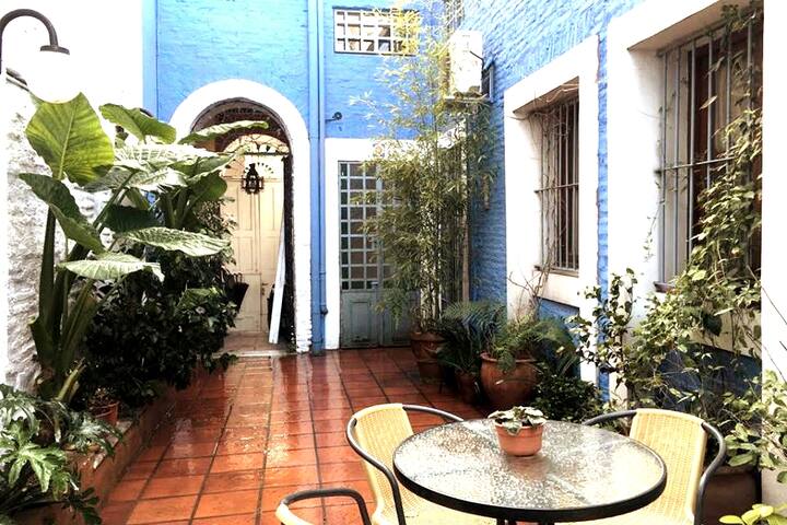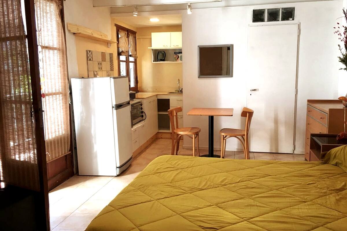 Departamento tipo mini en San Telmo para 2 personas, recientemente reciclado. Habitación con vista al patio, con ventilador, y entrada independiente. Baño privado con ducha y cocina completa con microondas, horno eléctrico y anafe, heladera, tostadora, pava eléctrica y cafetera. Incluye utensilios de comida y limpieza y WIFI. Se cobra $5 por día por el uso del aire acondicionado. No tiene servicio de lavandería ni de secado; no se permite colgar ropa en el patio.
