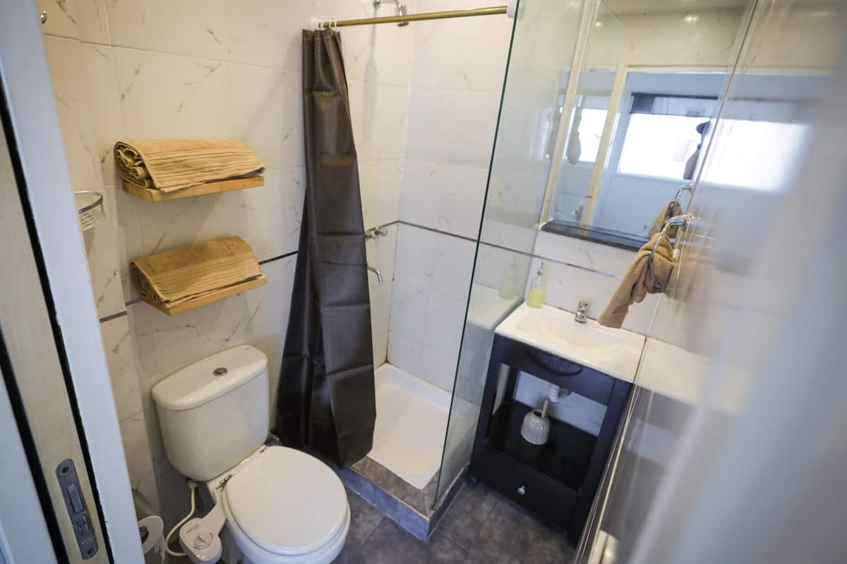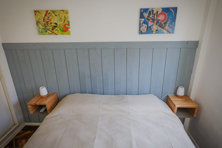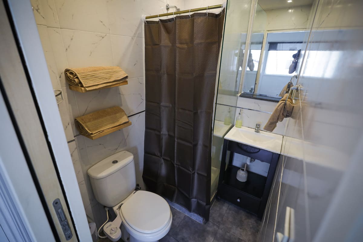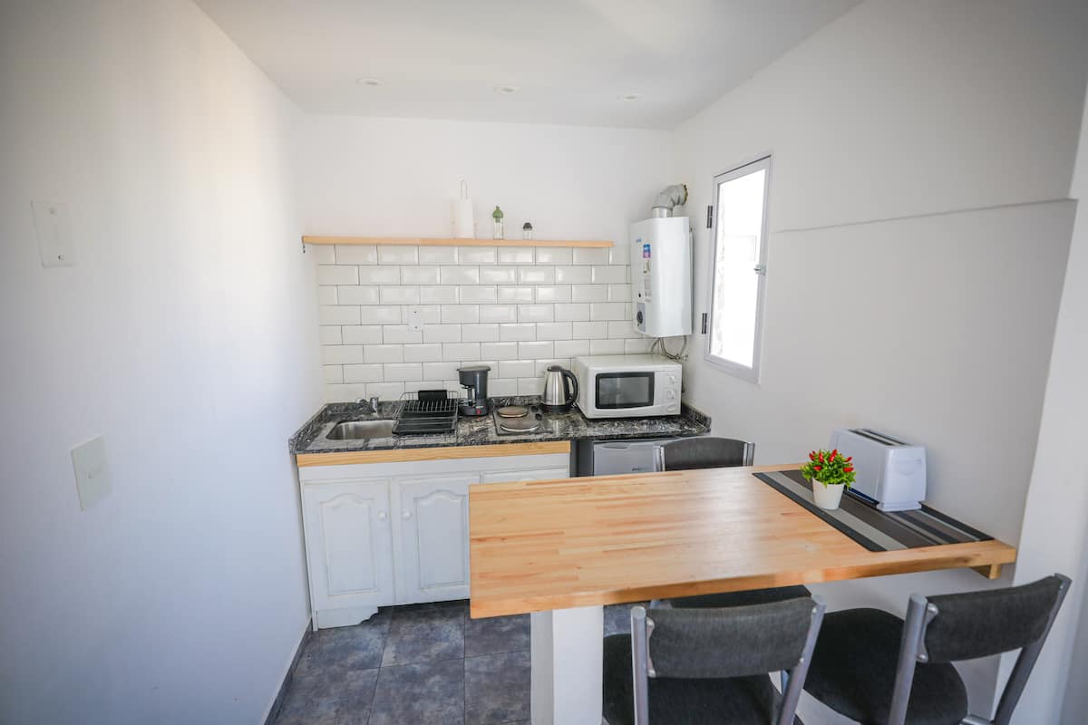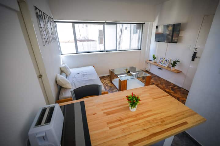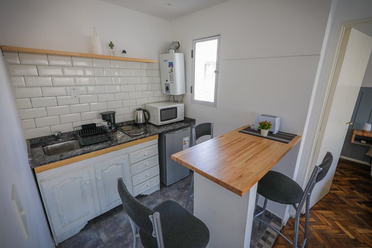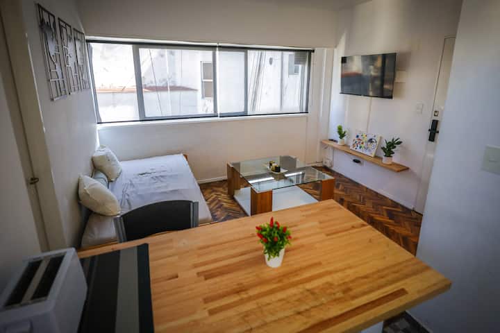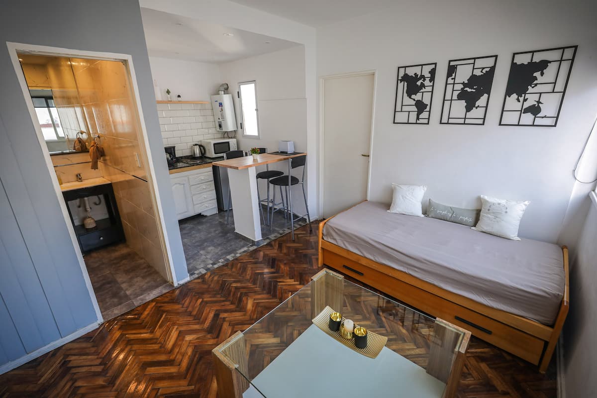 Квартира в San Telmo с 2 комнатами: гостиная-столовая и спальня. В гостиной есть диван-кровать, телевизор и окна, кухня объединена с зоной завтрака. Кухня оборудована микроволновой печью, холодильником, тостером, кофеваркой, электрическим чайником и плитой, в спальне двуспальная кровать и кондиционер. В ванной комнате установлен душ; полотенца включены.