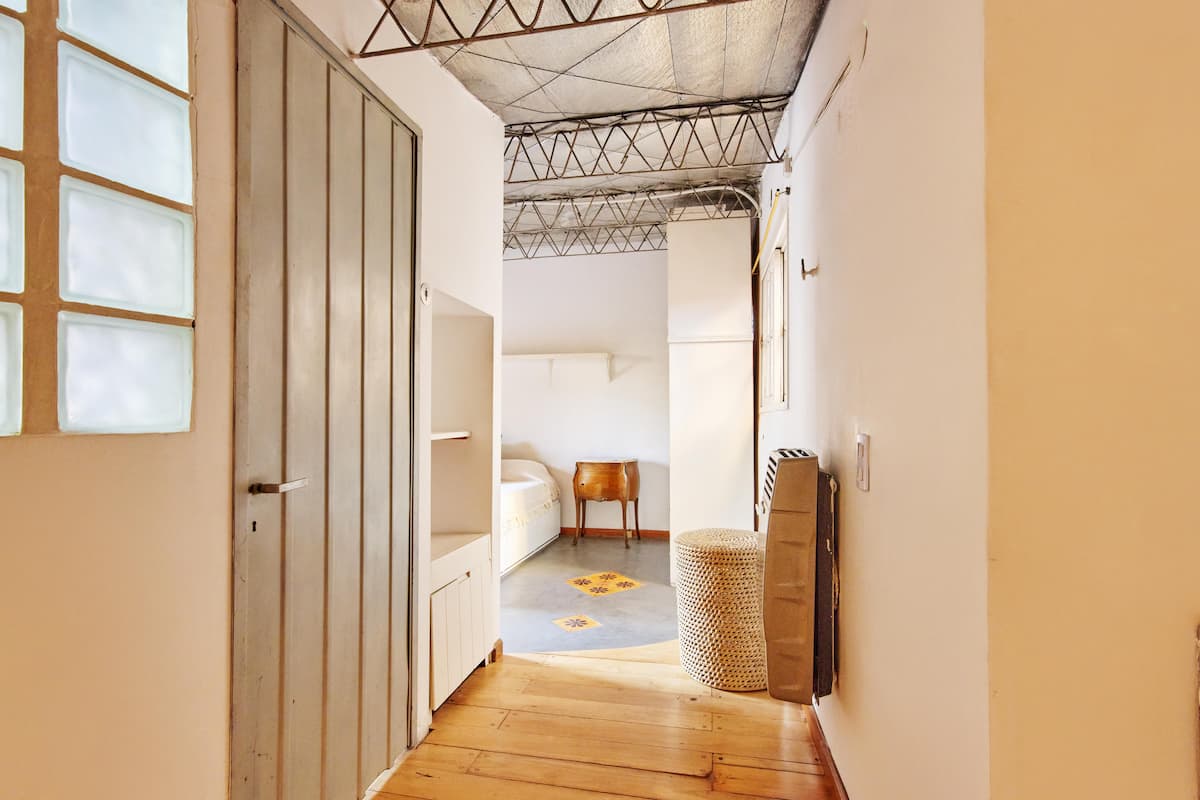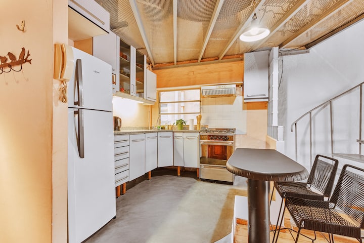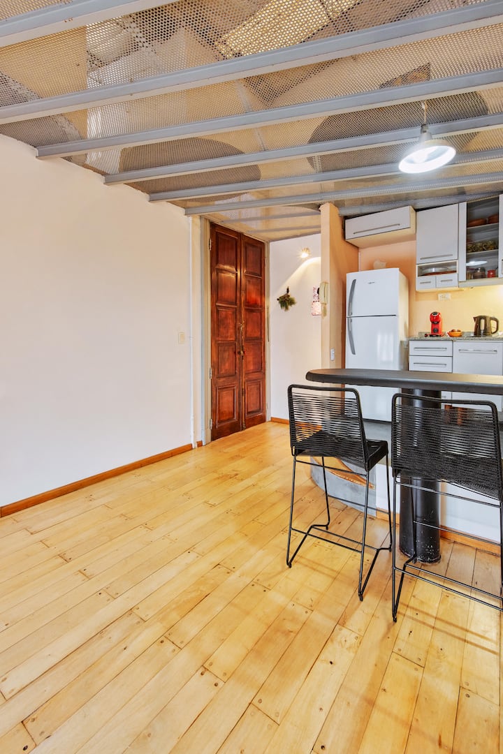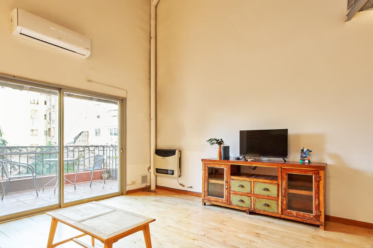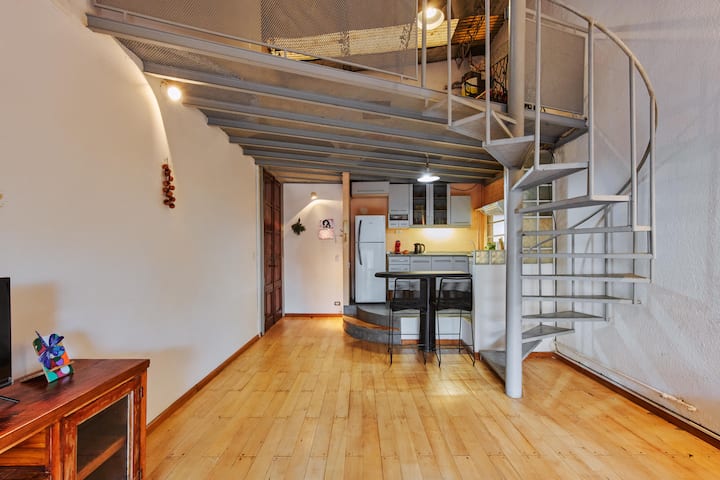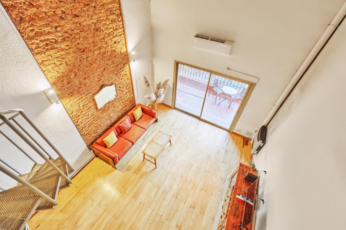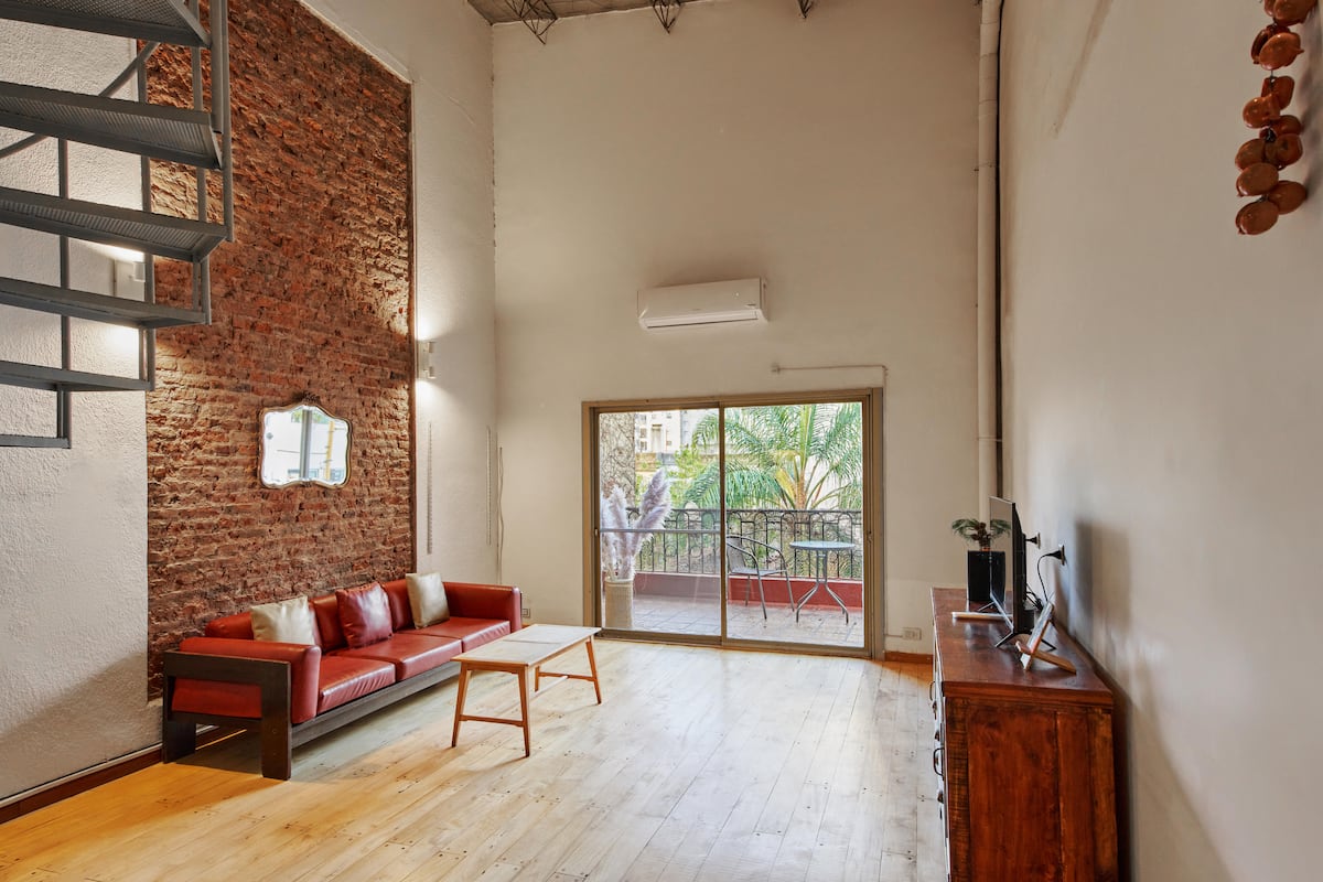 Loft em edifício reformado, de 1900, em San Telmo, com dois andares. No primeiro piso, cozinha no acesso, área com piso de madeira, sala com poltrona, plantas e televisão, além de varanda ampla com vista para o jardim. A escada espiral leva ao segundo piso, onde ficam área de escritório, banheiro e quarto. O apartamento funciona como unidade inteira.