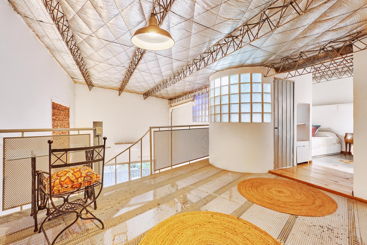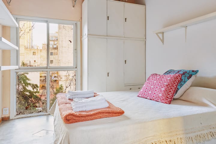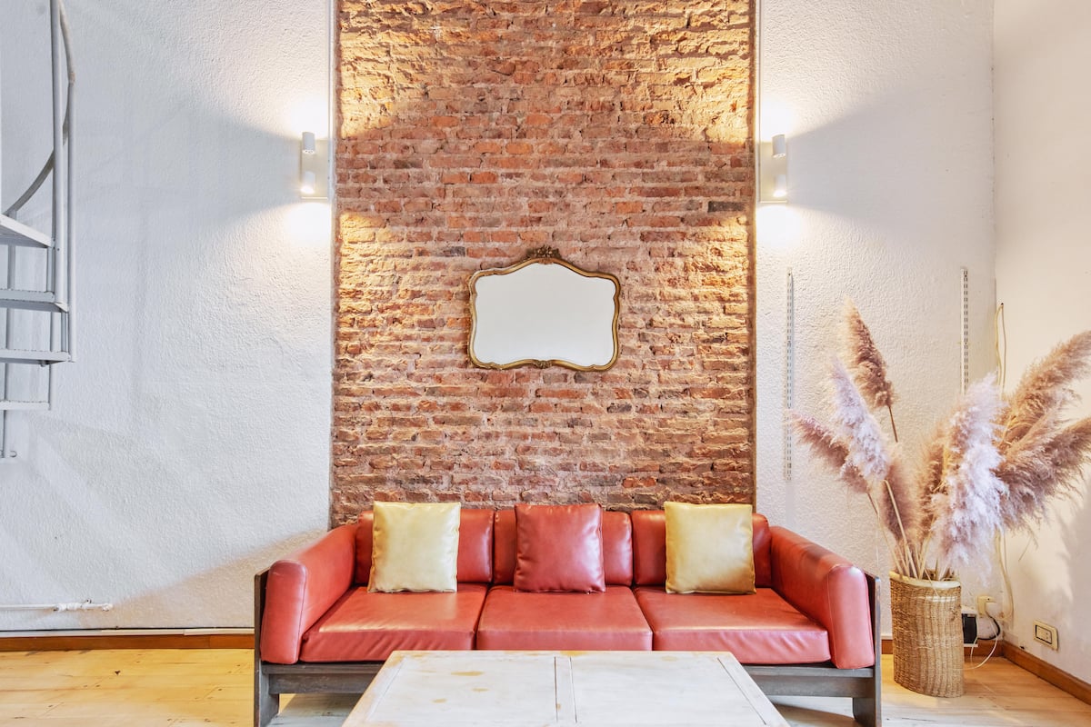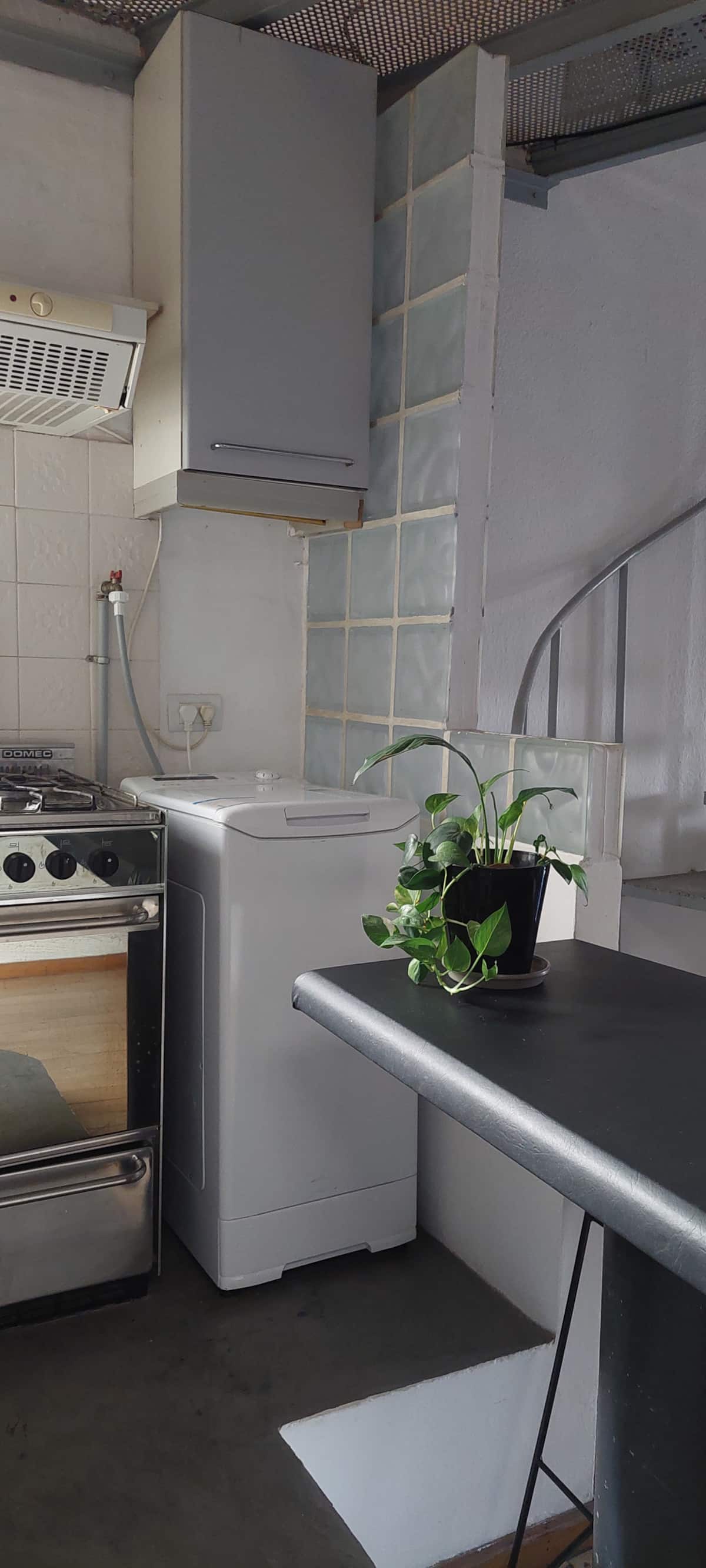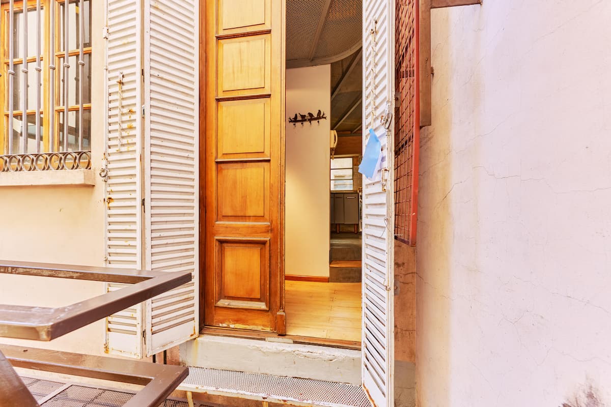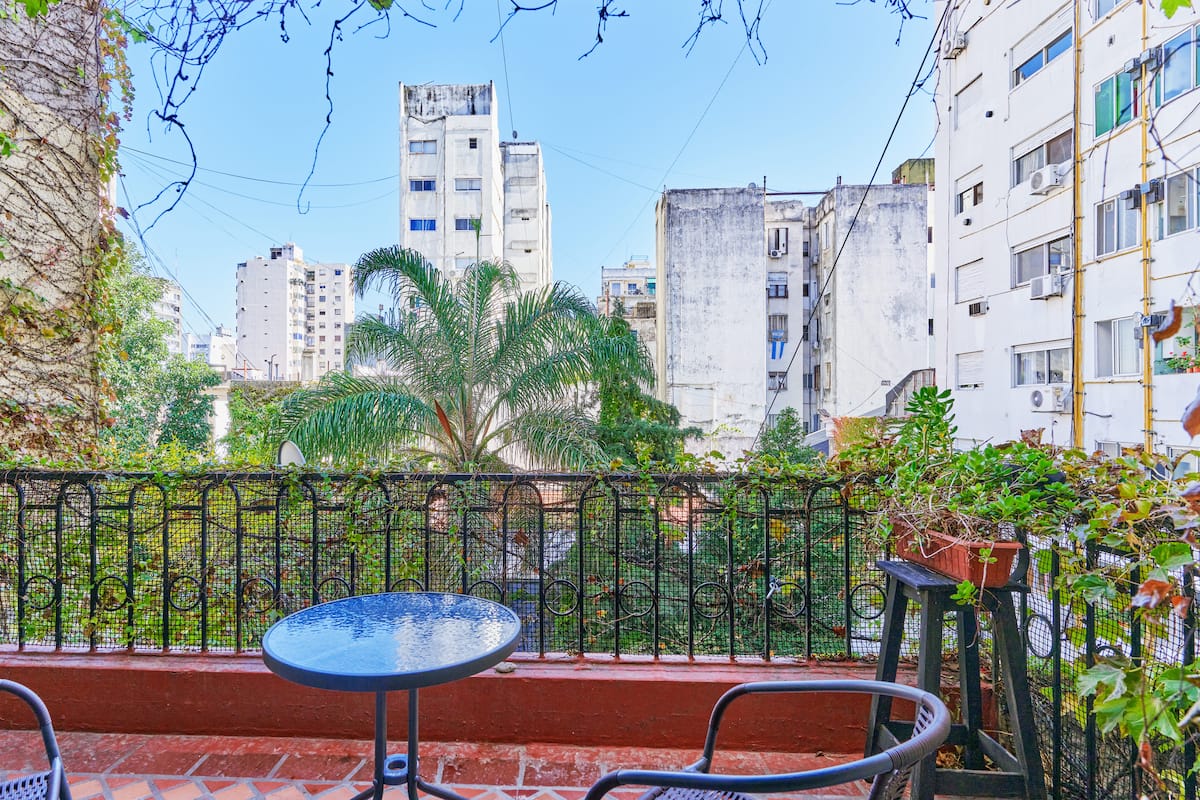 Loft em edifício reformado, de 1900, em San Telmo, com dois andares. No primeiro piso, cozinha no acesso, área com piso de madeira, sala com poltrona, plantas e televisão, além de varanda ampla com vista para o jardim. A escada espiral leva ao segundo piso, onde ficam área de escritório, banheiro e quarto. O apartamento funciona como unidade inteira.