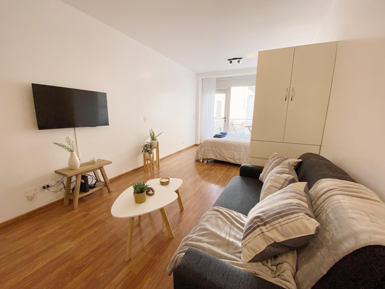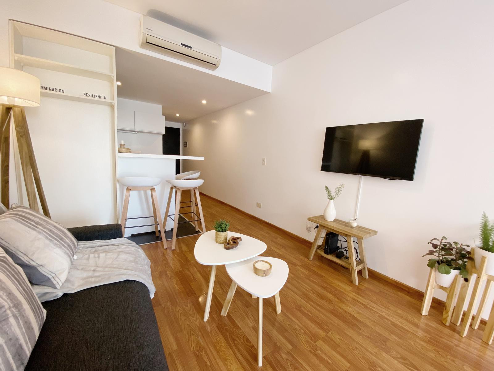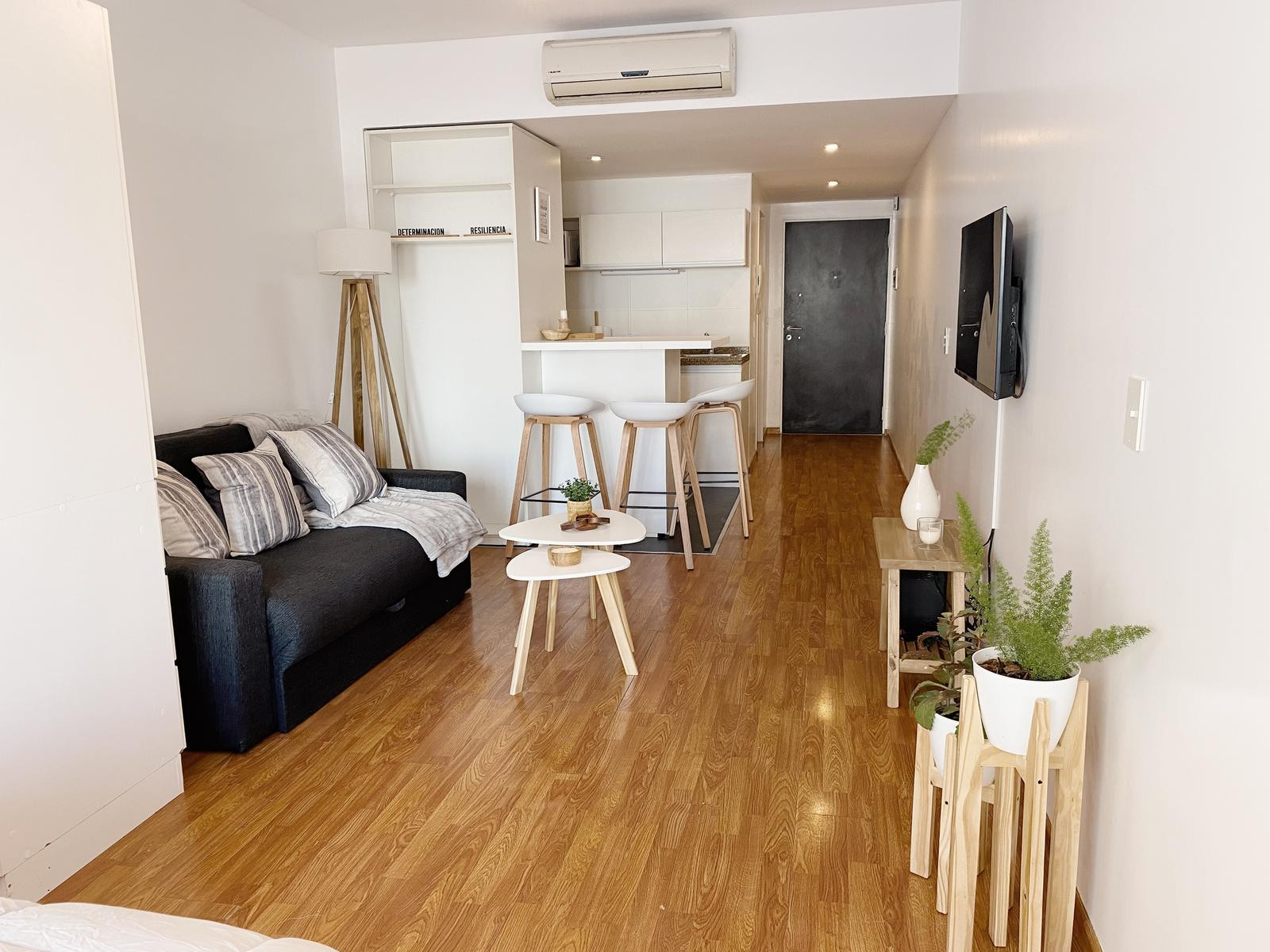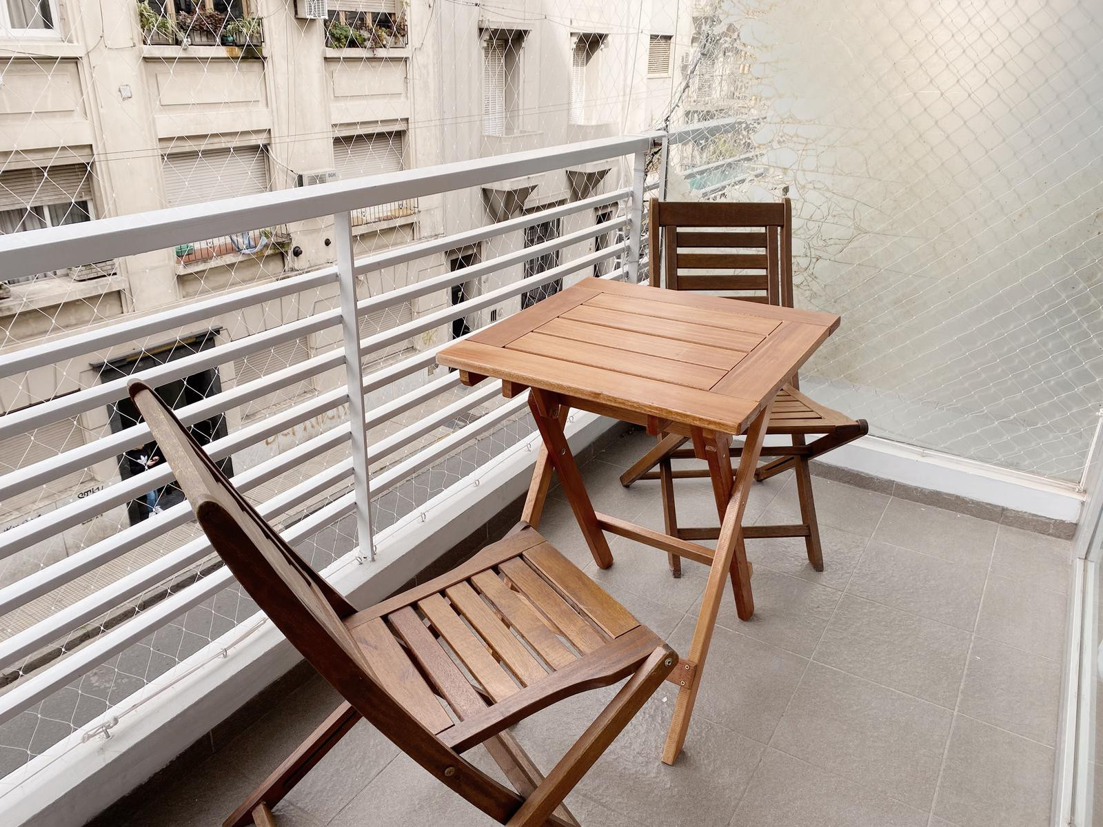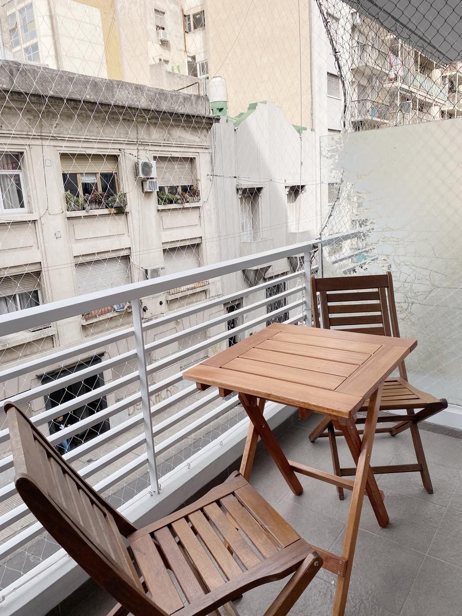 Departamento de 1 dormitorio amoblado, ubicado sobre la calle Chacabuco, a 3 cuadras de Av. 9 de Julio. Cuenta con balcón con sillas y mesita, gran ventanal y aire acondicionado frío/calor. La cocina está equipada con cafetera, tostadora, pava eléctrica, microondas, heladera con freezer, horno y hornallas eléctricas; incluye vajilla y utensillos. La sala tiene sillón cama para un tercer huésped y Smart TV. El contrato requiere pago mensual de luz, ABL, Internet y expensas, cuyo total informado e